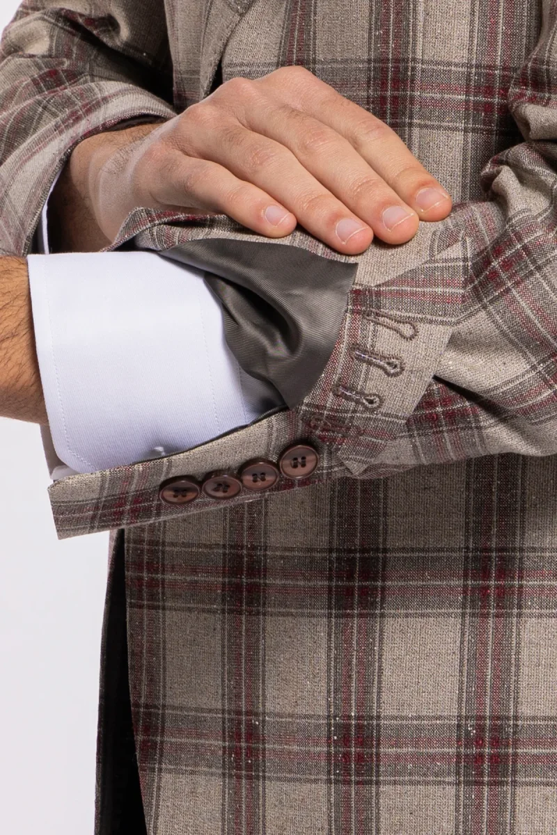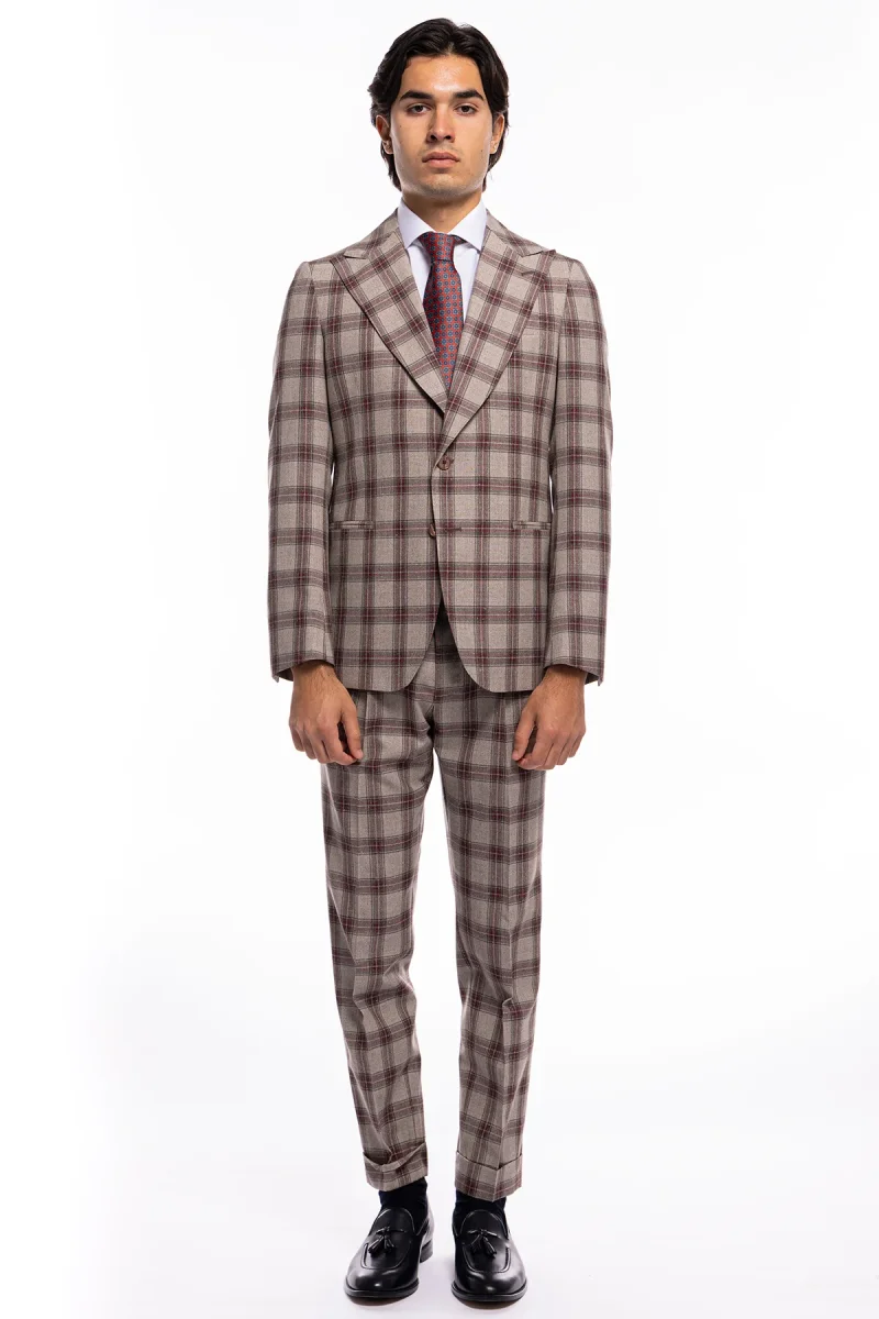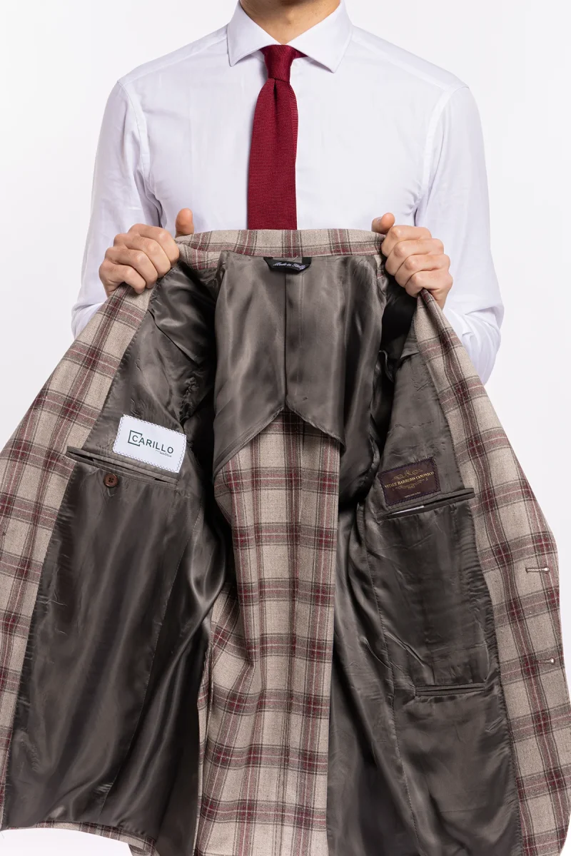 Abito uomo monopetto beige a quadri bordeaux in lana e seta – Vitale Barberis Canonico