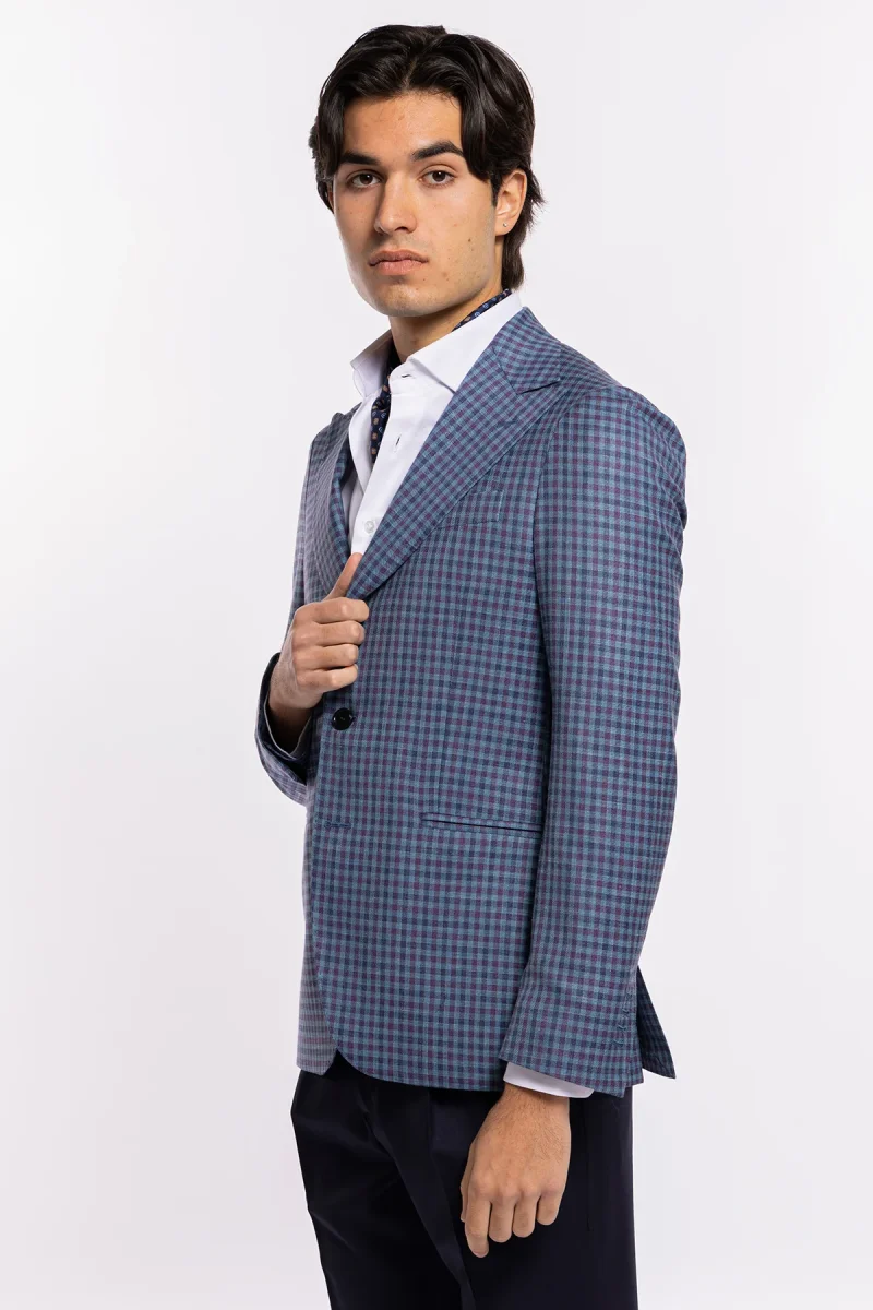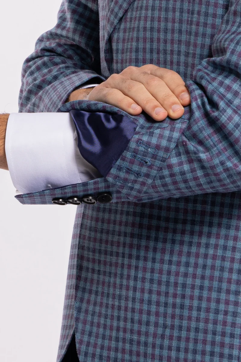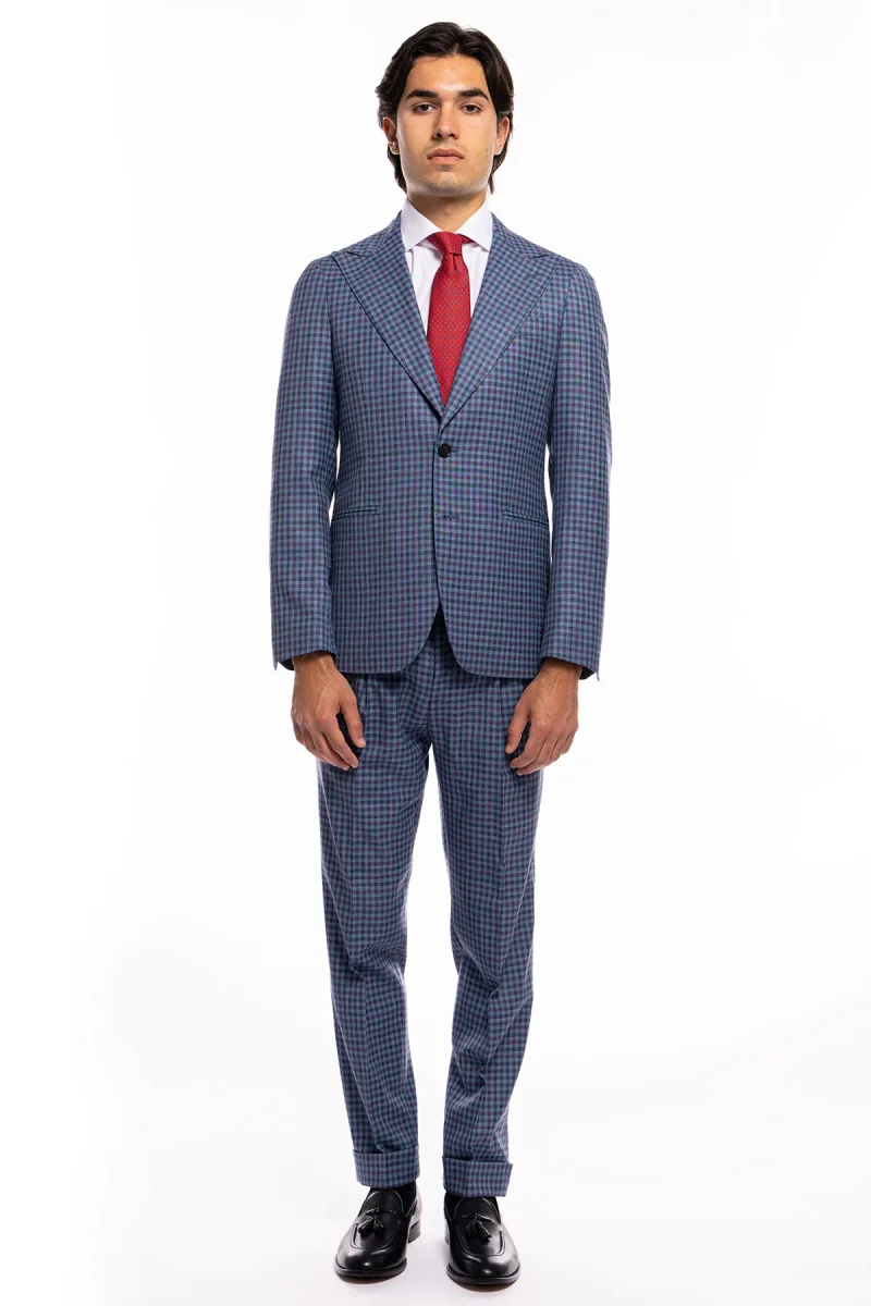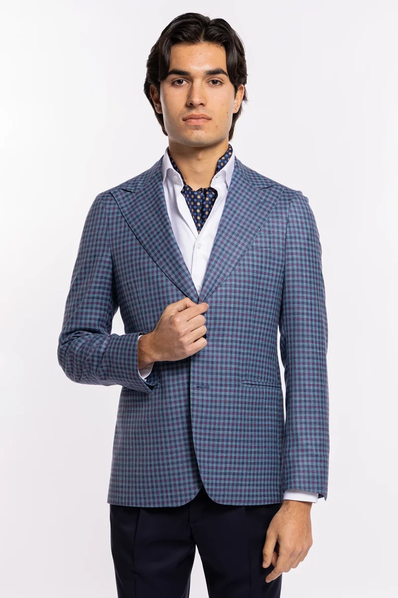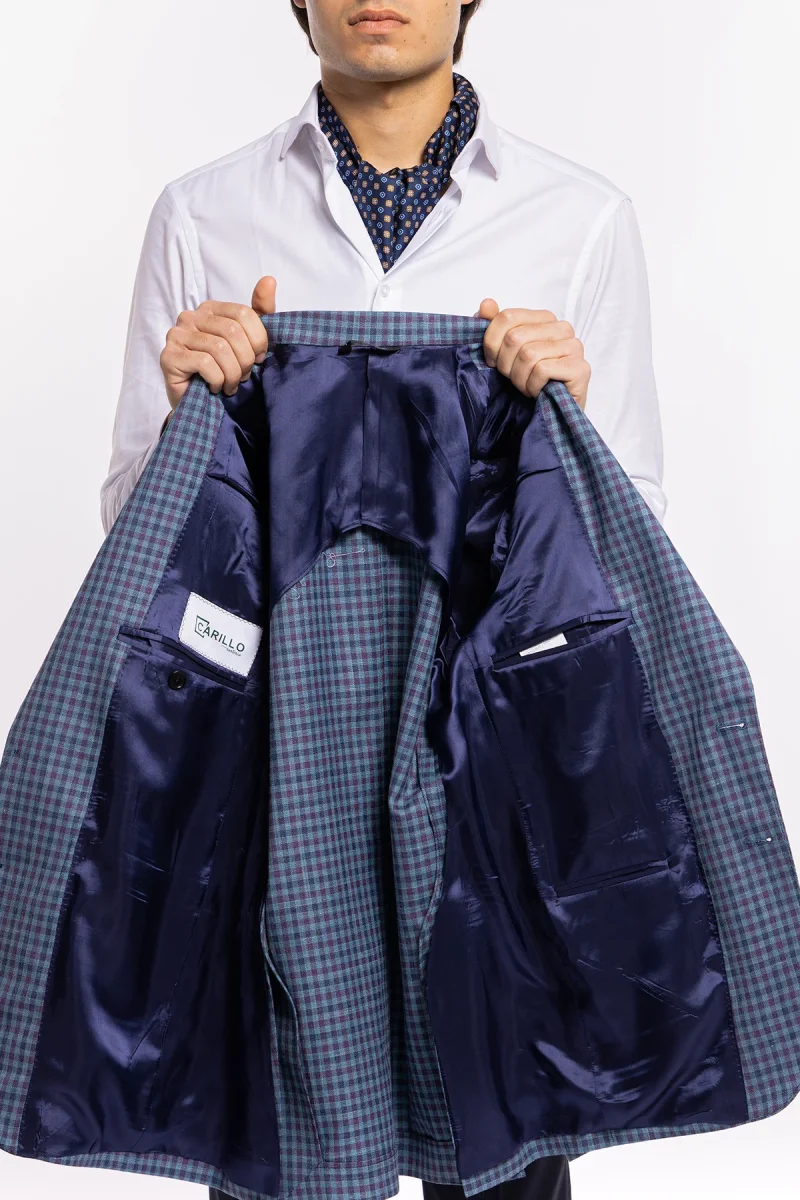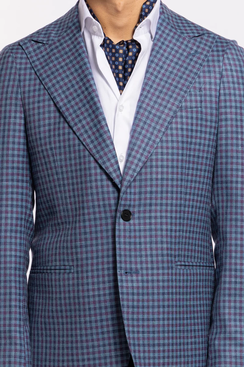Abito uomo monopetto blu denim quadri bordeaux in fresco lana, seta e lino – Bristol Tessuti