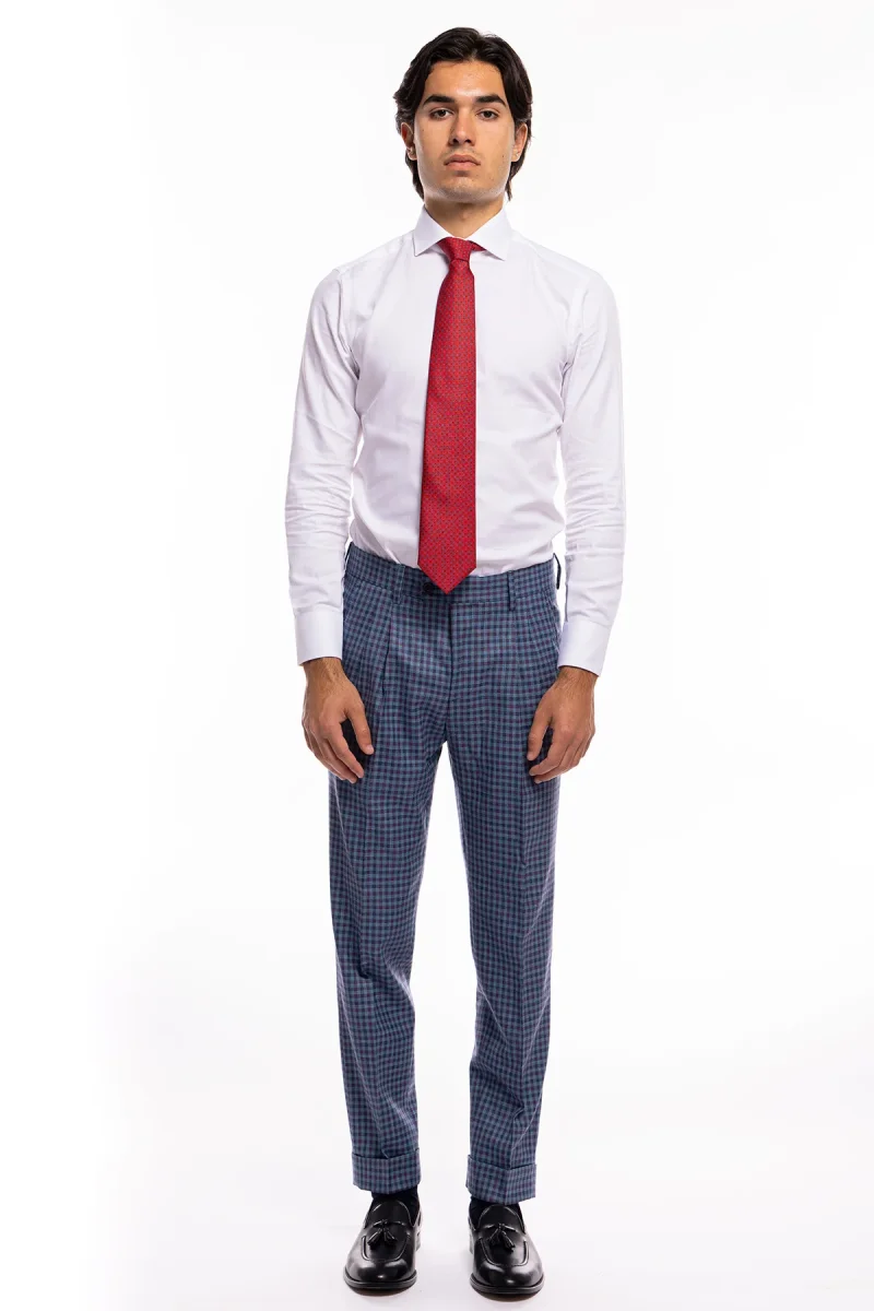 - Eleganza senza tempo: quadri bordeaux su base blu denim, per uno stile unico.