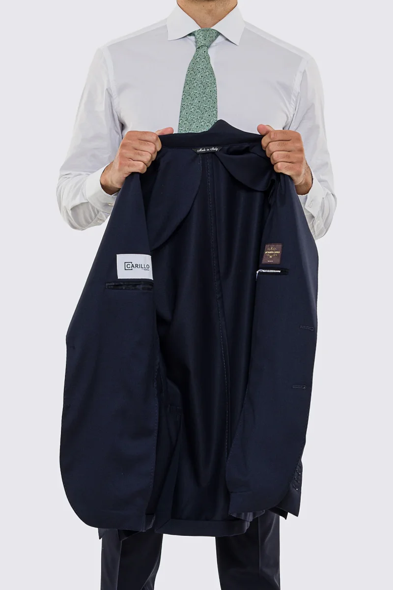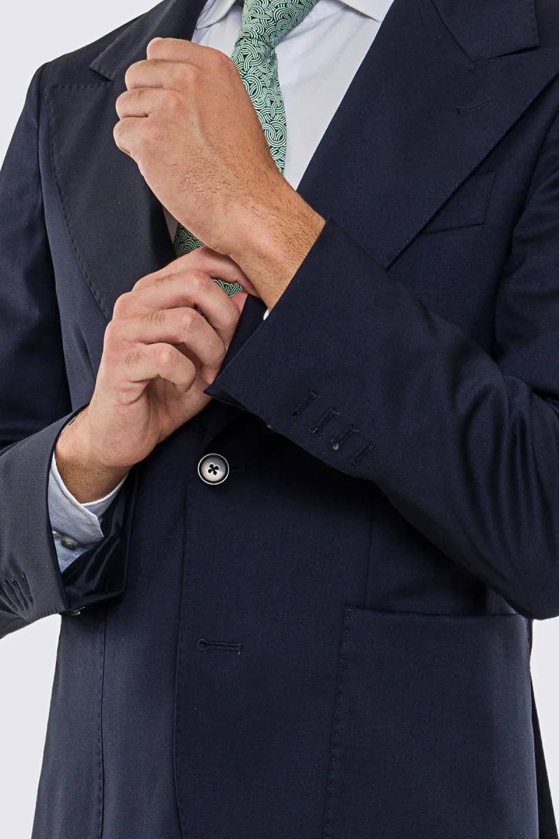 Scopri l’eleganza senza tempo della giacca uomo monopetto blu notte in fresco lana Super 130’s, un capo sartoriale di alta qualità realizzato con tessuti pregiati della rinomata tessitura Vitale Barberis Canonico. Questa giacca sfoderata offre una vestibilità slim fit, ideale per le stagioni primaverili e autunnali, combinando comfort e stile in ogni occasione.