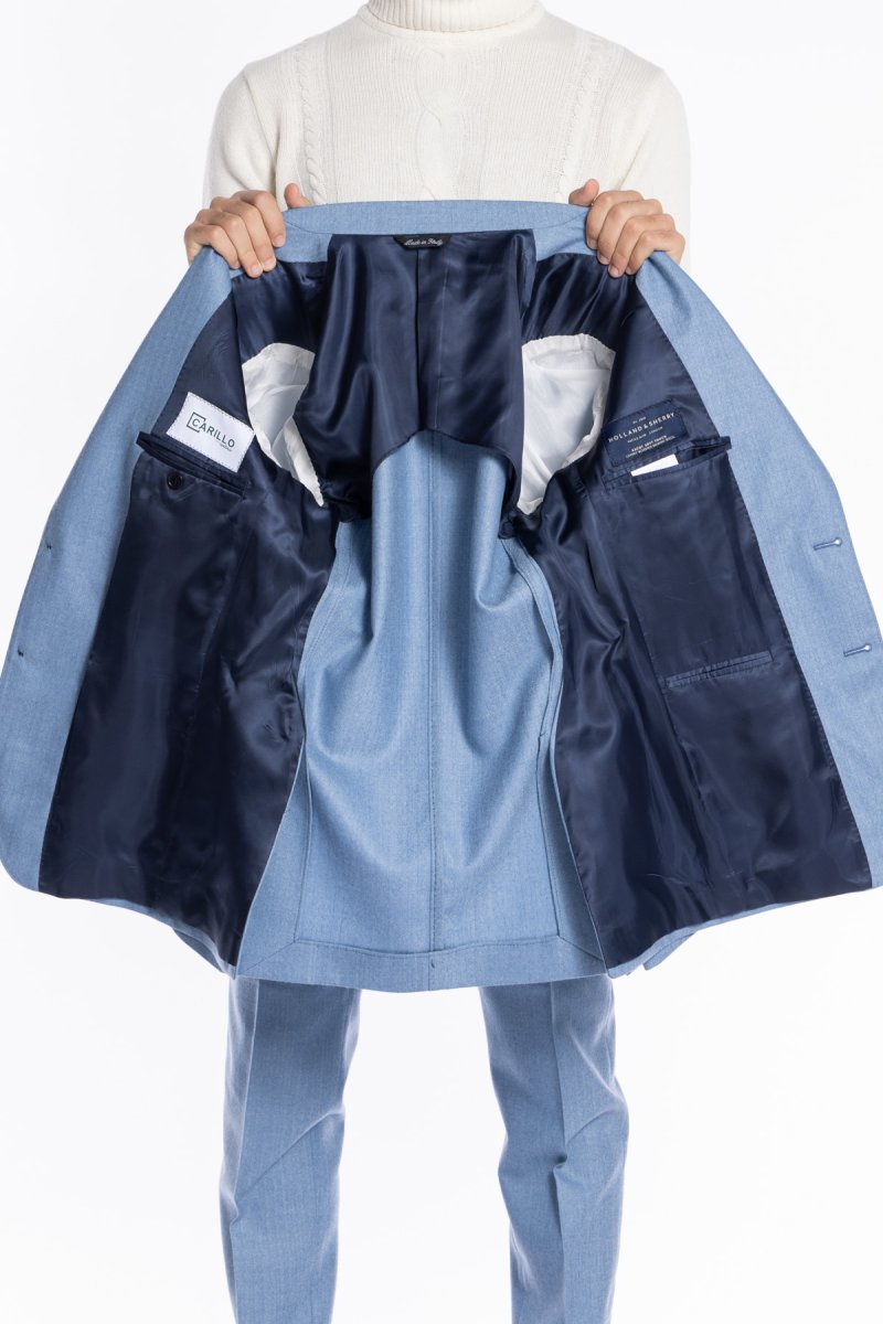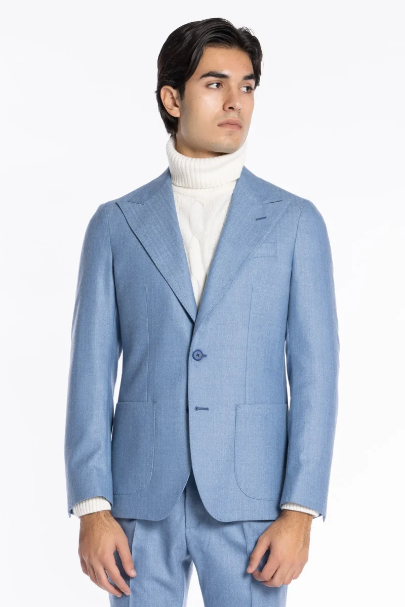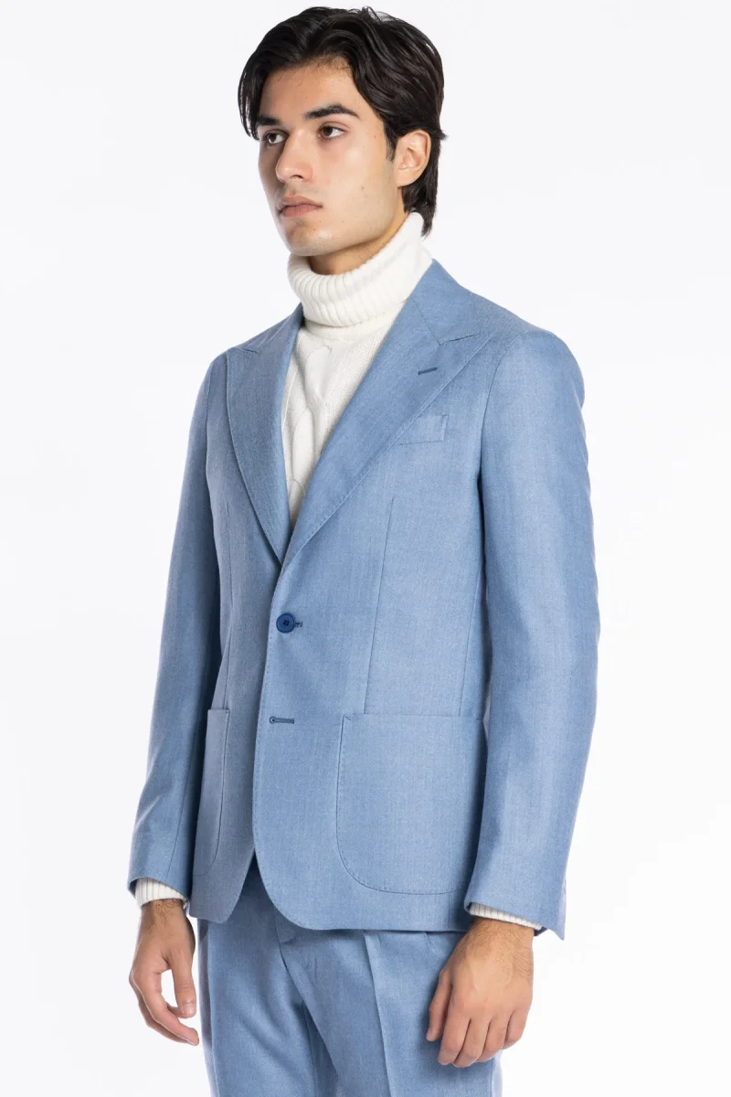 Abito uomo monopetto celeste spigata in pura lana Rever a lancia e tasche a toppe Holland & Sherry