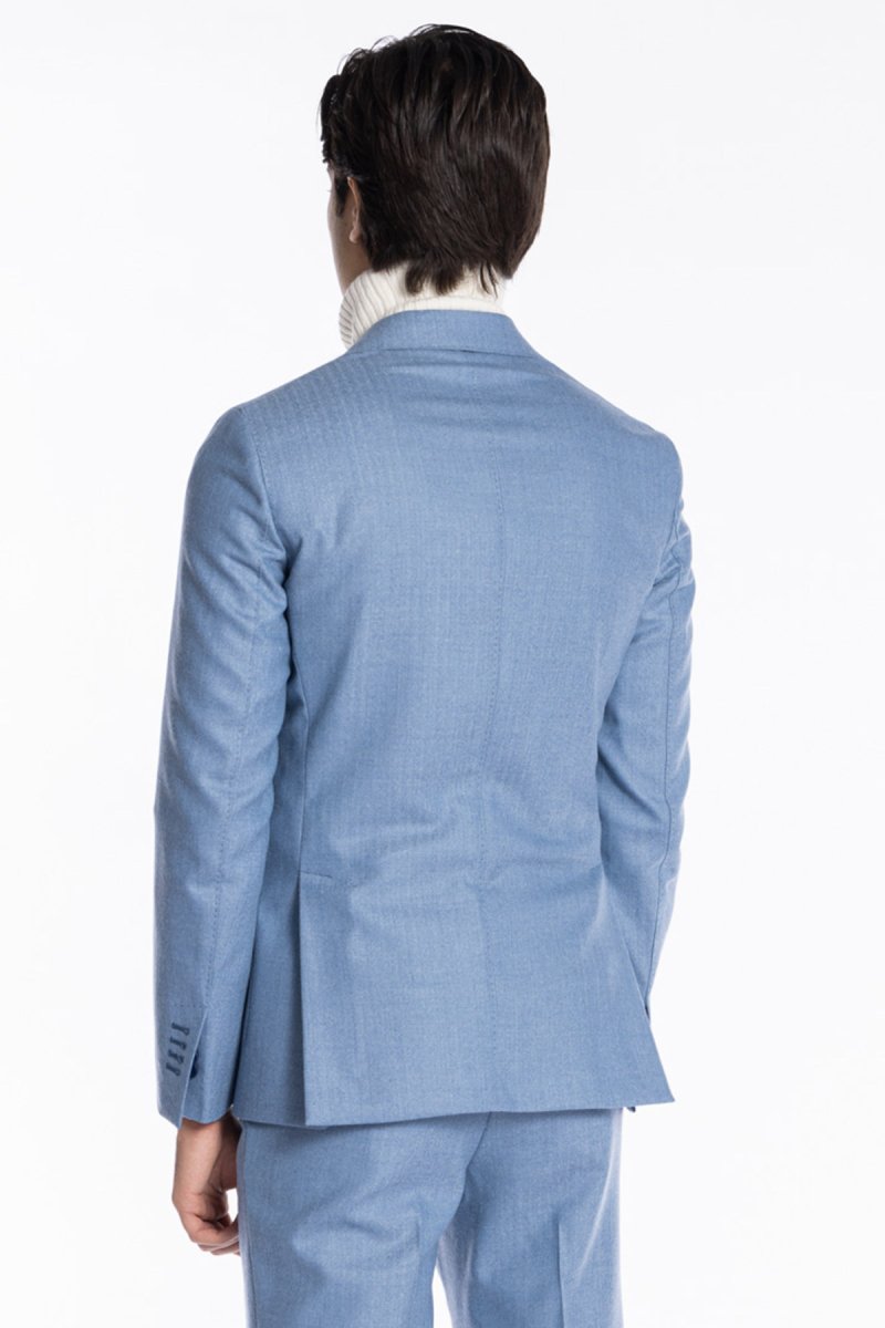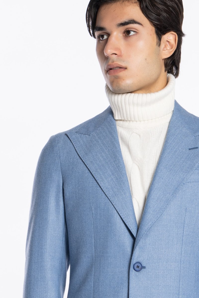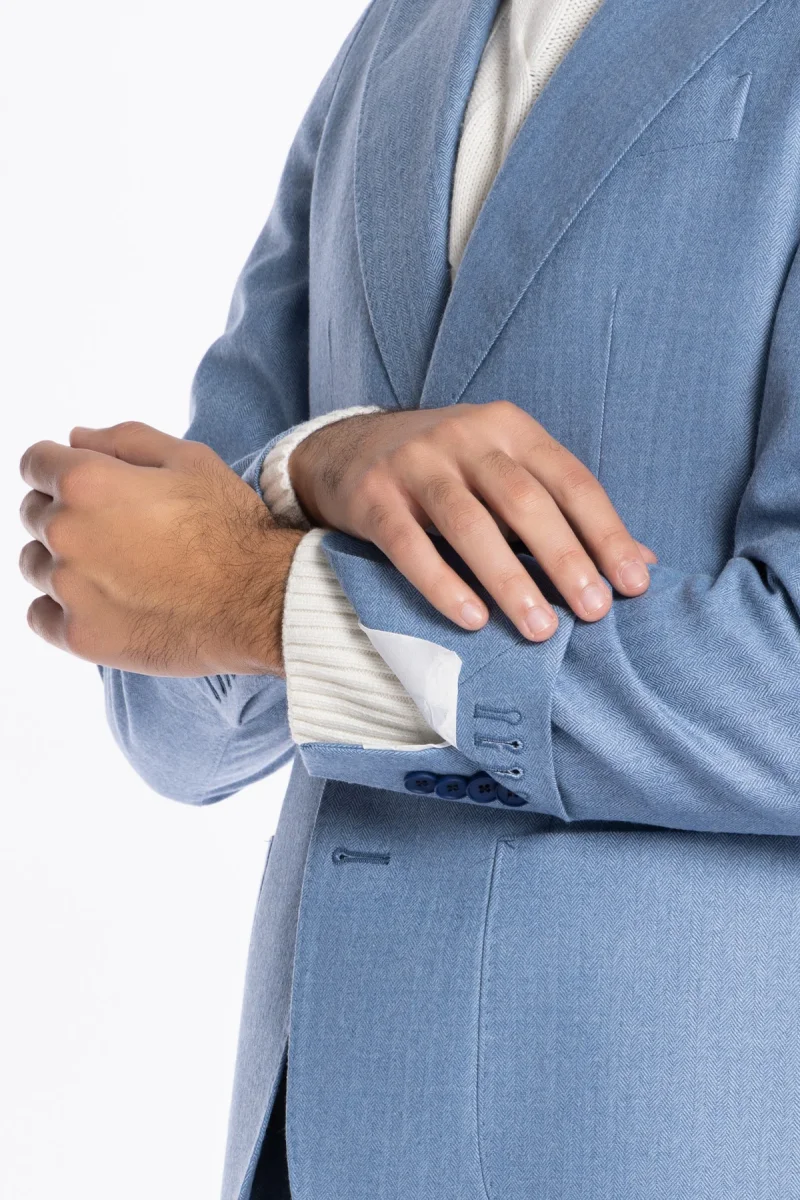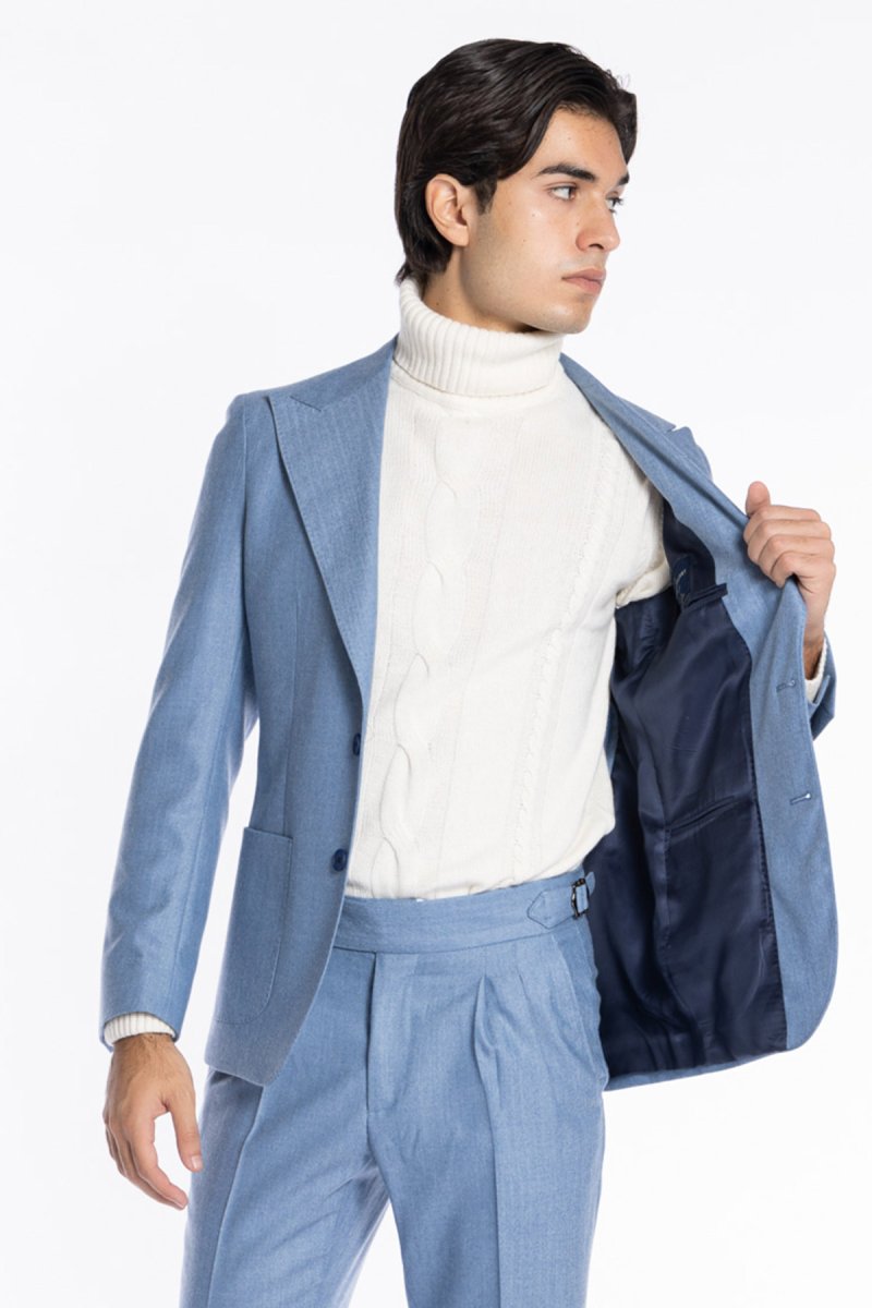 Abito uomo monopetto celeste spigata in pura lana Rever a lancia e tasche a toppe Holland & Sherry
