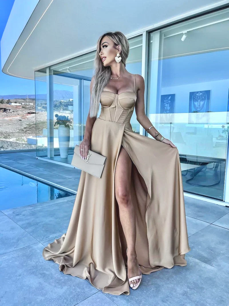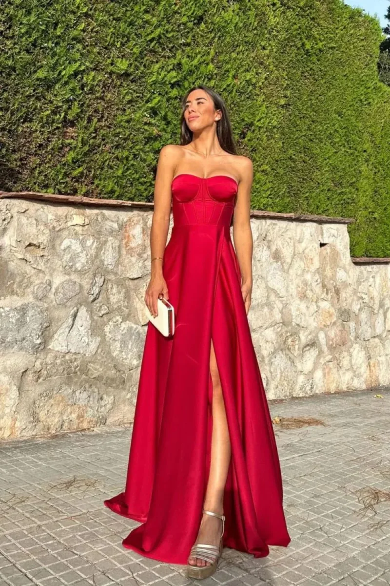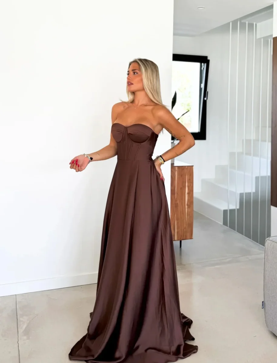 Abito lungo elegante con corpetto dotato di coppe preformate e spacco laterale. Chiusura con laccetto incrociato sulla schiena. spalline regolabili che si possono anche nascondere nel corpetto senza indossarle.