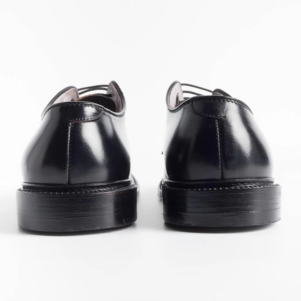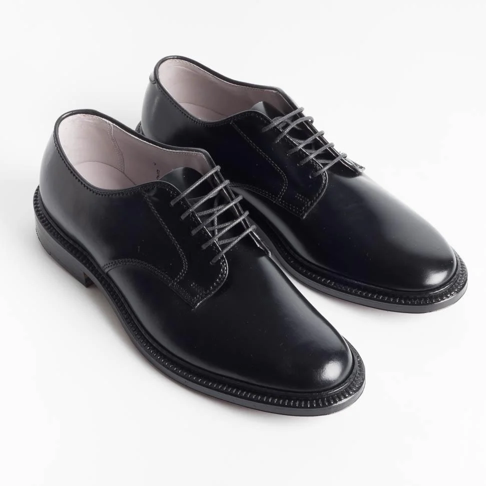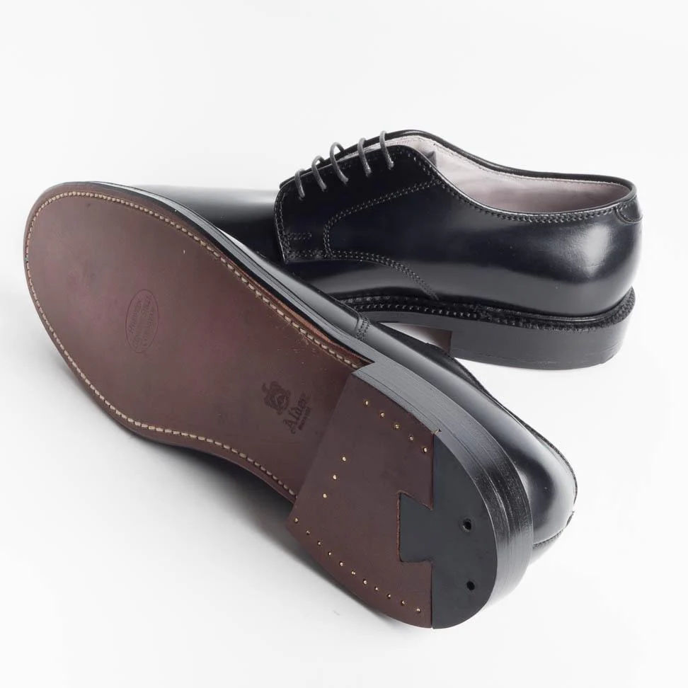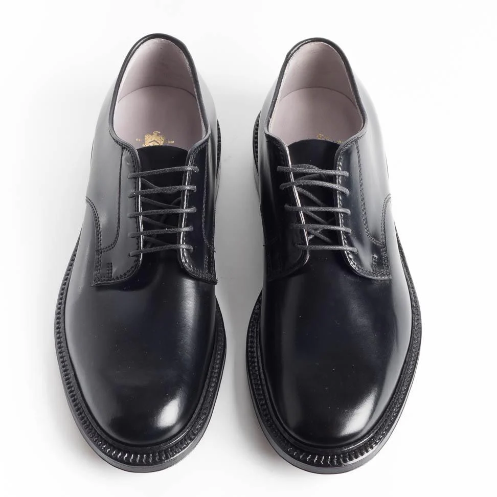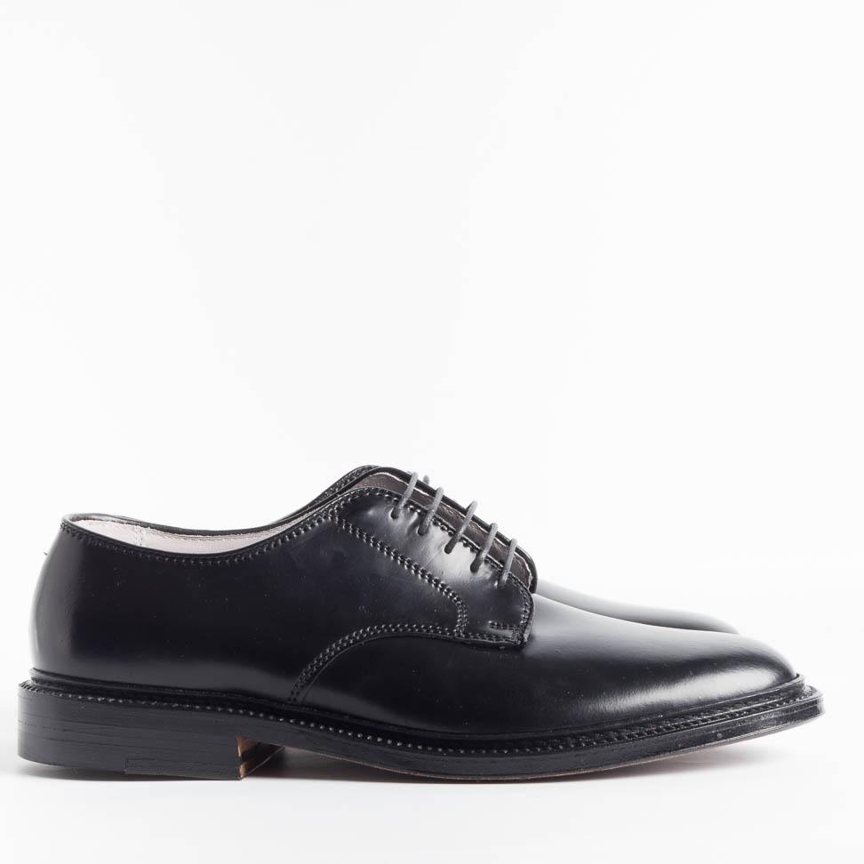 Scarpa derby di Alden realizzata in culatta di cavallo Horween di color nero. Internamente le scarpe sono foderate in pelle vegetale di colore chiaro, fondo morbido in cuoio, costruzione goodyear.