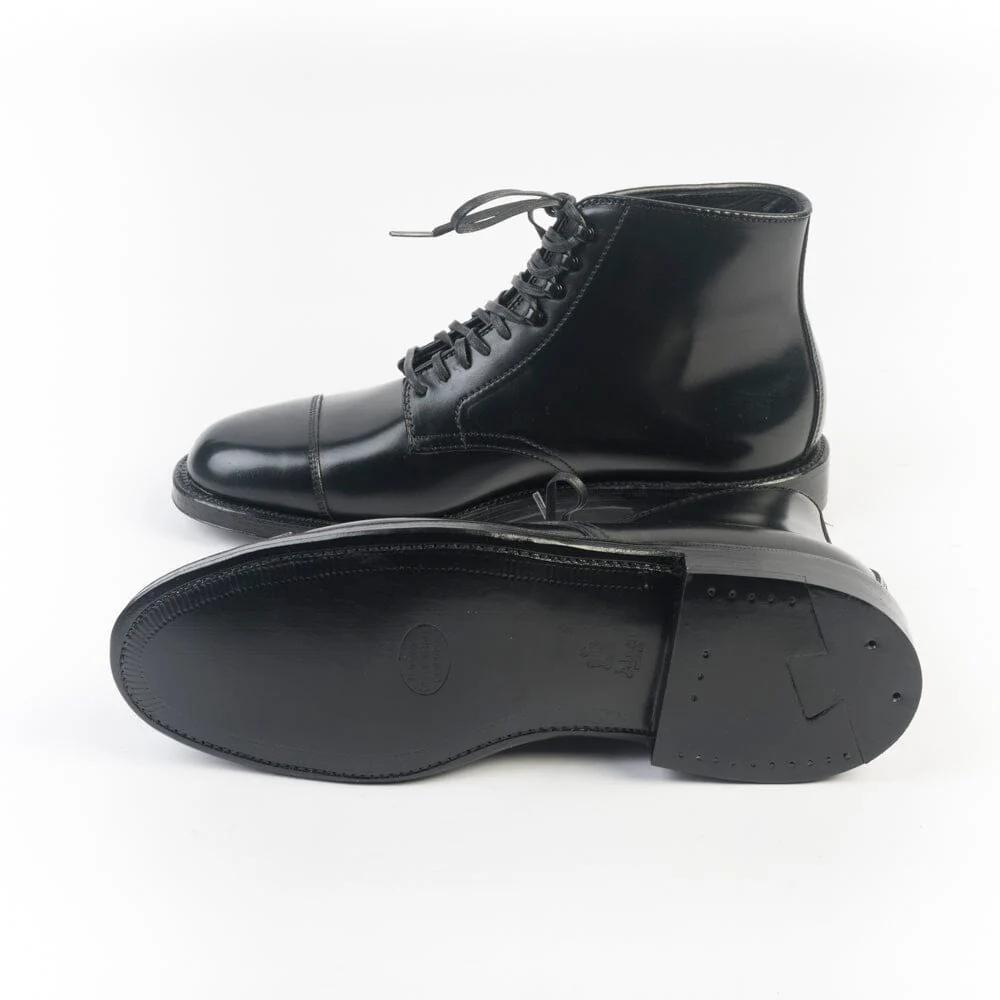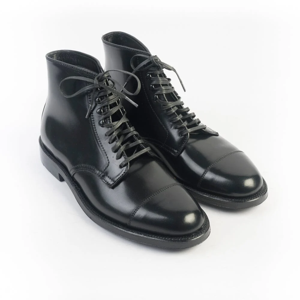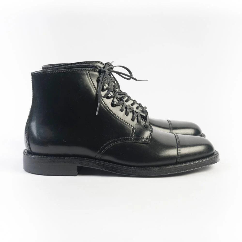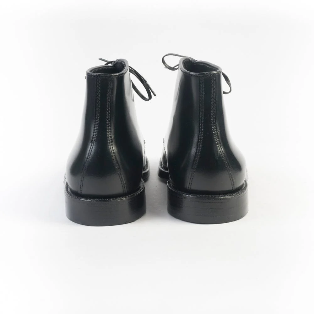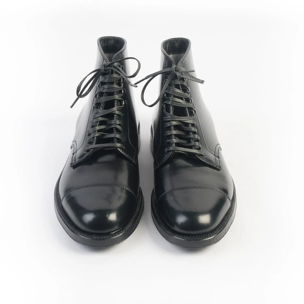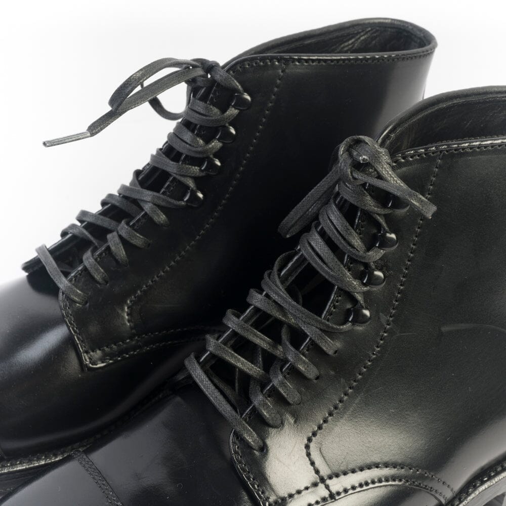 Polacco di Alden cinque fori con lacci cerati in nuance e quattro ganci. Realizzato in culatta di cavallo Horween nel colore nero con puntale. Triplo fondo in cuoio, guardolo con doppia cucitura. Lavorazione goodyear.