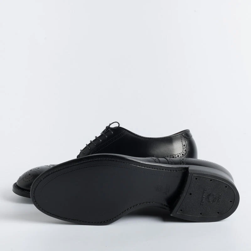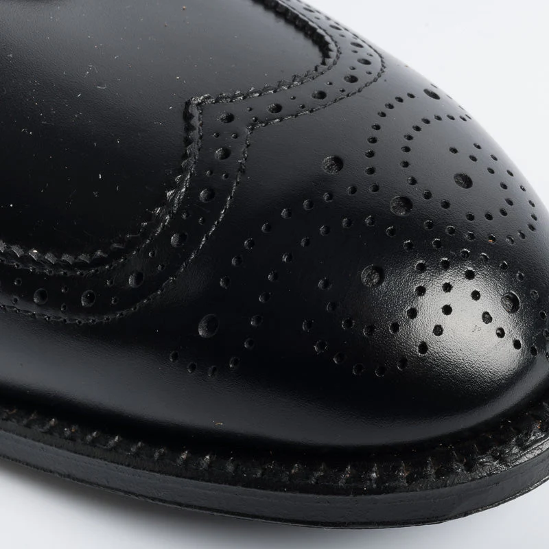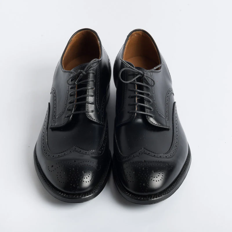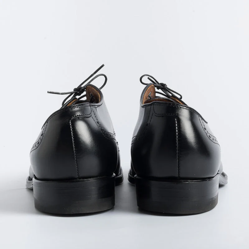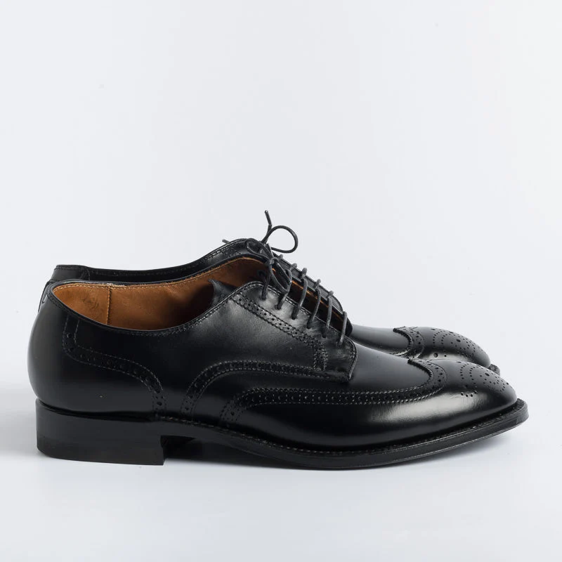 Derby di Alden realizzato in pelle di vitello di colore nero, guardolo con doppia cucitura goodyear e doppia suola in cuoio. Preziosa decorazione duilio.