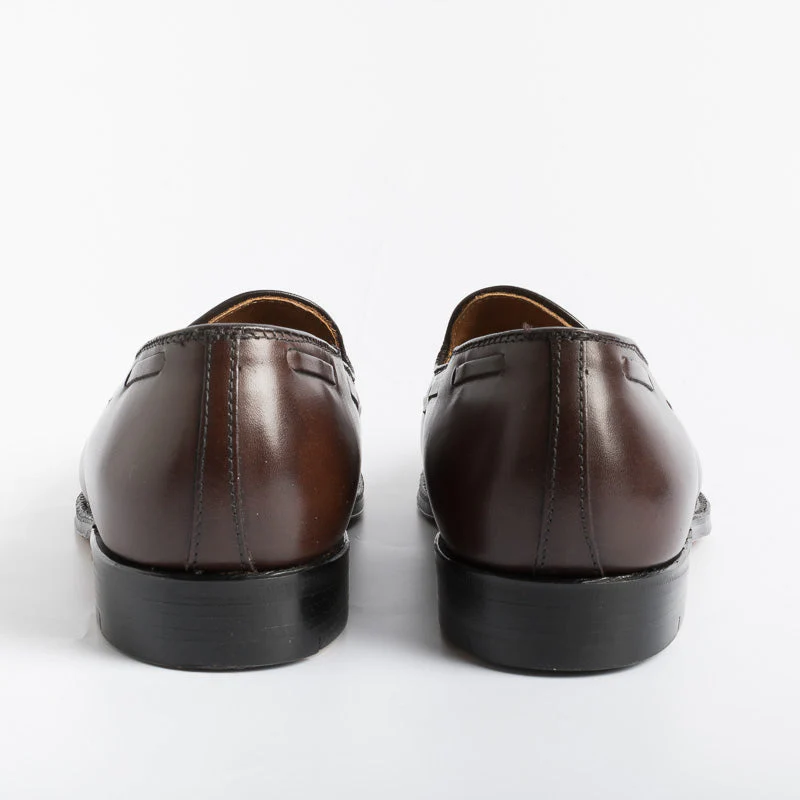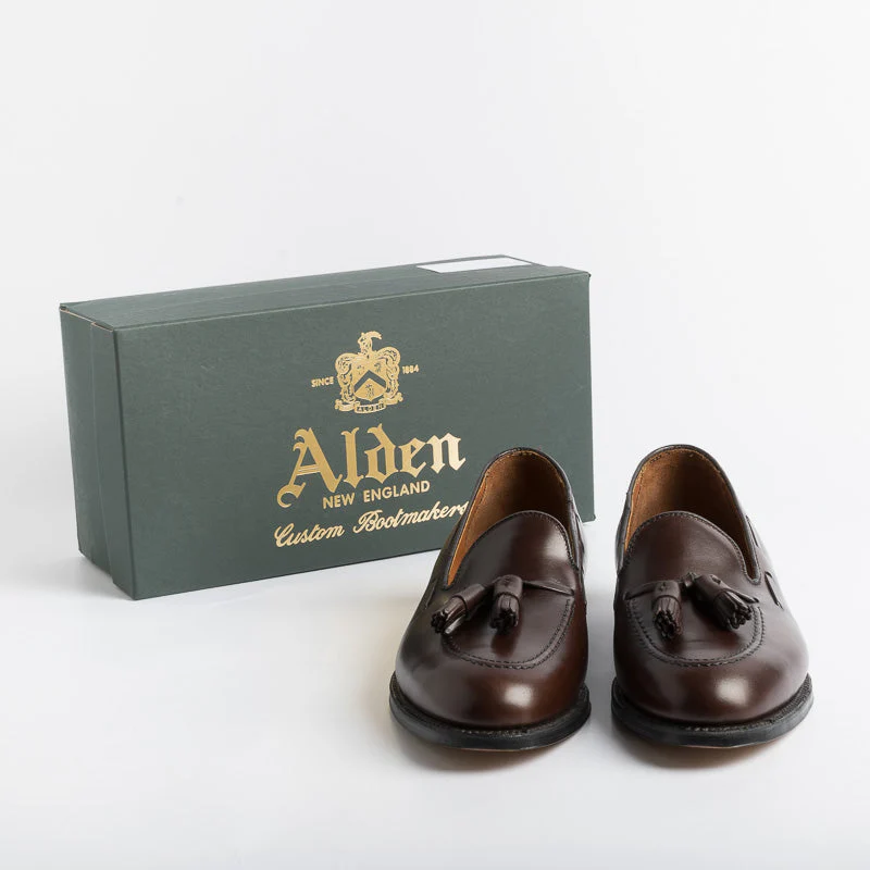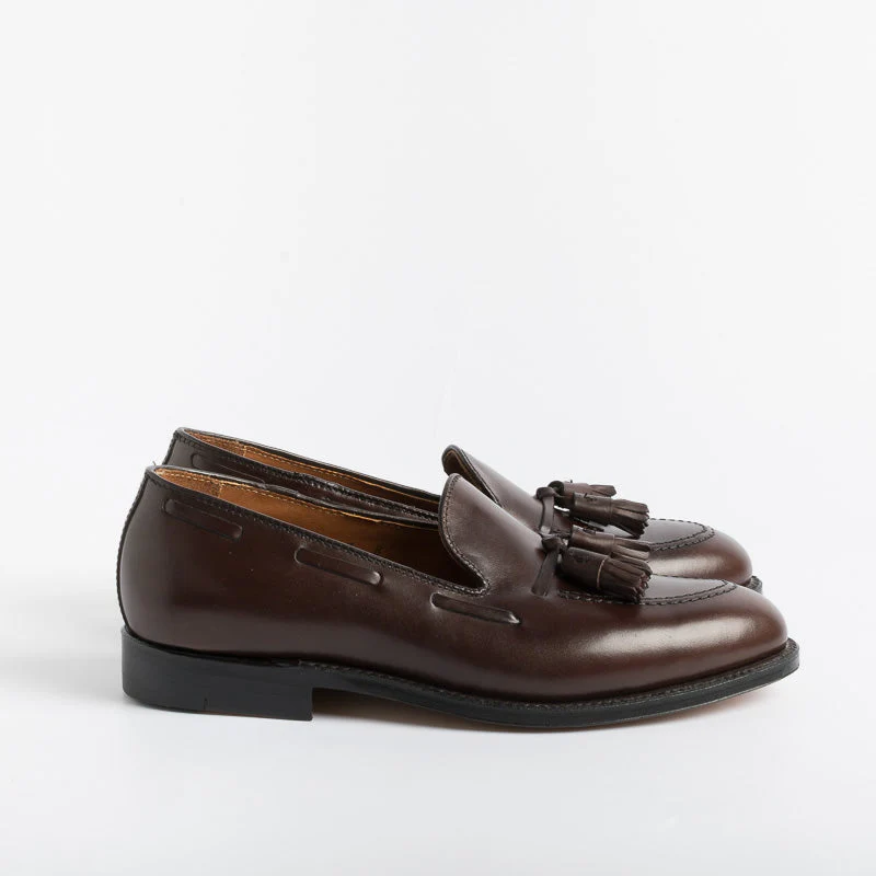 Mocassino con nappine di Alden realizzato in pelle di vitello di colore marrone, suola in cuoio. Lavorazione artigianale, goodyear. Rivestimento interno in pelle.