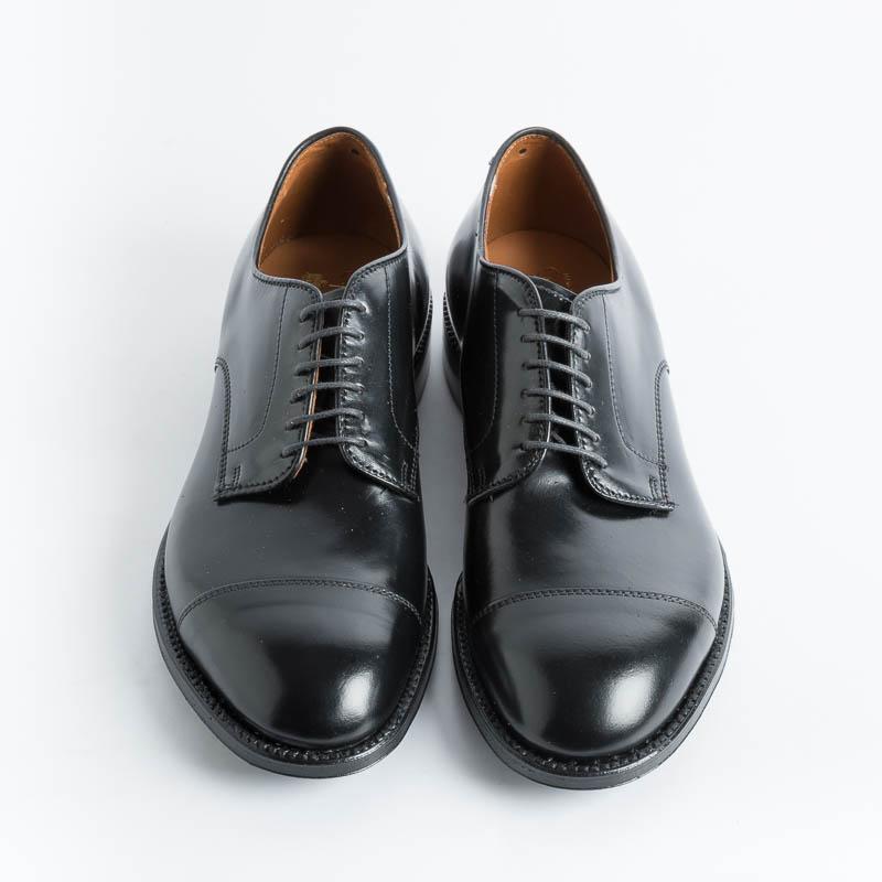 Calzatura Derby dalla forma ergonomica di Alden, realizzata in Culatta di Cavallo conceria Horween di colore nero con interno foderato in pelle di vitello. Lavorazione goodyear e fondo in cuoio. Lacci in cotone cerati in nuance. La calzata particolare di questa forma ergonomica (il lato interno è più alto rispetto a quello esterno della scarpa) la rende unica nel panorama mondiale della calzatura e necessita di una particolare assistenza per la prova.