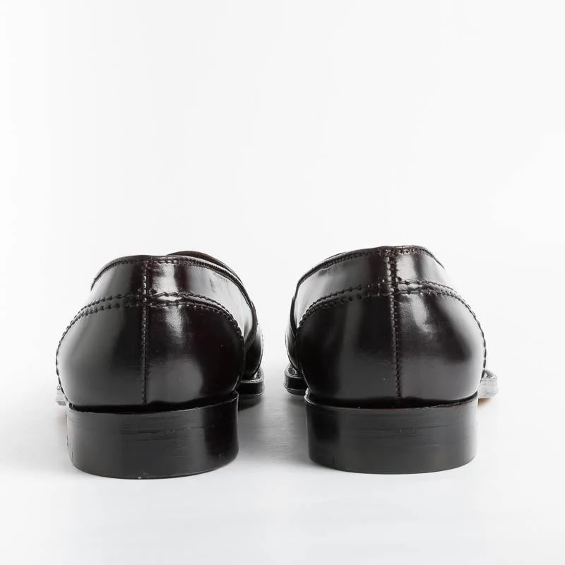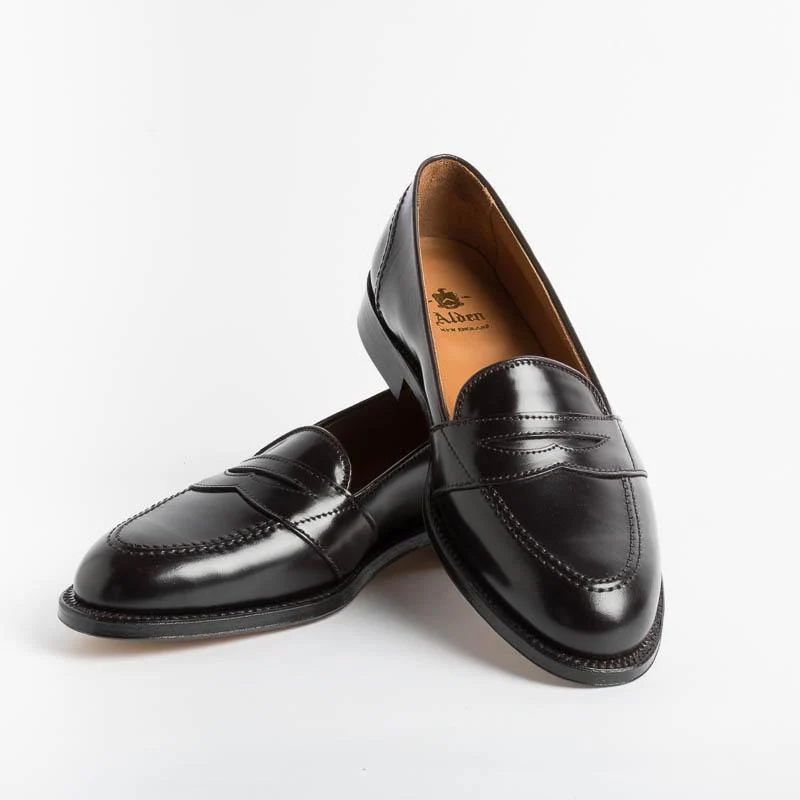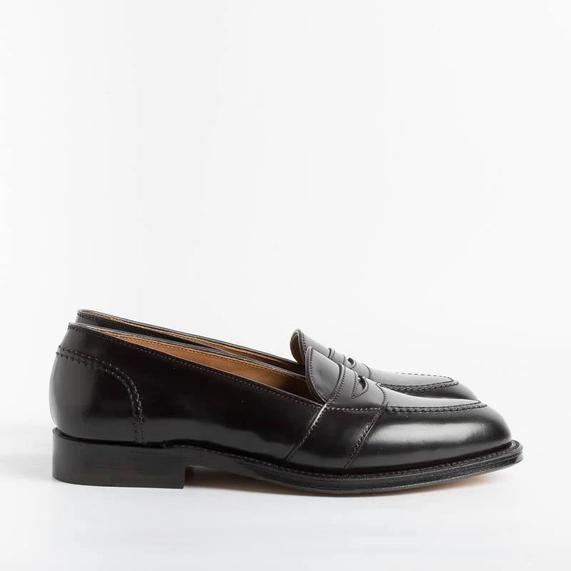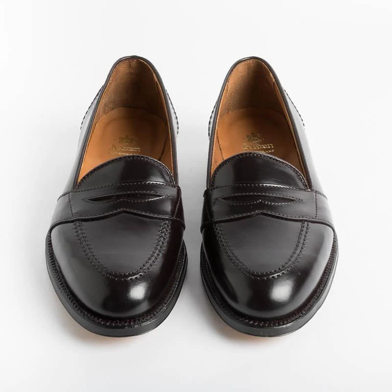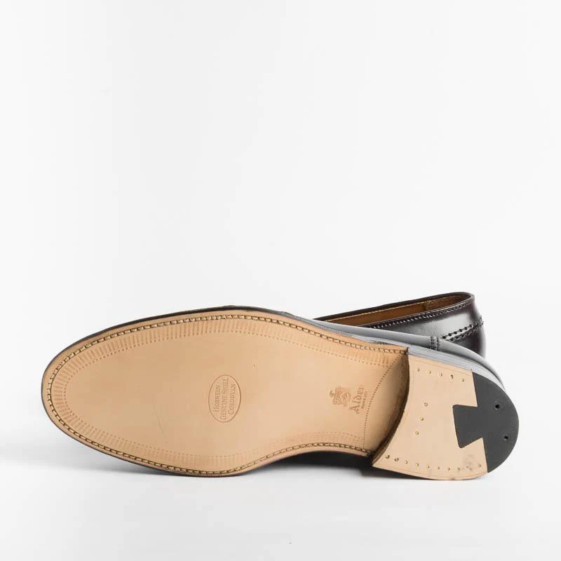 Mocassino classico con mascherina di Alden, realizzato in culatta di cavallo Horween nel classico colore 8. Fondo con suola in cuoio di colore naturale. Lavorazione Goodyear. Rivestimento interno in pelle. Aberdeen Last
