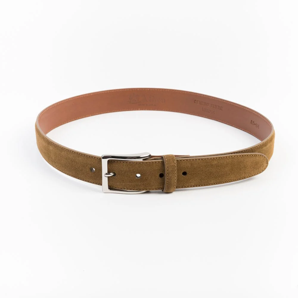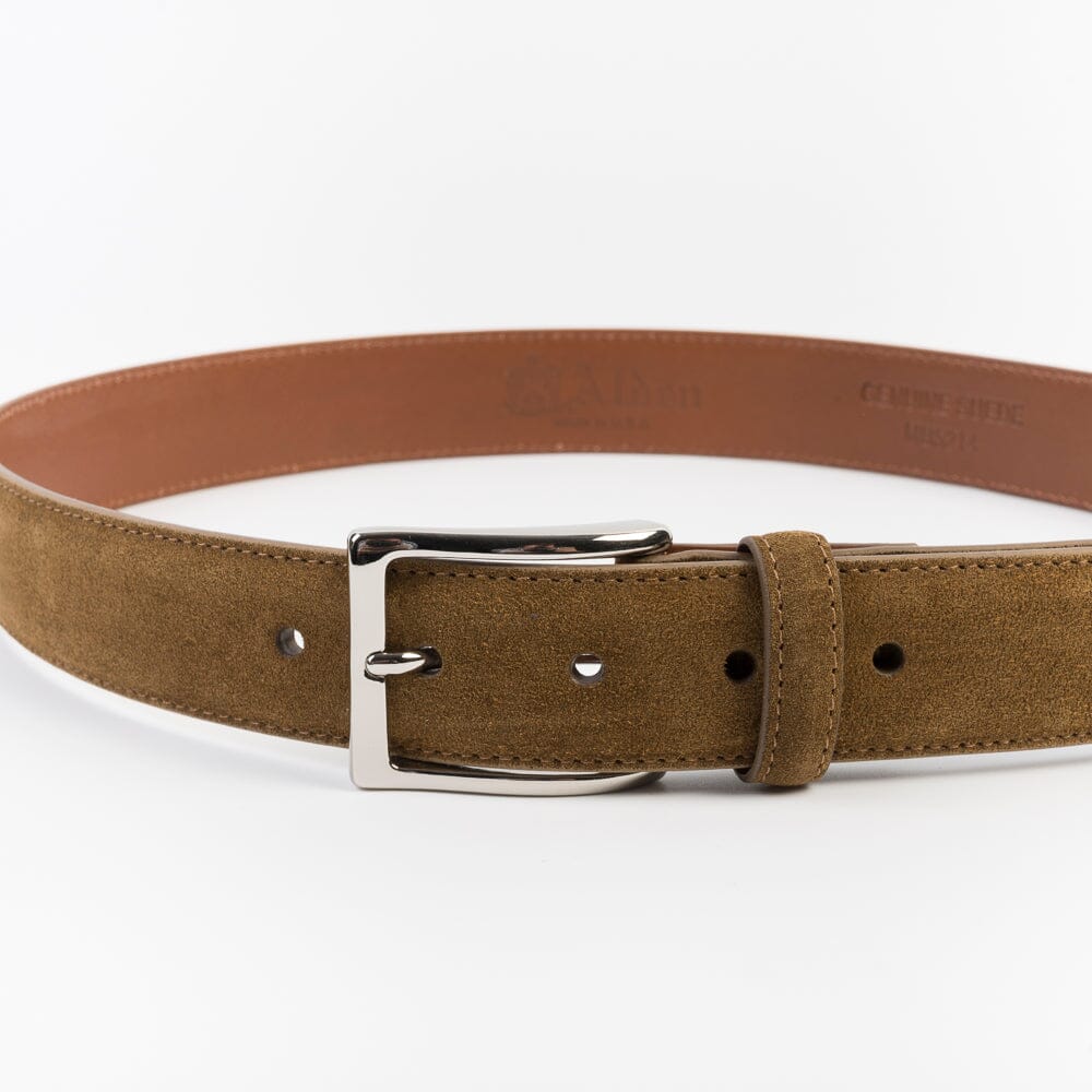 Cintura Alden in camoscio di altezza 3,5 cm, con fibbia in metallo colore argento, realizzata nel colore cuoio.