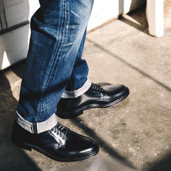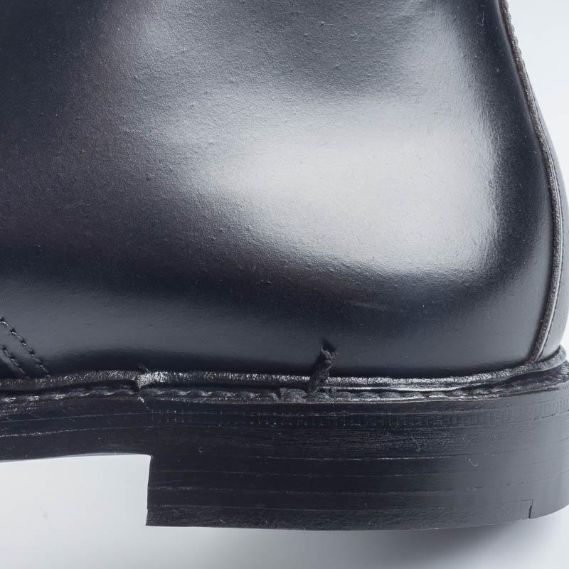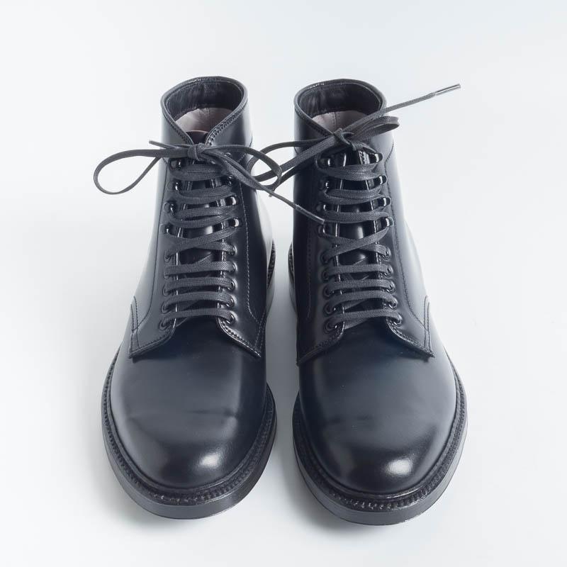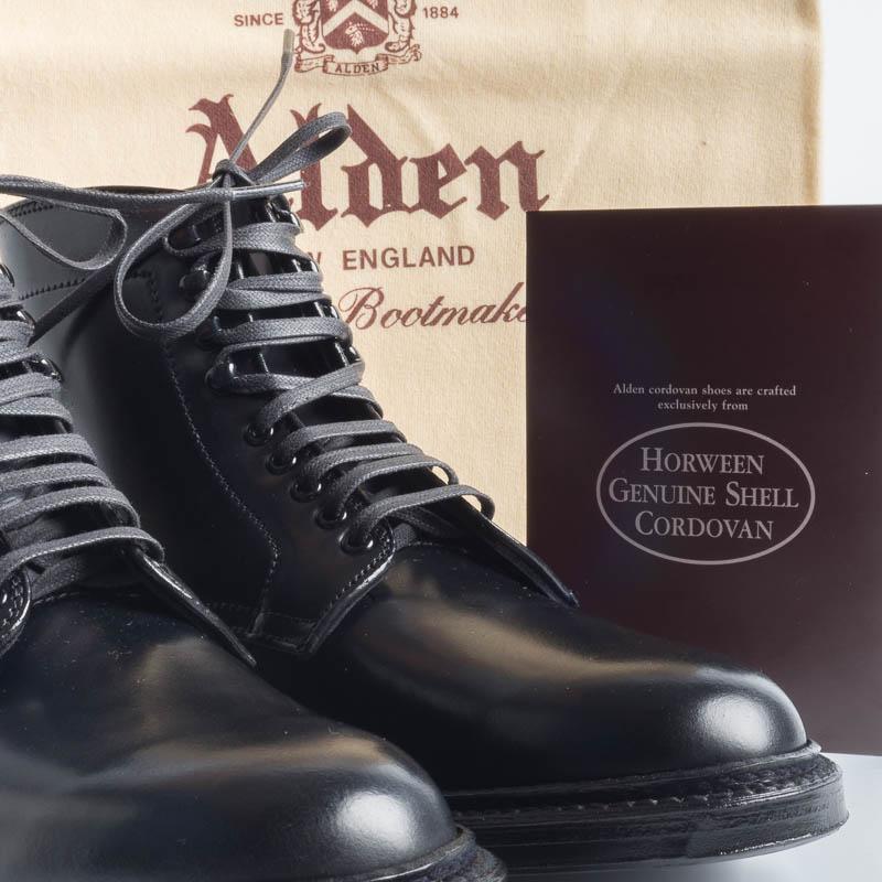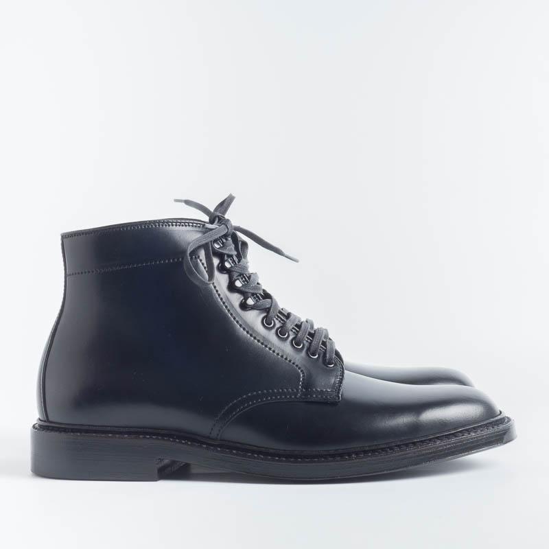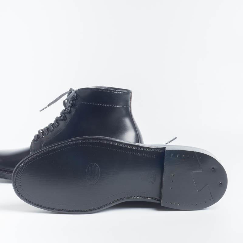 Polacco di Alden realizzato in culatta di Cavallo proveniente dalla prestigiosa conceria Horween, di colore nero con cinque fori e quattro ganci,. Lavorazione goodyear, triplo fondo in cuoio, guardolo con doppia cucitura. Morbidi lacci in cotone cerato.