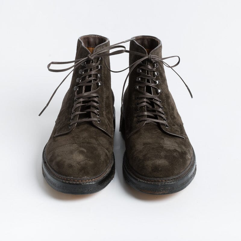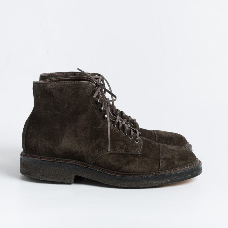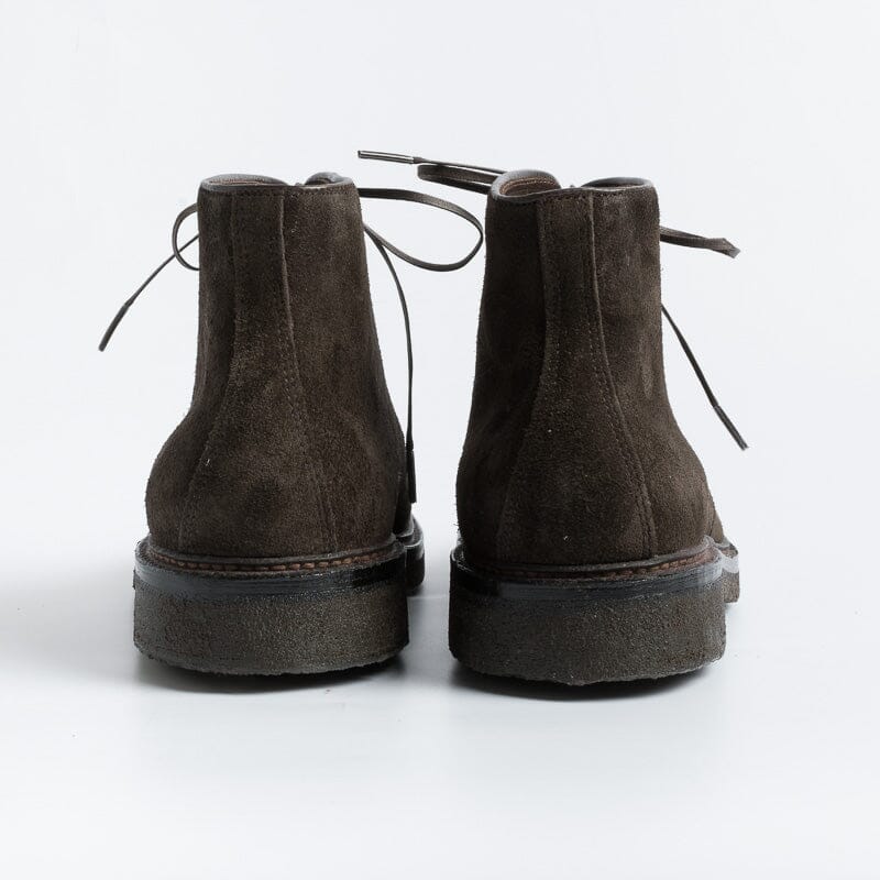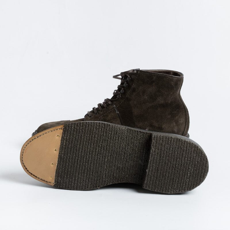 Polacco con puntale di Alden realizzato in camoscio di colore testa di moro. Allacciatura cinque fori e quattro ganci, lacci cerati in nuance. Interno foderato in pelle. Doppia cucitura su guardolo, lavorazione Goodyear, fondo para e piantina cuoio.