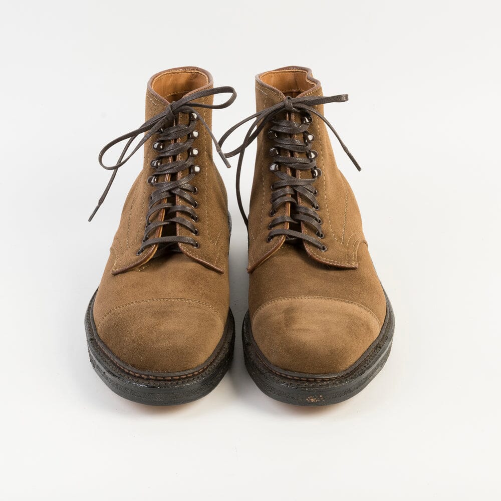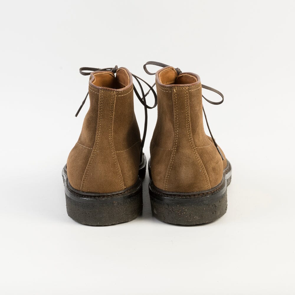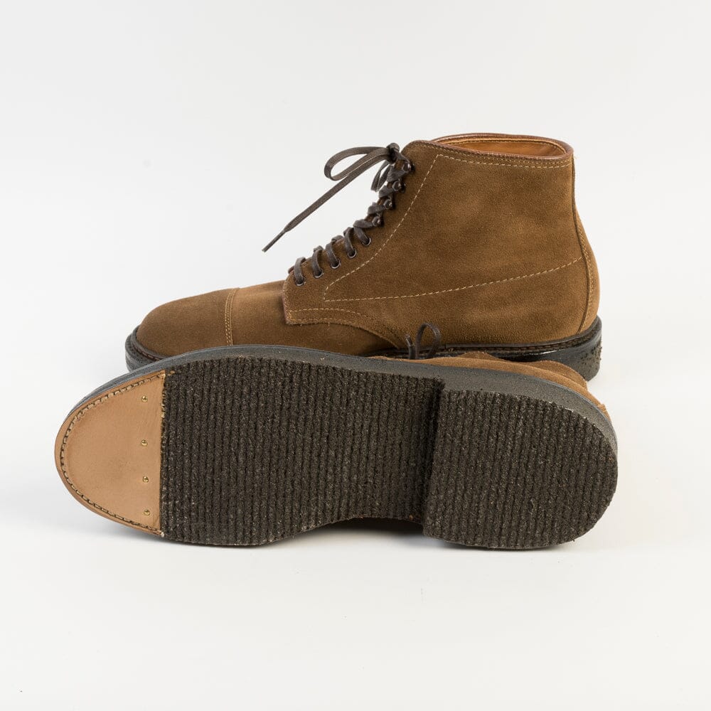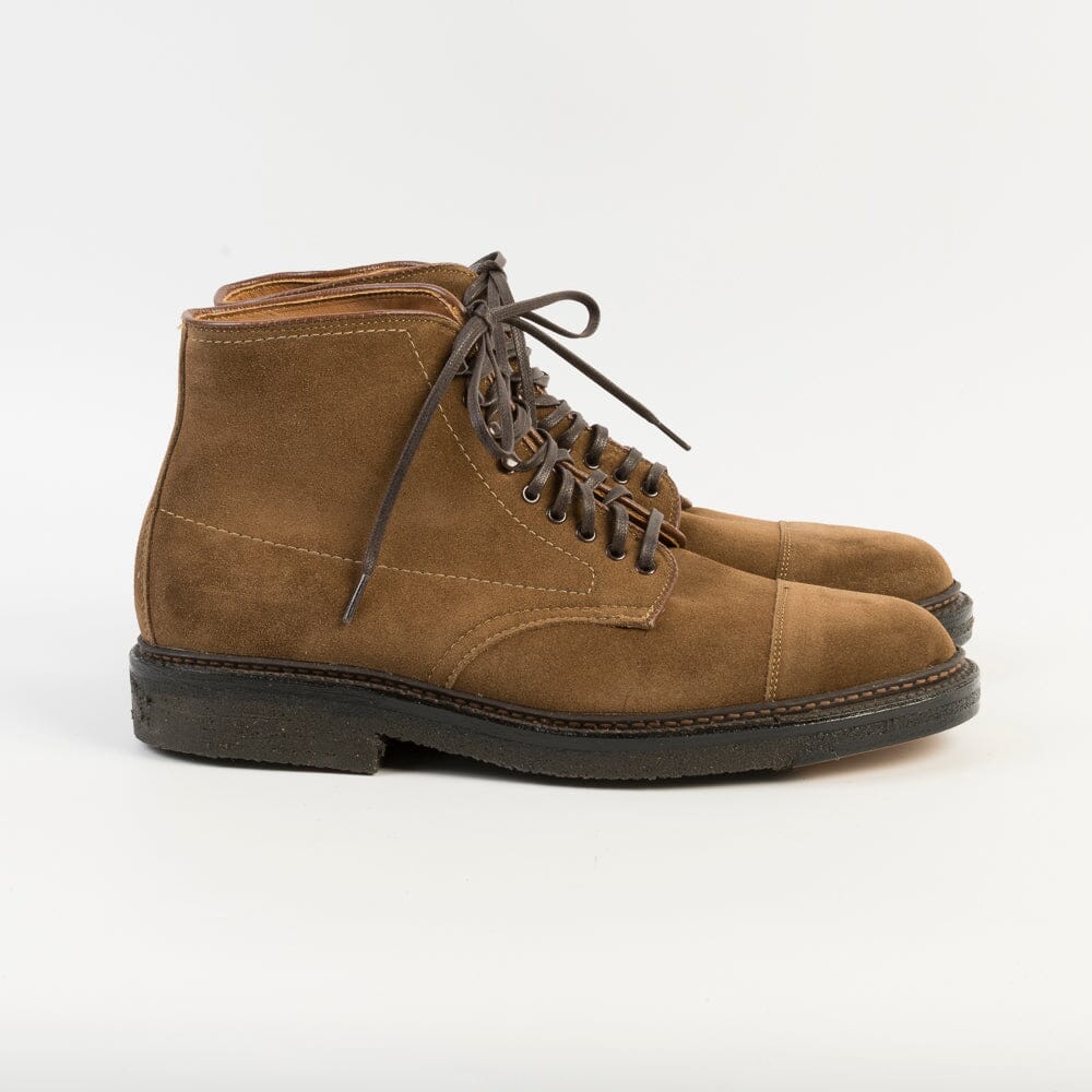 Polacco con puntale di Alden realizzato in camoscio di colore bruciato. Allacciatura cinque fori e quattro ganci, lacci cerati in nuance. Interno foderato in pelle. Doppia cucitura su guardolo, lavorazione goodyear, fondo para e piantina cuoio.