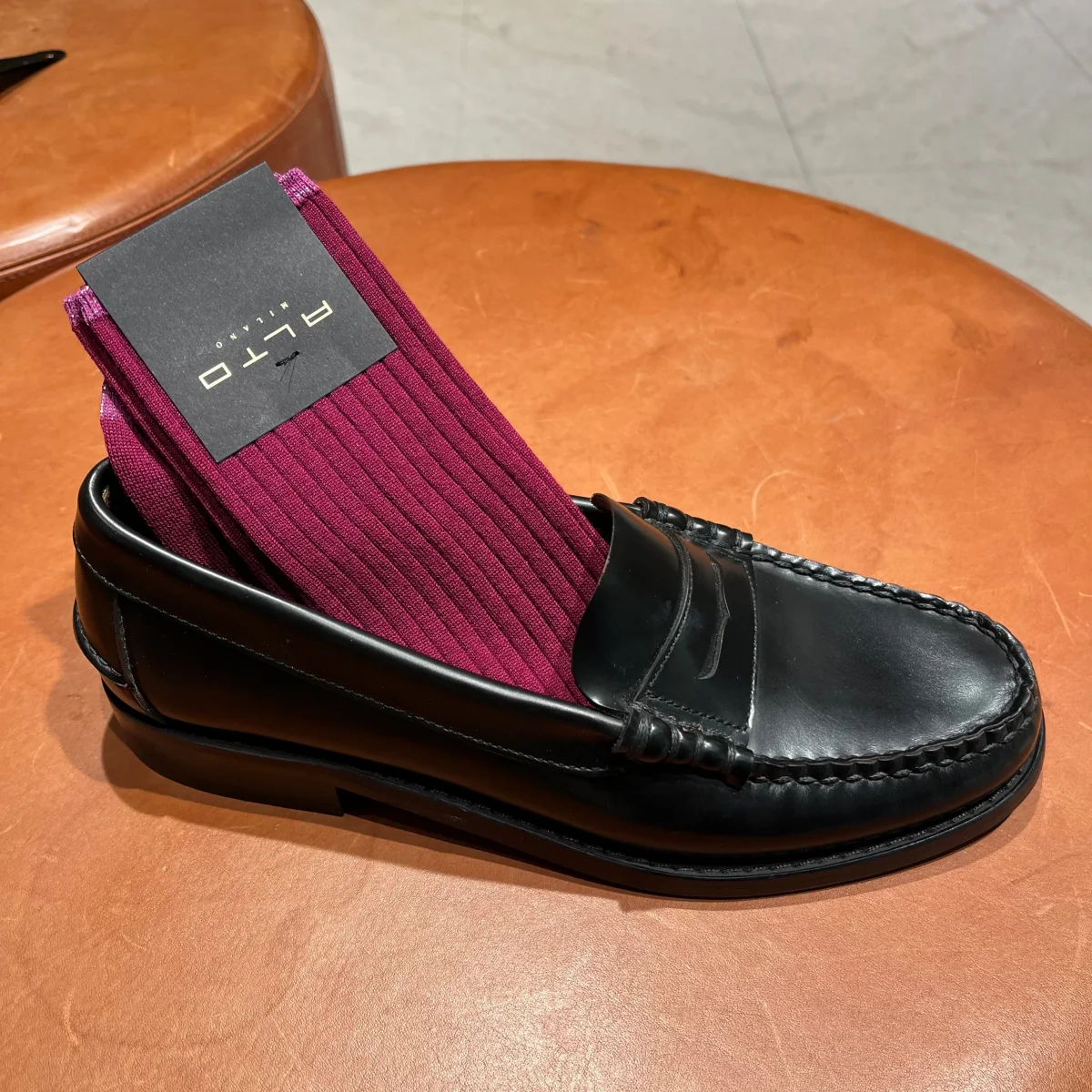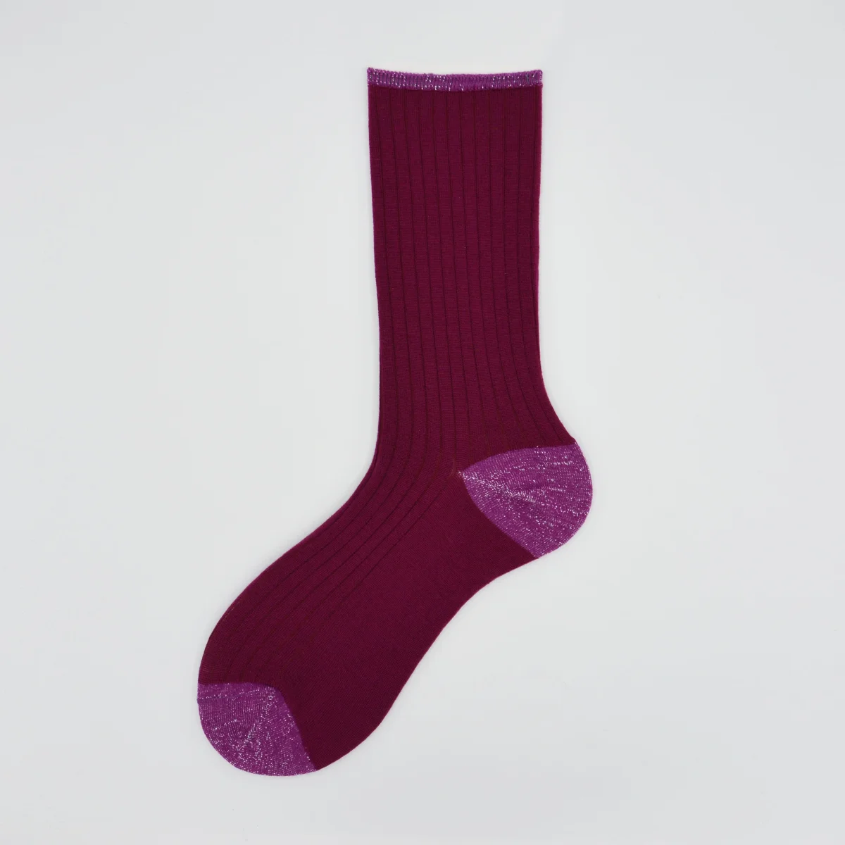 Calzino di lana in colore prugna con decorazione a coste. Tallone e puntale in cotone in nuance glitterato argento.