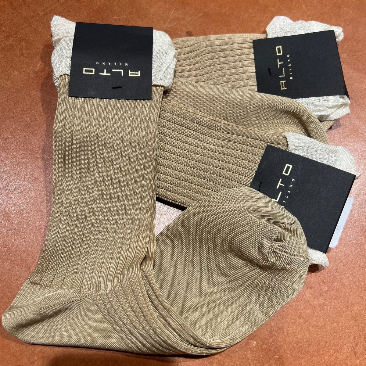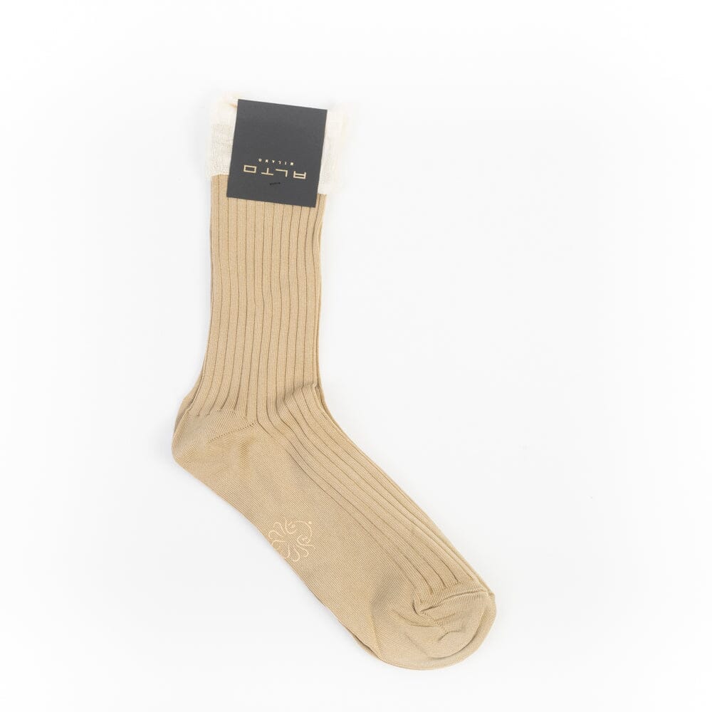 Calzino di viscosa in colore beige con decorazione alla fine del bordo.