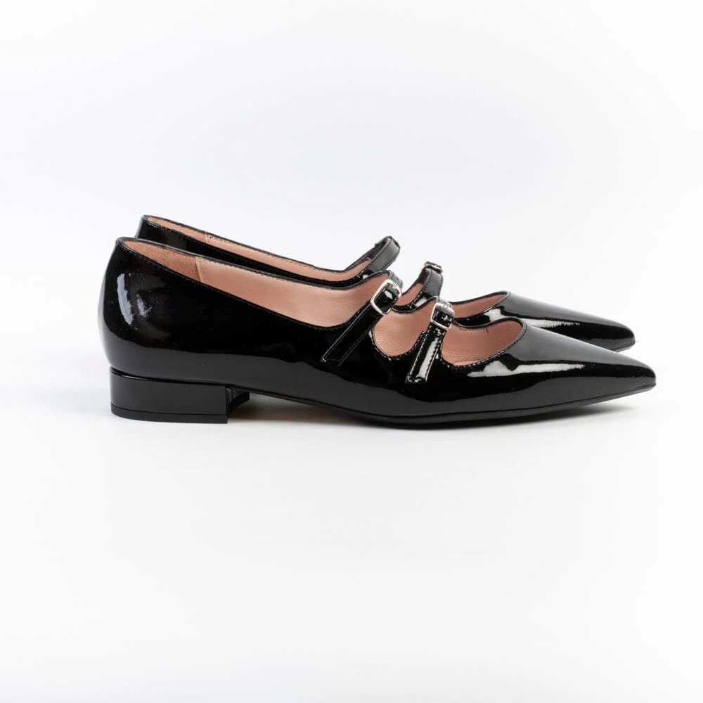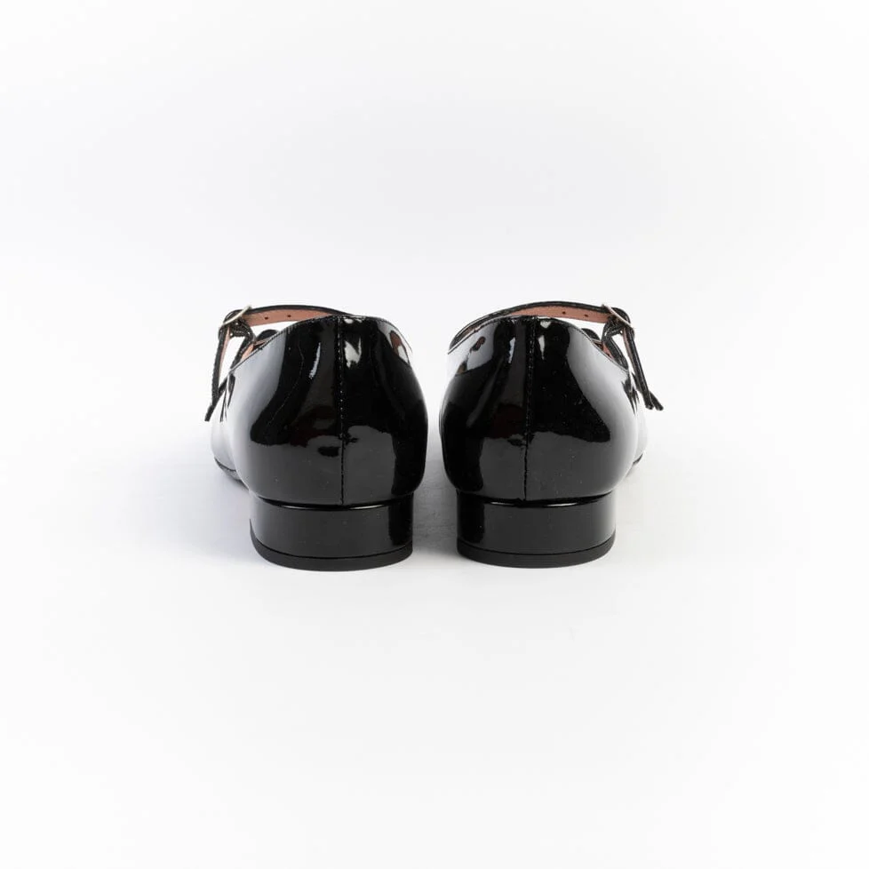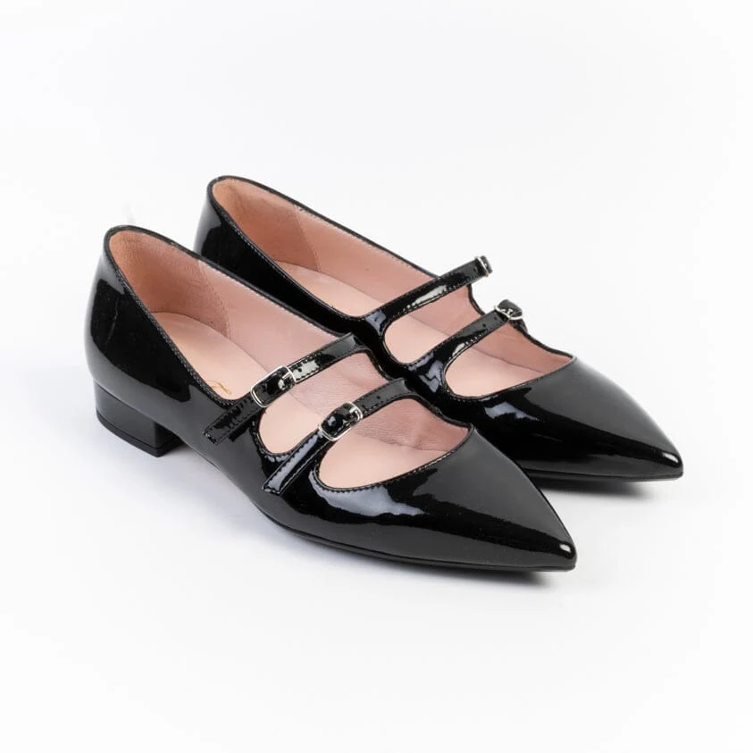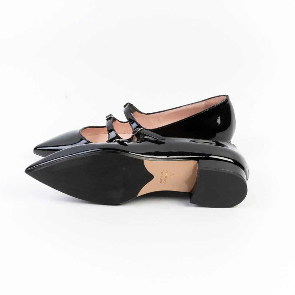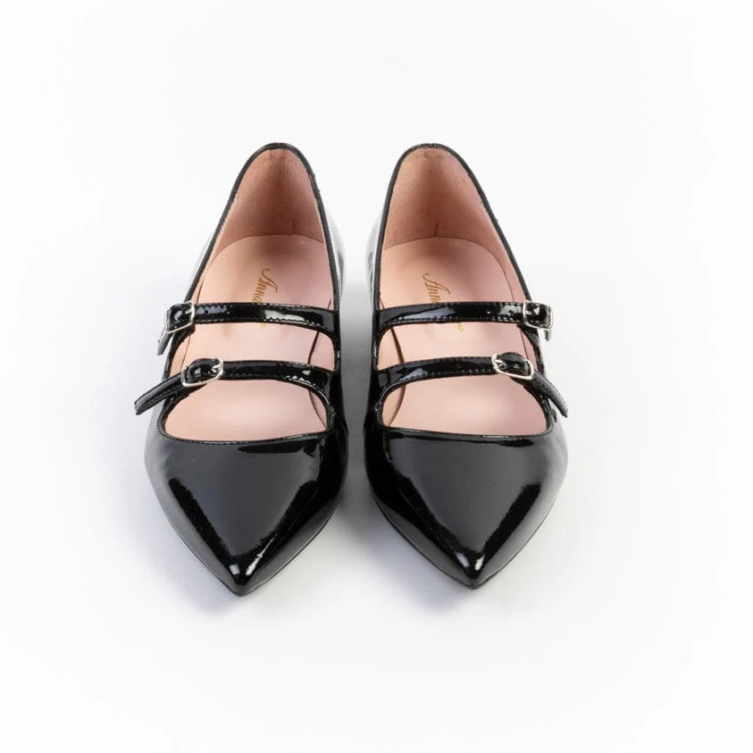Mary Jane a punta di Anna F. realizzate in vernice di colore nero. Decorazione con doppio cinturino regolabile sul dorso del piede. Rivestimento interno in vera pelle. Tacco sempre rivestito in pelle, di 2 cm. Suola in cuoio con inserto in gomma.