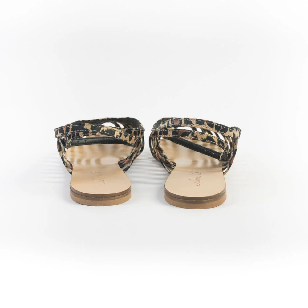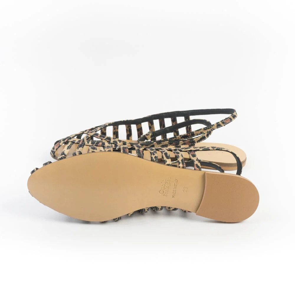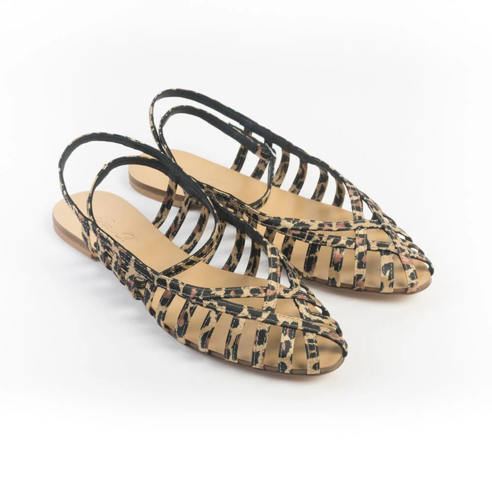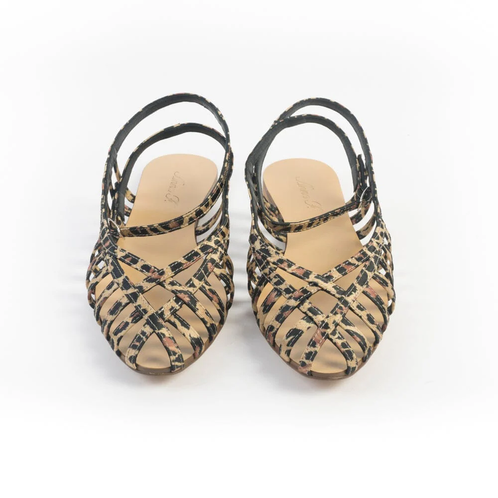 Sandali con tomaia “a ragnetto” di Anna F. realizzati in tessuto maculato foderato in pelle di colore nero. Chiusura su caviglia con fibbia. Sottopiede in cuoio. Suola in cuoio ecologico.