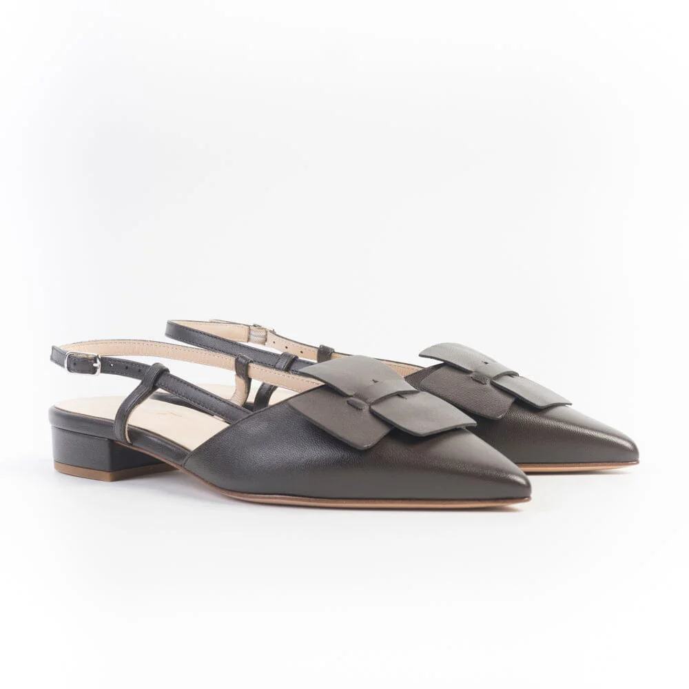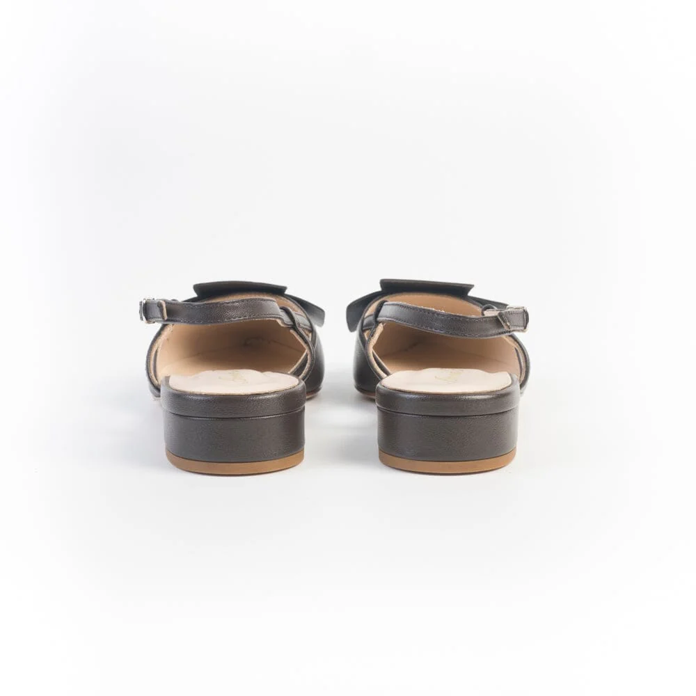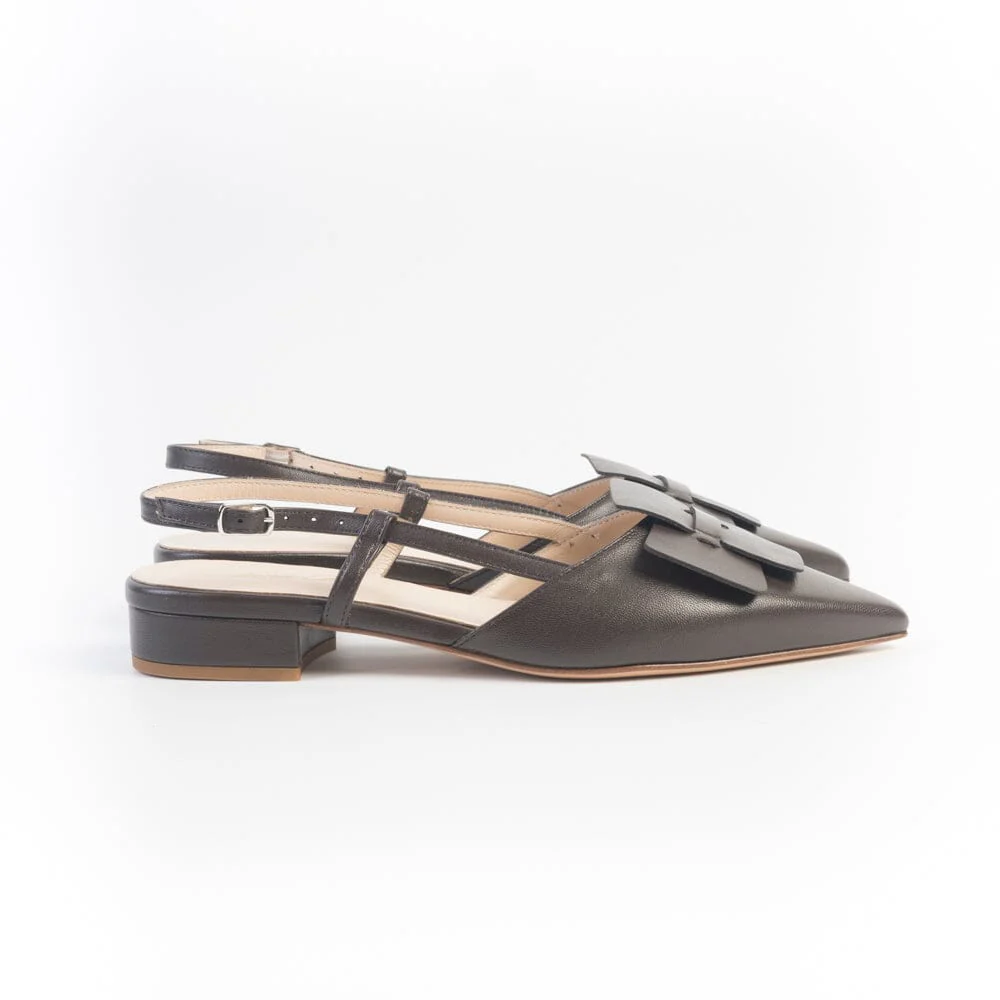 Sling Back di Anna F., realizzate in morbida pelle di colore marrone con raffinato dettaglio a fiore stilizzato sulla punta. Allacciatura con cinturino su caviglia. Rivestimento interno in vera pelle. Tacco rivestito in pelle, di 2 cm. Suola in cuoio.