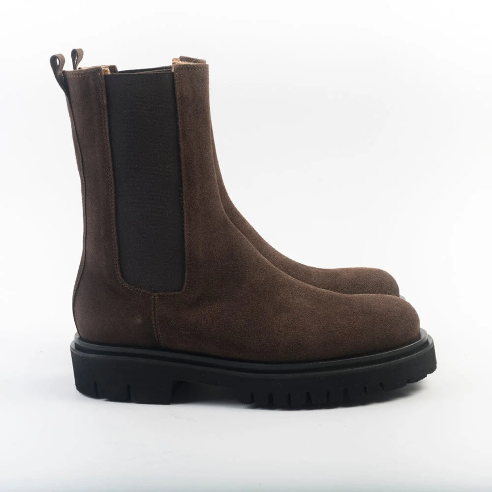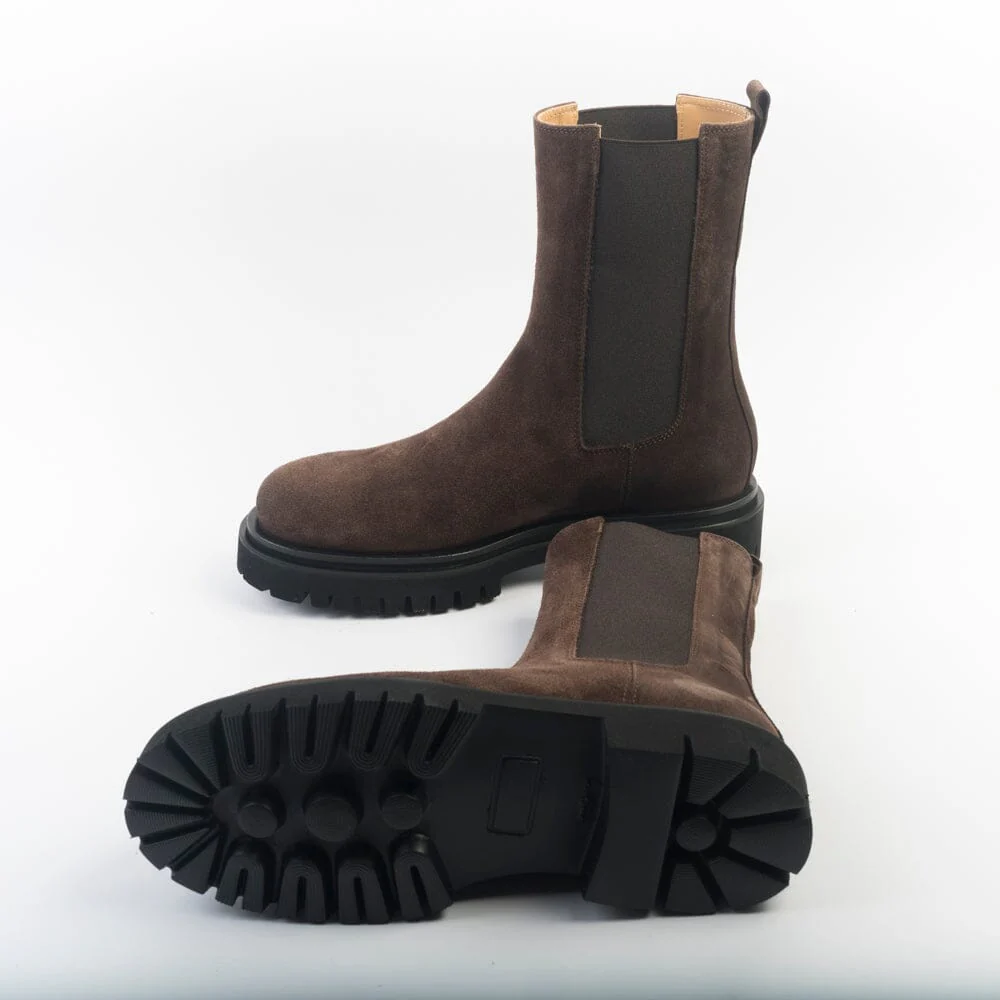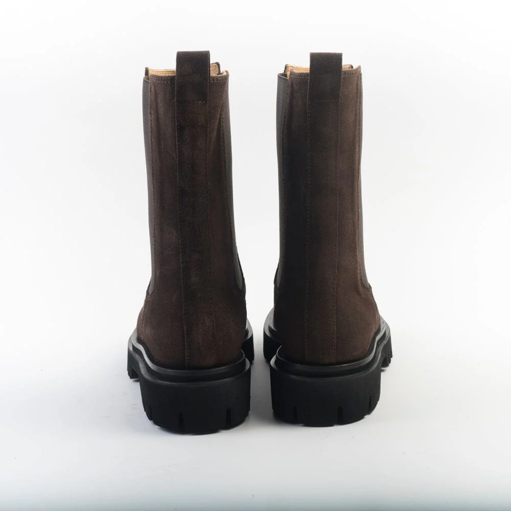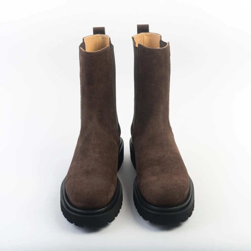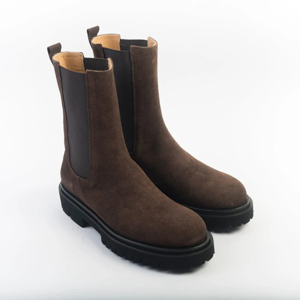 Stivaletto con punta stondata di Anna F, realizzato in morbido camoscio di colore testa di moro con elastici laterali in nuance per facilitarne la calzata. Altezza gambale 20 cm (riferito al n.38). Suola tipo commando di 2/4 cm.