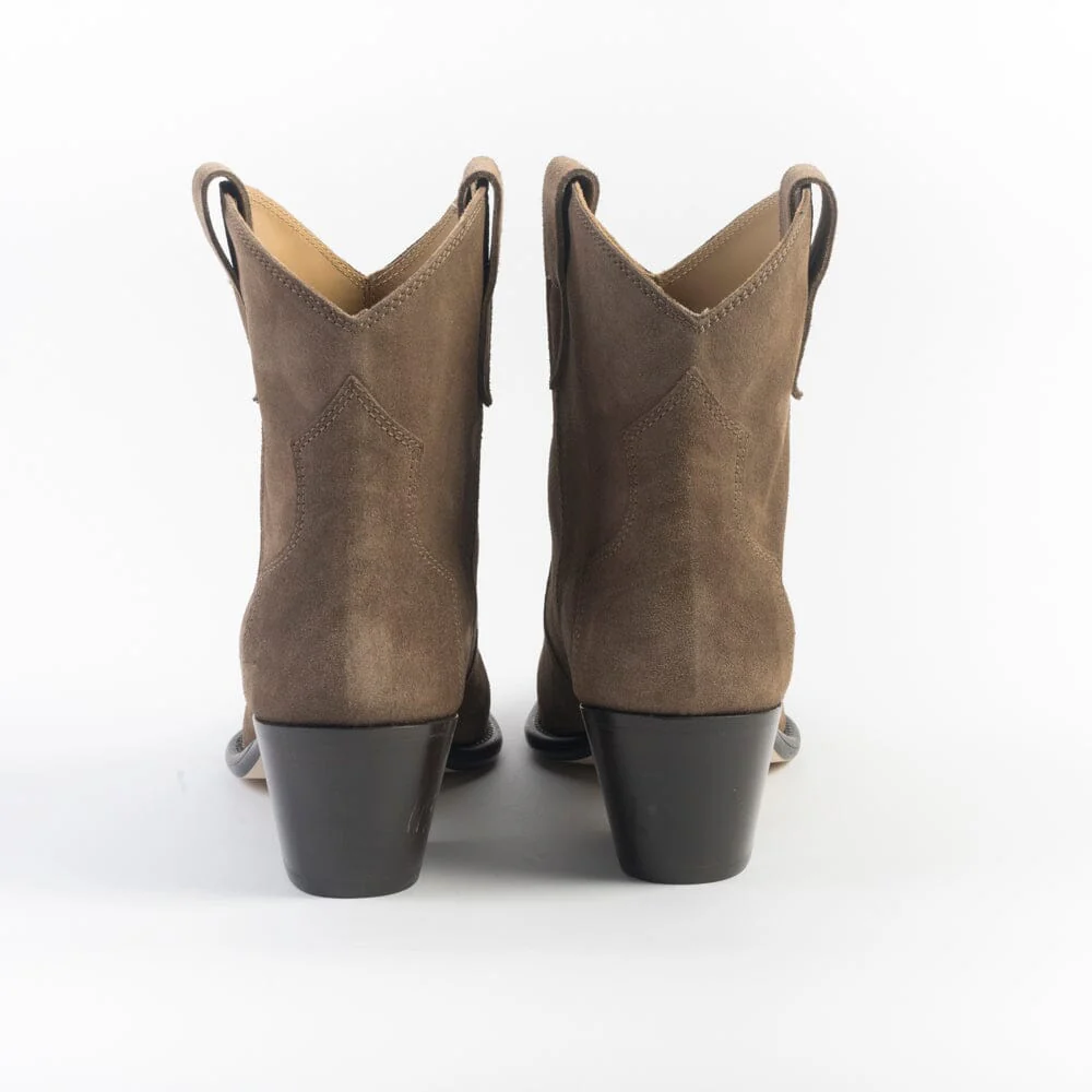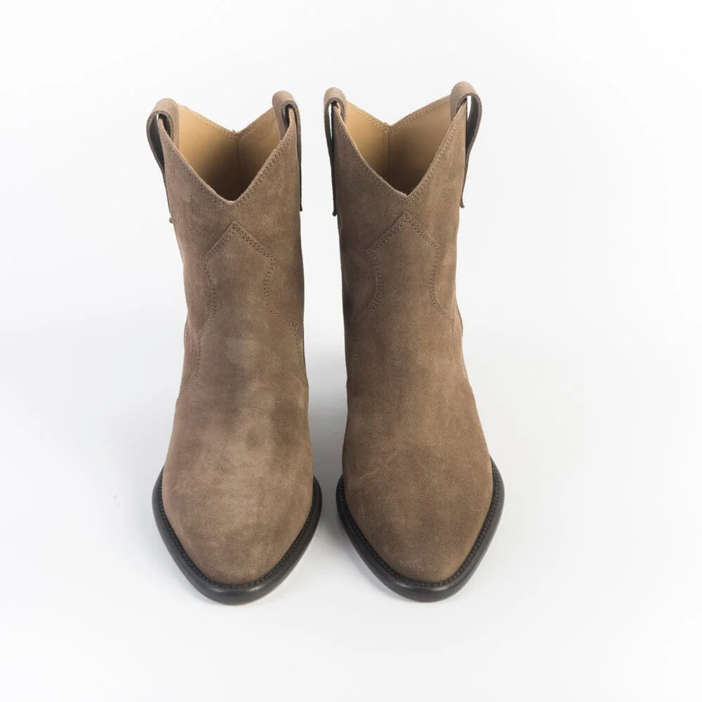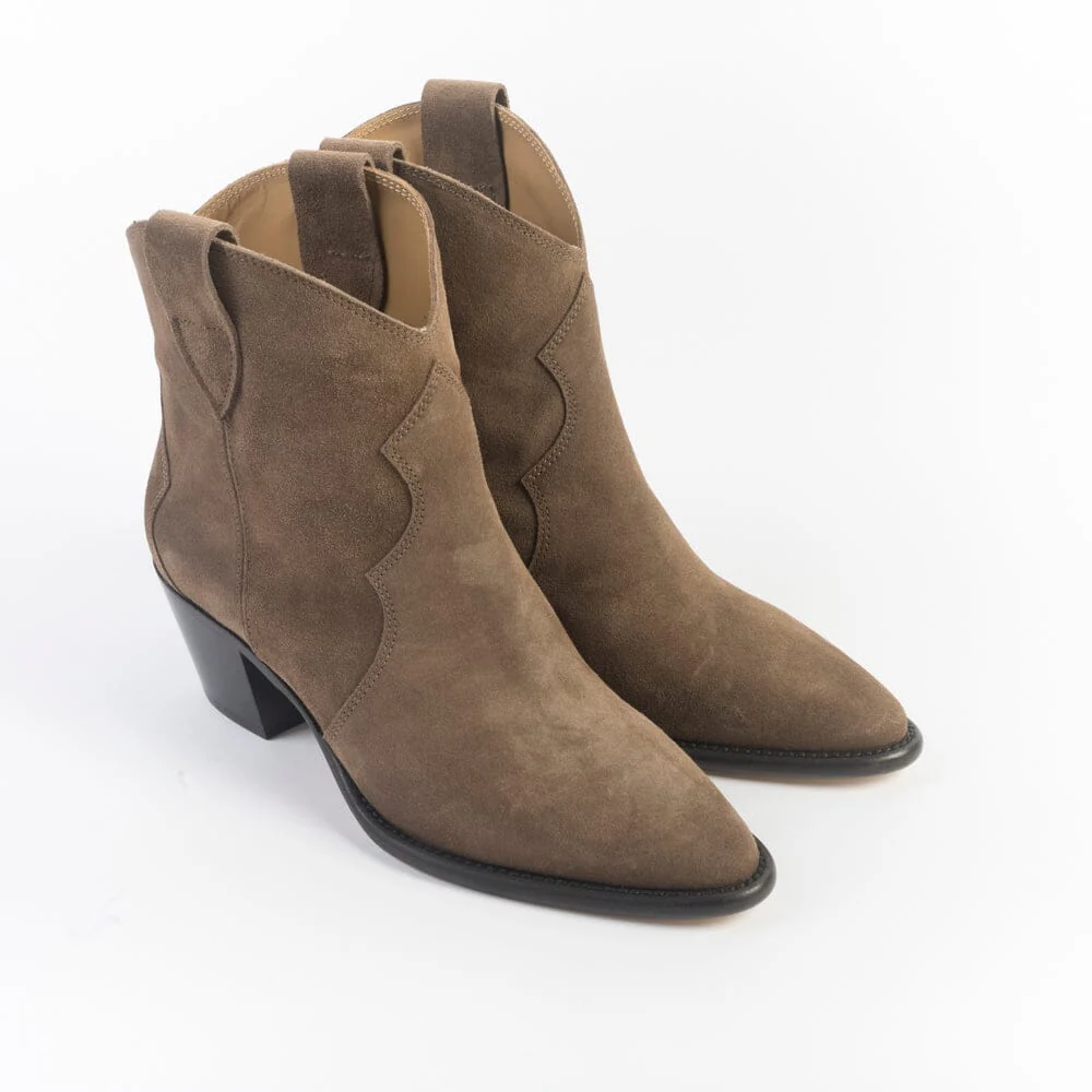 Stivaletto texano di Anna F, realizzato in morbido camoscio di colore taupe. Punta affusolata; scollo centrale a V. Suola in cuoio. Tacco in legno di 5 cm.