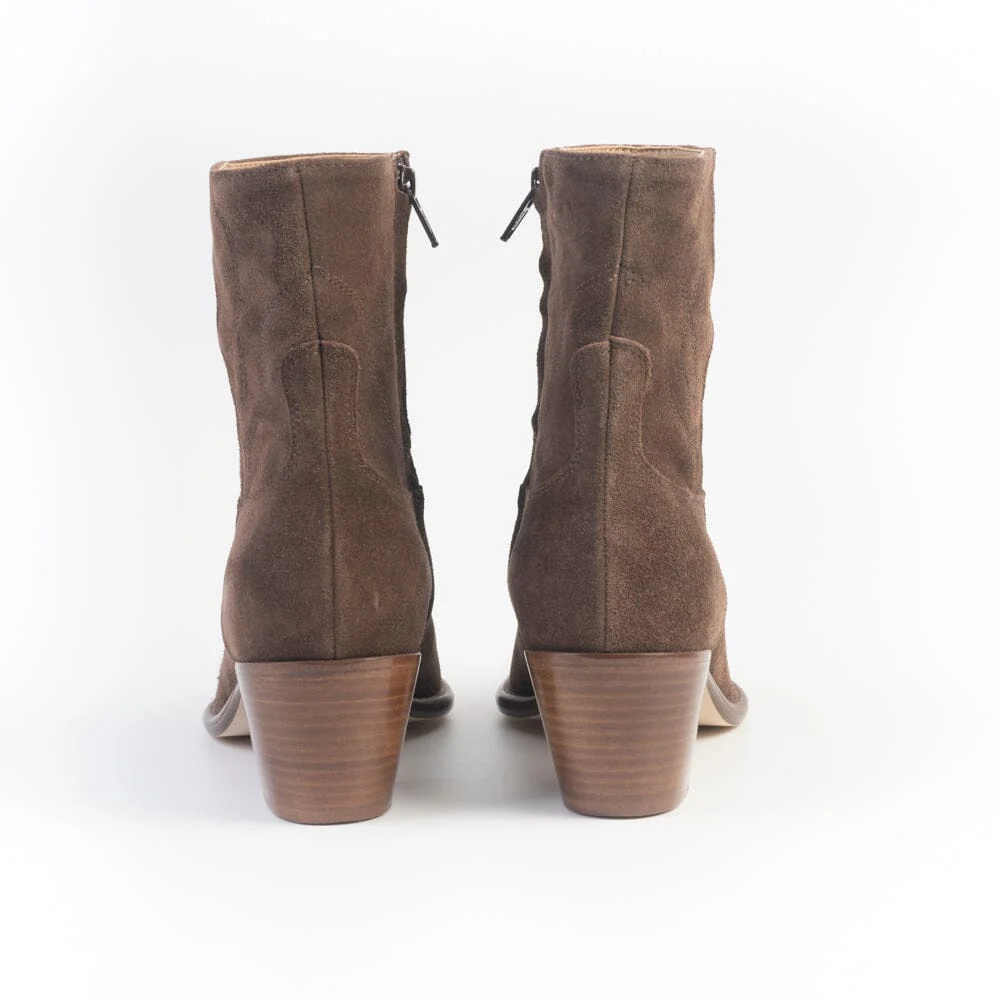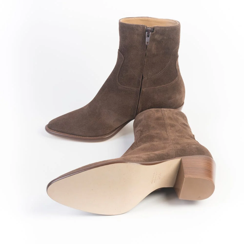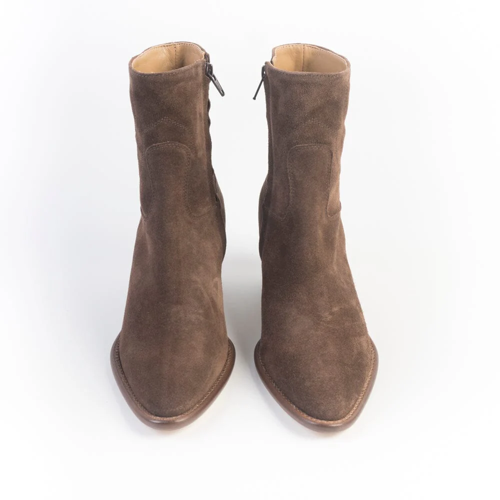 Stivaletto texano di Anna F, realizzato in morbido camoscio di colore caffè, fasciante in caviglia e impunture in nuance. Punta affusolata e zip interna per una calzata eccellente. Suola in cuoio. Tacco in legno di 5,5 cm.