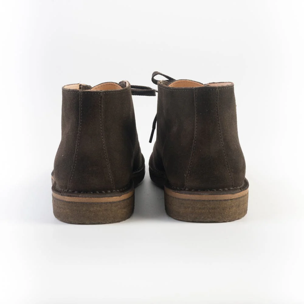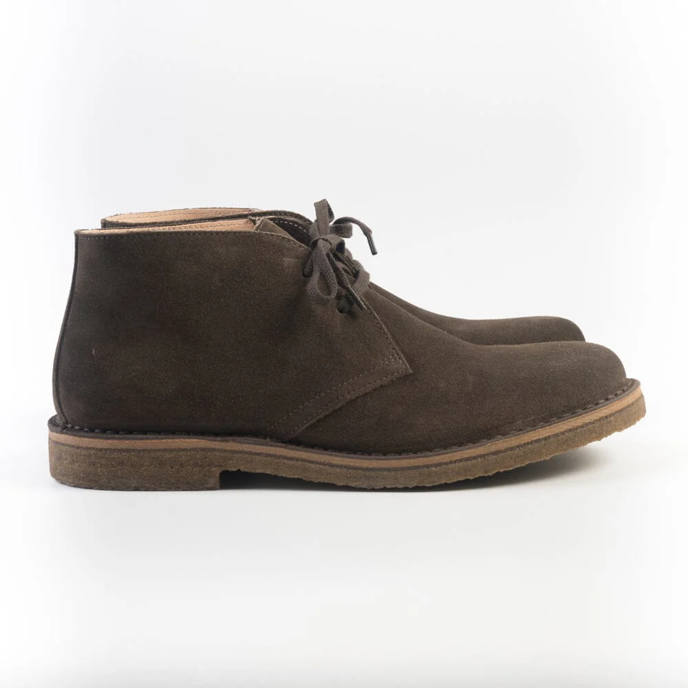 Polacco di Astorlflex realizzato artigianalmente in morbido camoscio di colore marrone scuro. Allacciatura due fori, lacci piatti, in cotone in nuance. Interno sfoderato, intersuola in cuoio e fibra di mais. Punta arrotondata. Suola in para naturale al 100%.