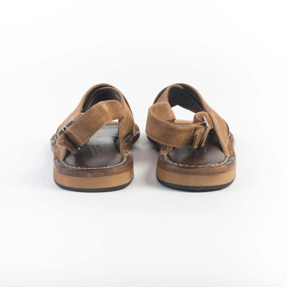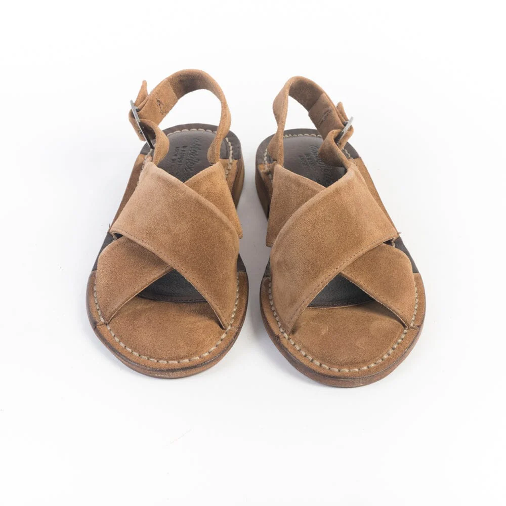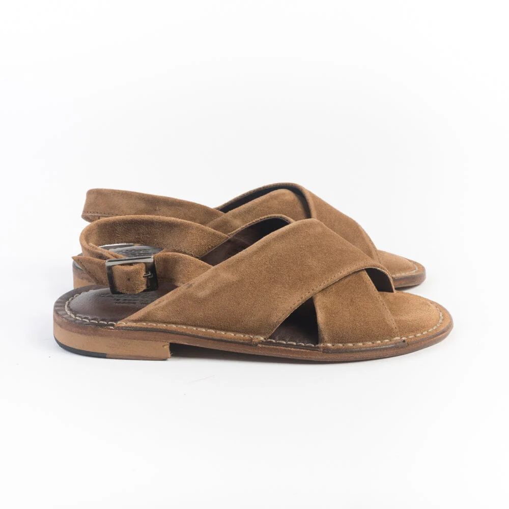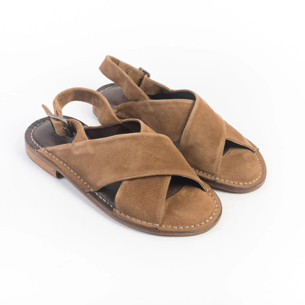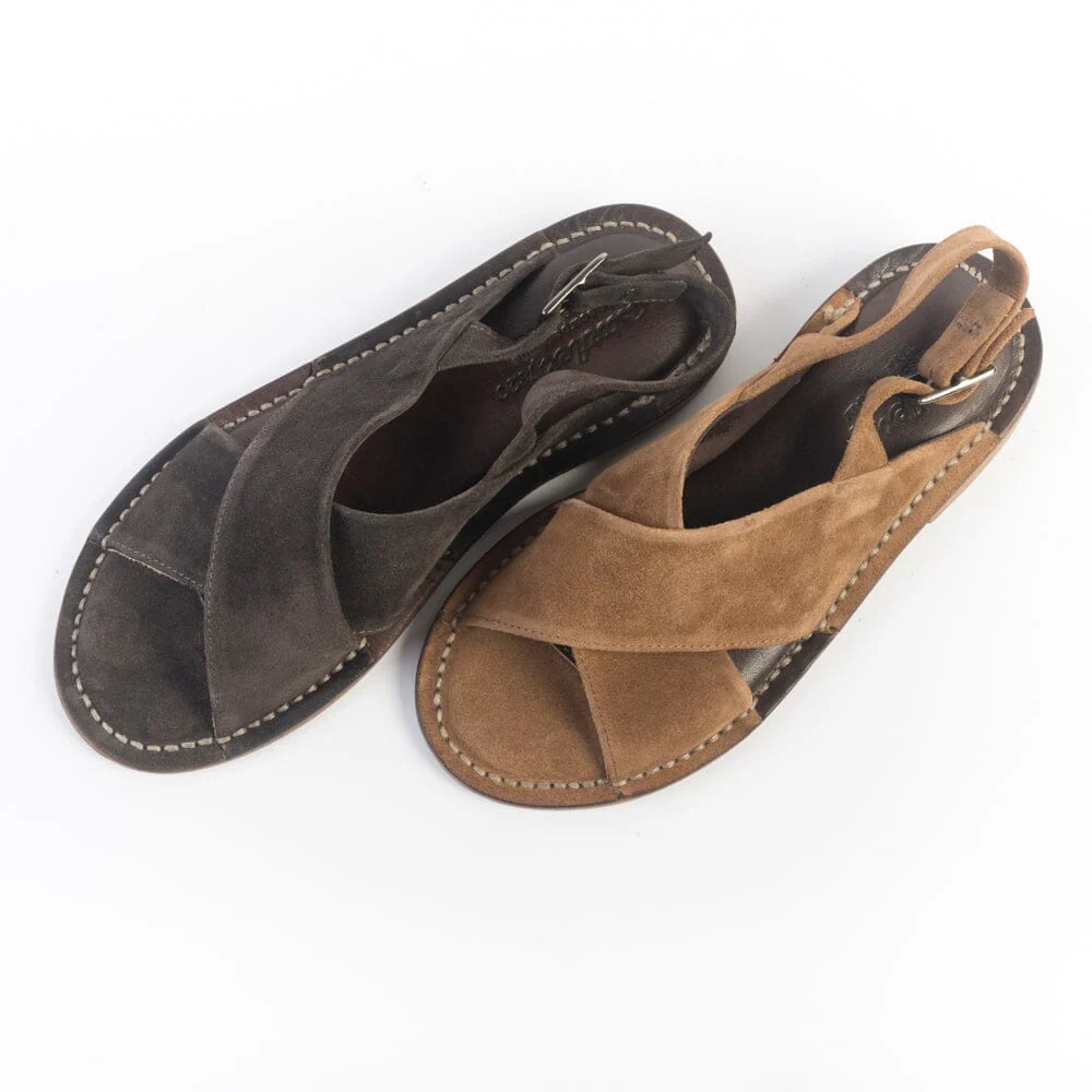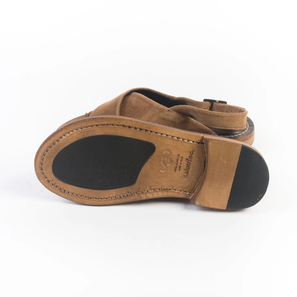Sandali bassi di Astorflex realizzati in morbido camoscio con tomaia formata da fascia incrociata di colore cuoio con cuciture in contrasto su guardolo. Chiusura regolabile sul tallone con cinturino. Soletto realizzato in vera pelle e camoscio. Suola, cucita, realizzata in bufalo con inserto in gomma.