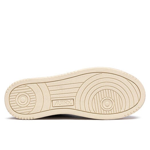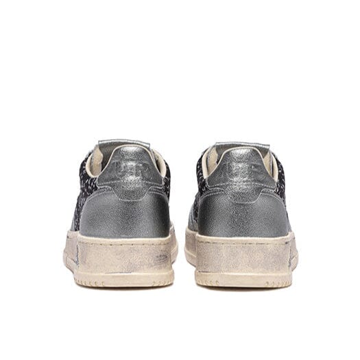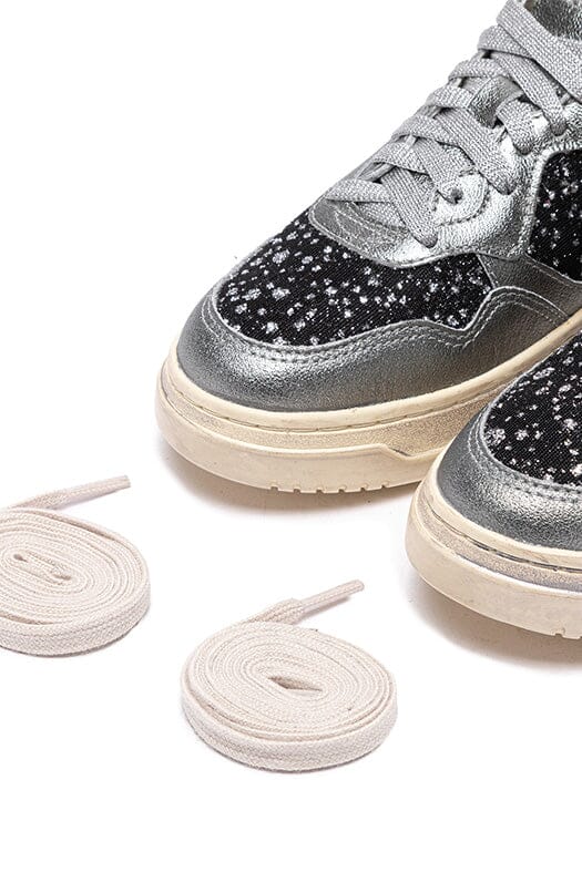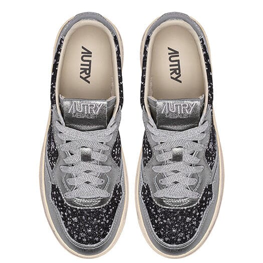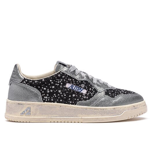 Iconica Medalist di Autry realizzata in pelle laminata di colore argento e tessuto nero con applicazione di glitter a pois. Applicazione di logo del marchio sui lati esterni. Lacci in nuance di colore argento e lacci di scorta in cotone di colore avorio. Suola in gomma di colore beige. Plantare interno estraibile.