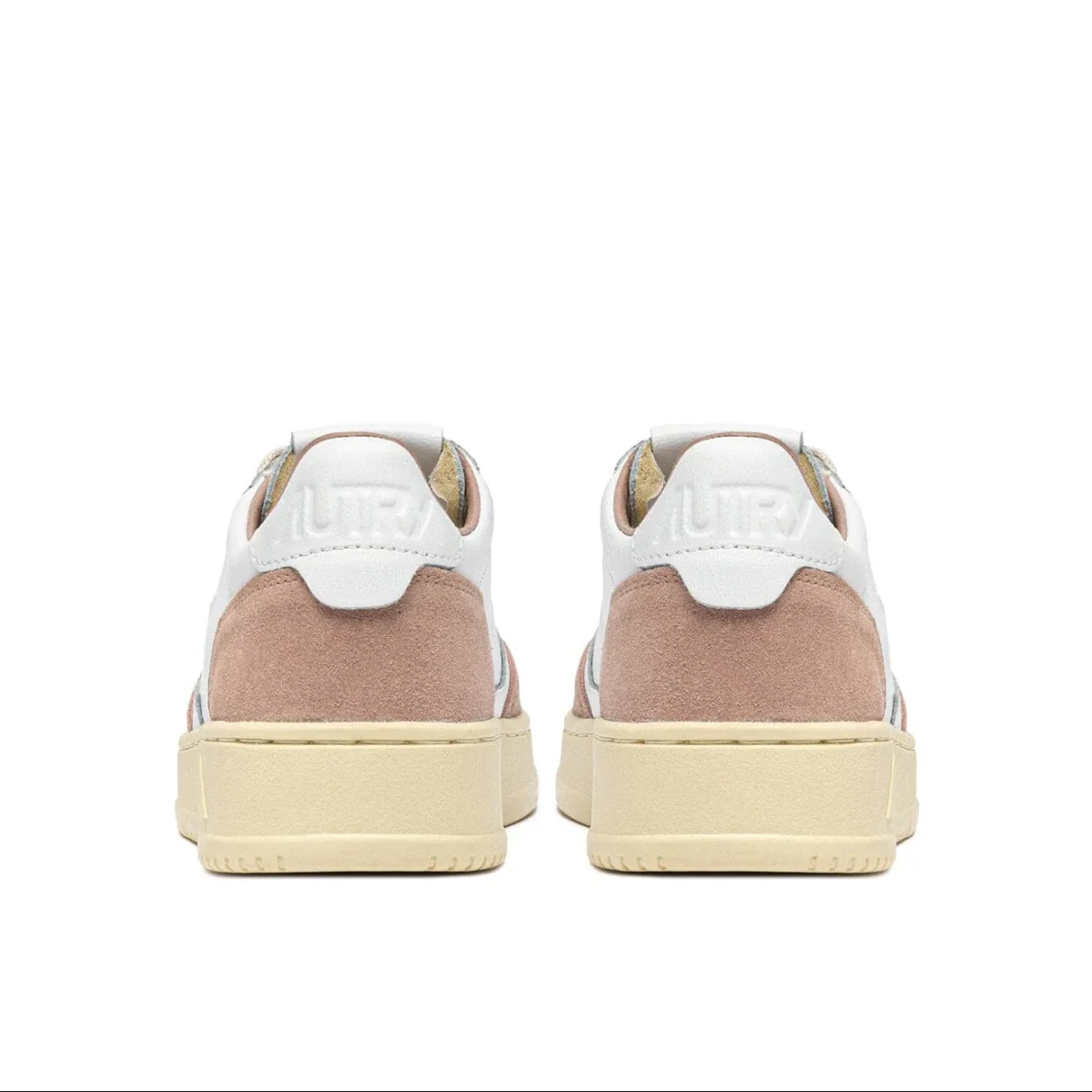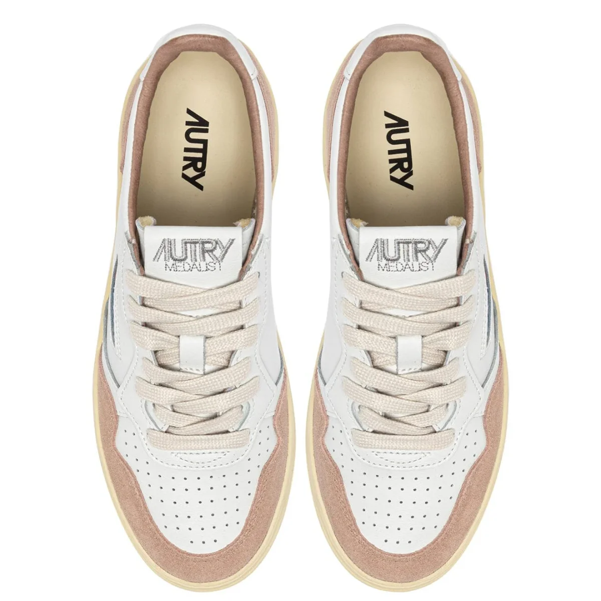 Iconica Medalist di Autry realizzata in pelle di colore bianco e dettagli in camoscio di colore rosa antico, con applicazione di logo del marchio con bandiera americana sui lati esterni. Suola in gomma in nuance. Lacci in cotone di colore avorio. Plantare interno estraibile.