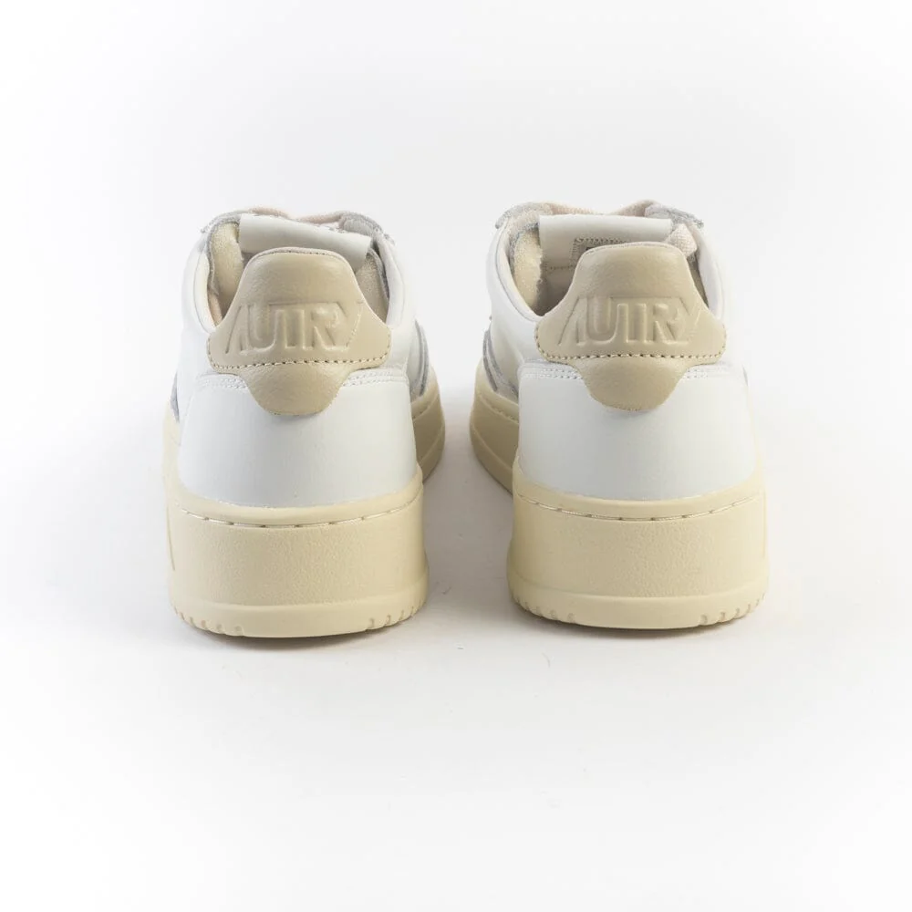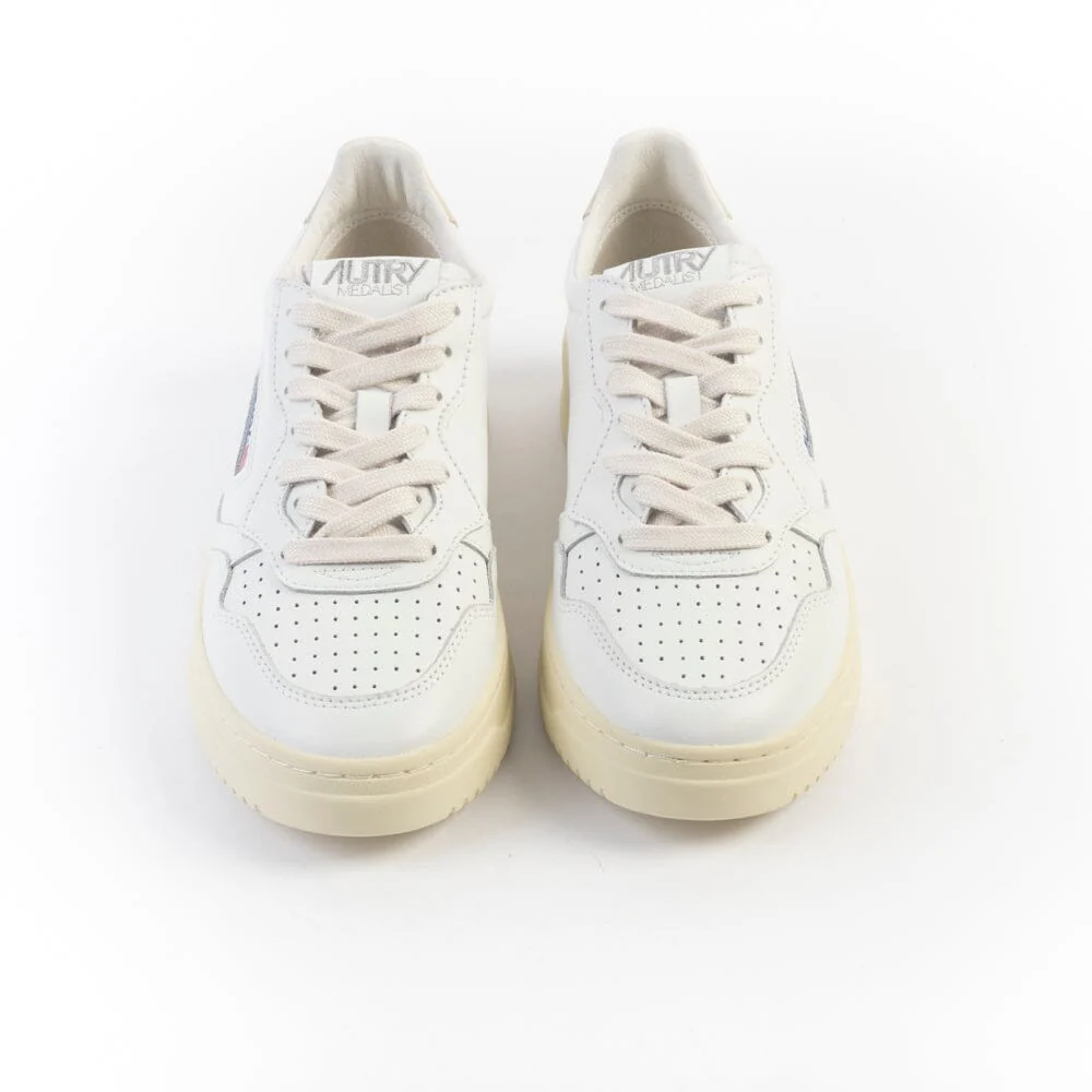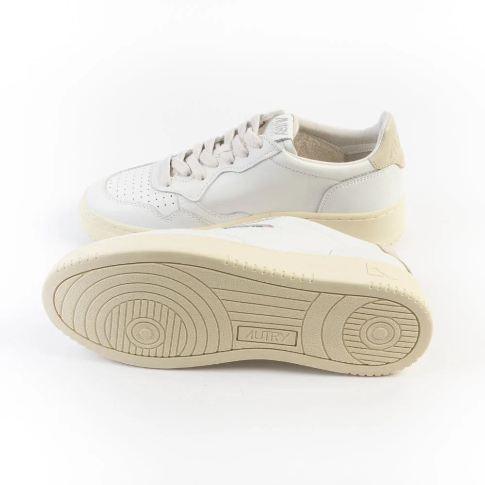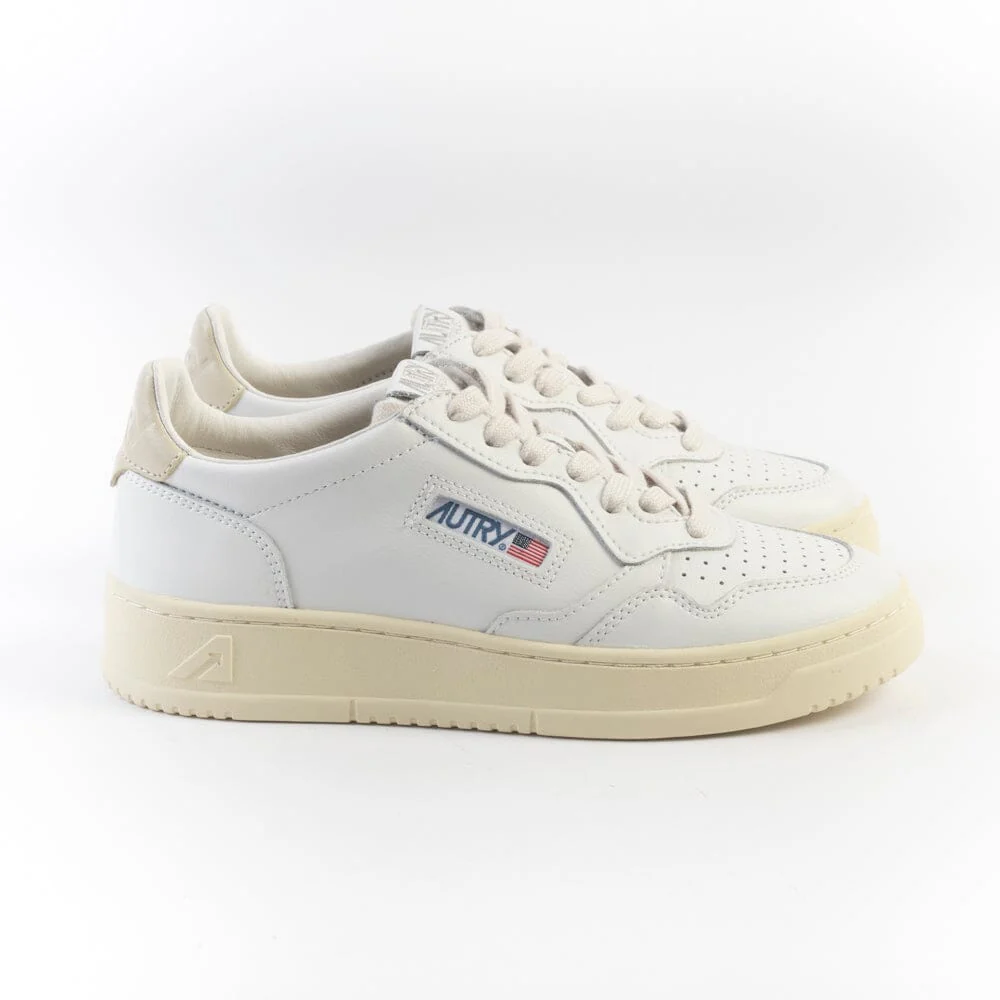 Riedizione della originale sneaker Autry in pelle bianca con applicazione di logo del marchio con bandiera americana sui lati esterni. Decorazione sul tallone in pelle di colore verde beige. Plantare interno estraibile.