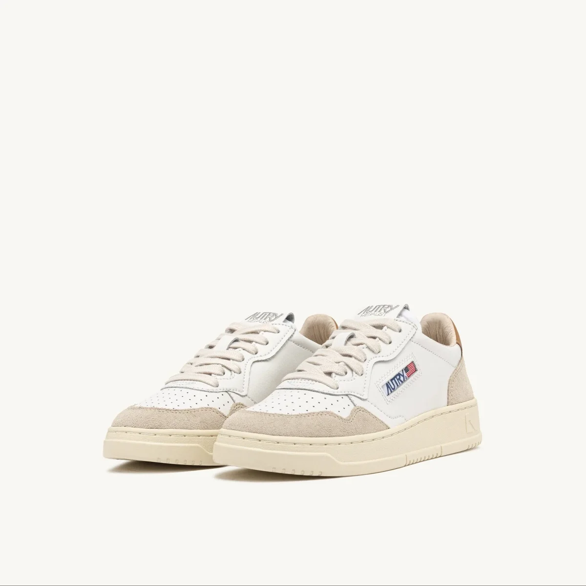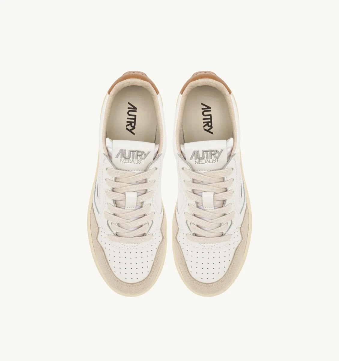 Classica Medalist di Autry, realizzata in pelle di colore bianco, camoscio di colore beige e dettaglio tallone in pelle di colore cammello. Lacci in cotone di colore avorio. Applicazione di logo del marchio con bandiera americana sui lati esterni. Suola in gomma di colore avorio. Plantare interno estraibile.
