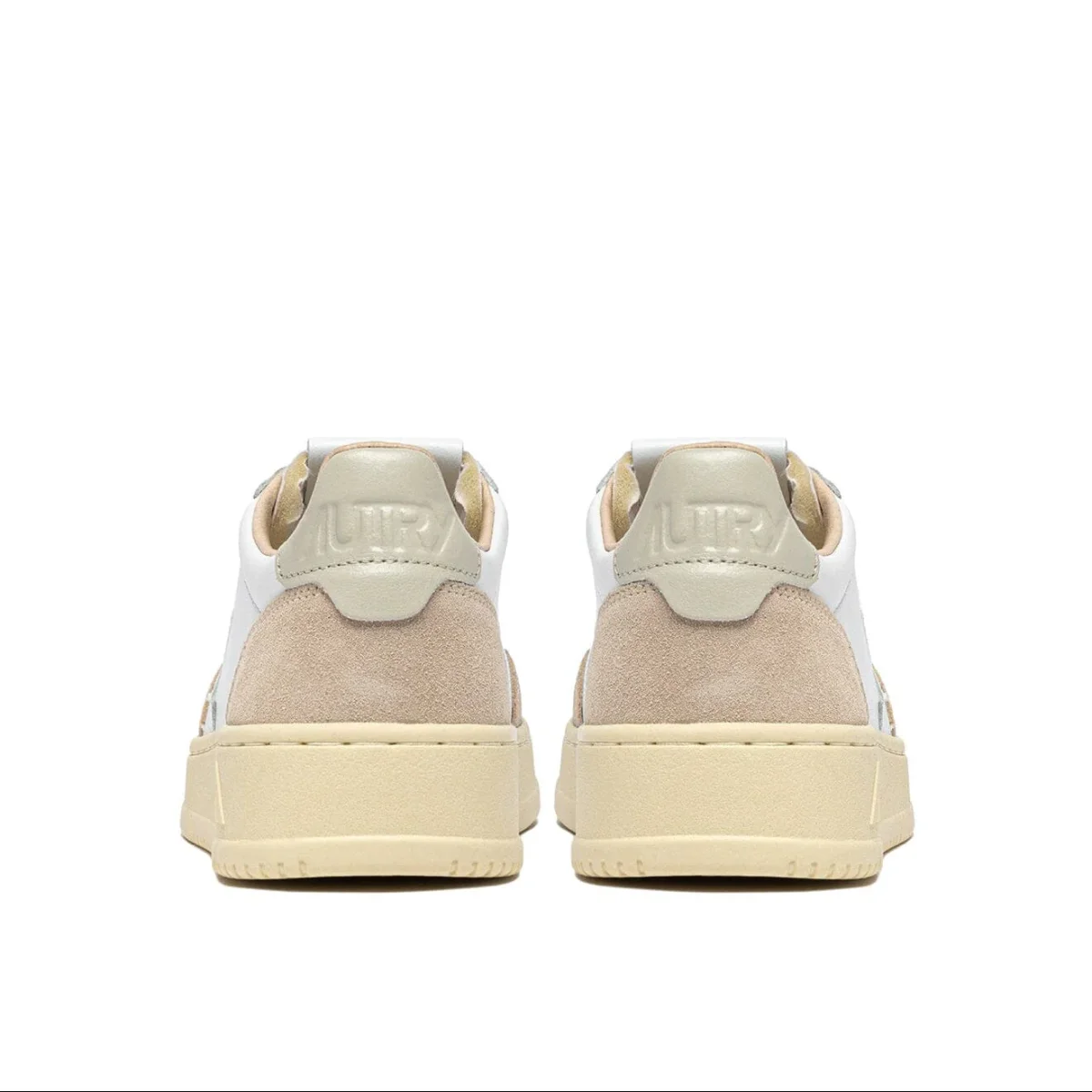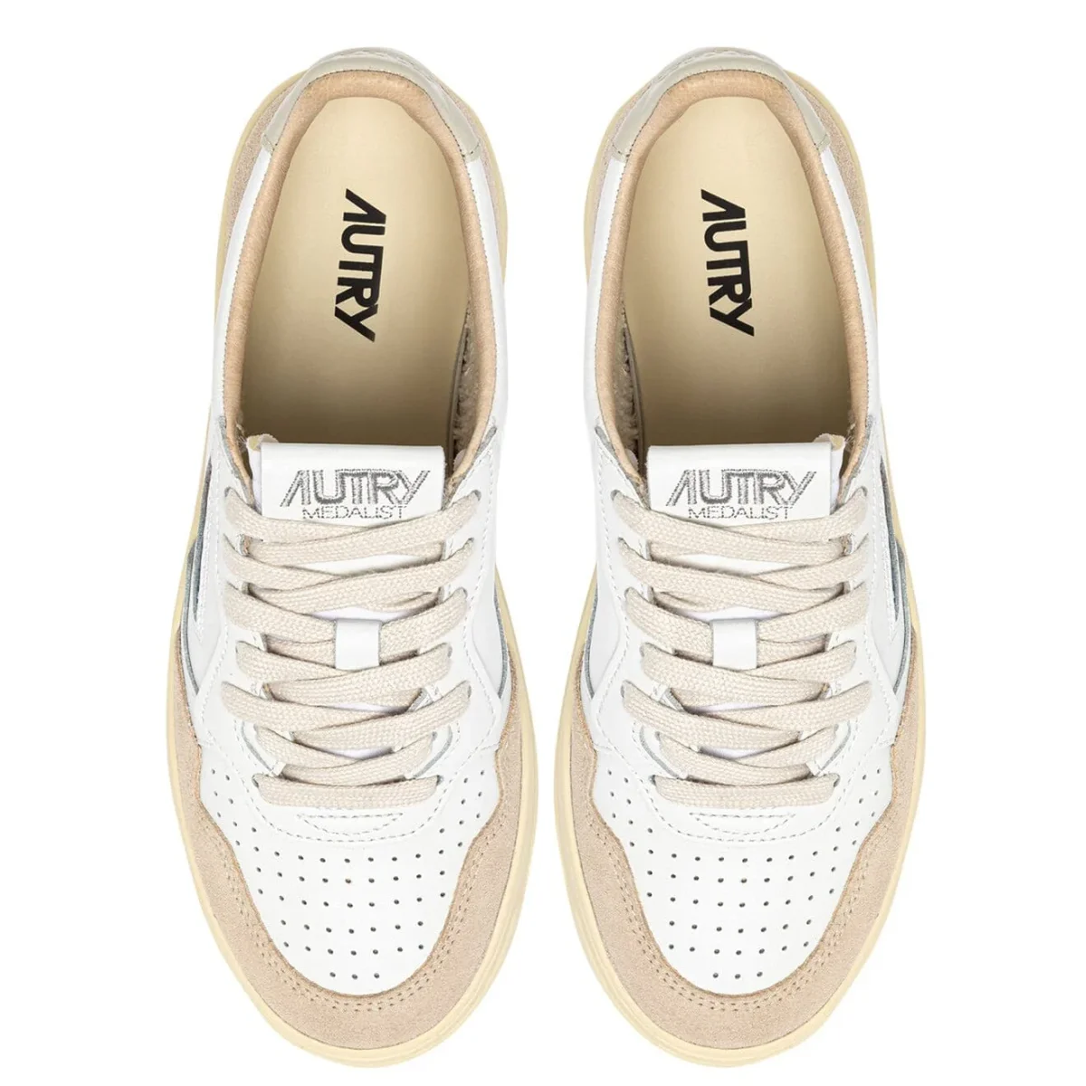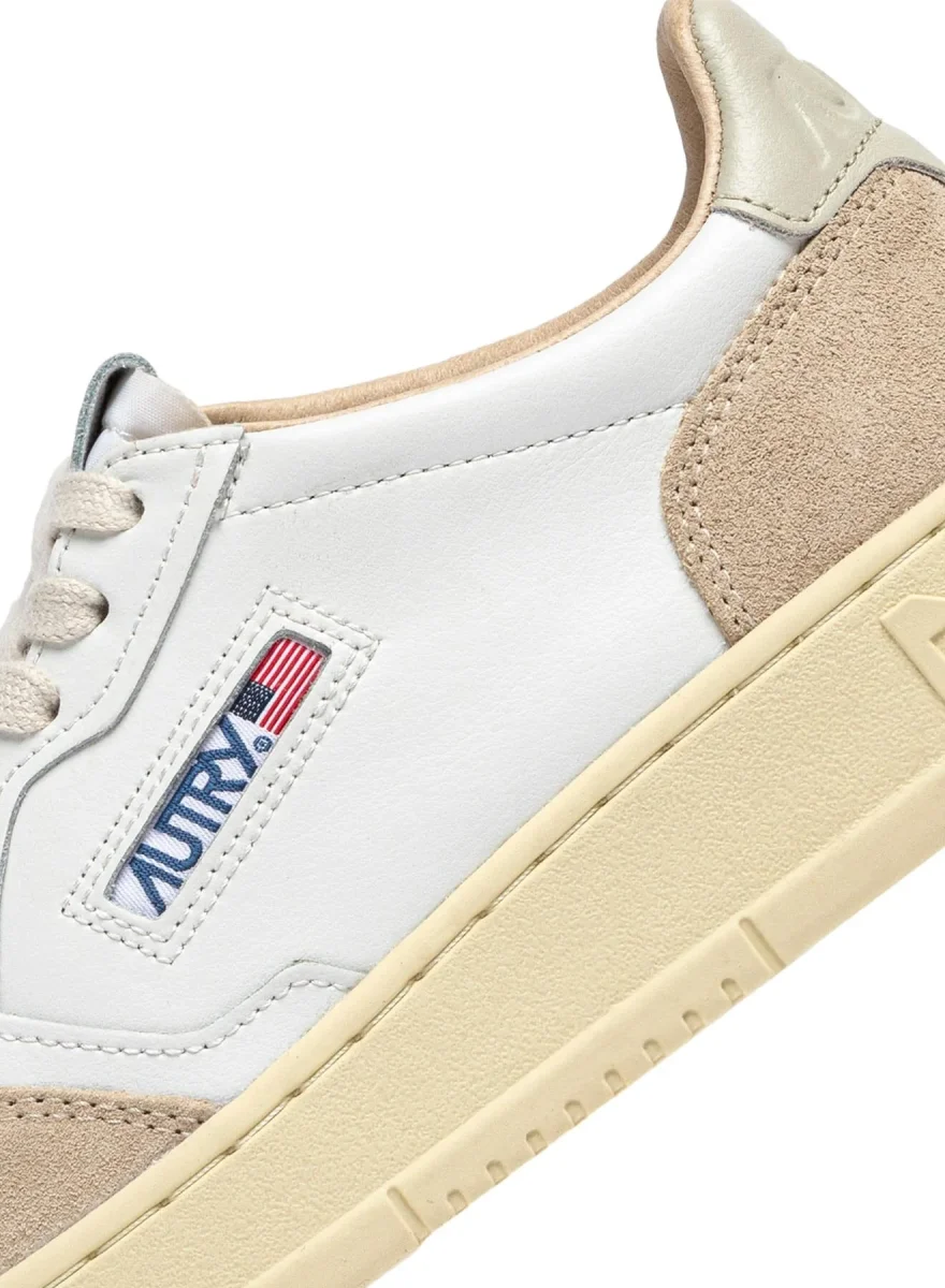 Iconica Medalist di Autry realizzata in morbida pelle liscia di colore bianco con dettagli in camoscio di colore avorio. Dettaglio tallone in pelle di colore tortora chiaro. Applicazione di logo del marchio con bandiera americana sui lati esterni. Lacci piatti in cotone di colore avorio. Suola in gomma in nuance.
