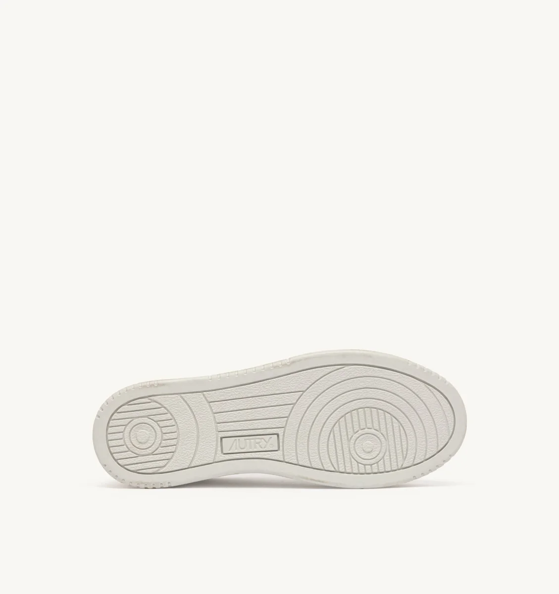 Edizione vintage della classica Medalist di Autry, realizzata in camoscio di colore avorio con strass di colore argento ad effetto vintage. Applicazione di logo del marchio con bandiera americana sui lati esterni e con lacci in cotone in nuance. Suola in gomma con effetti anticati di colore naturale. Plantare interno estraibile.