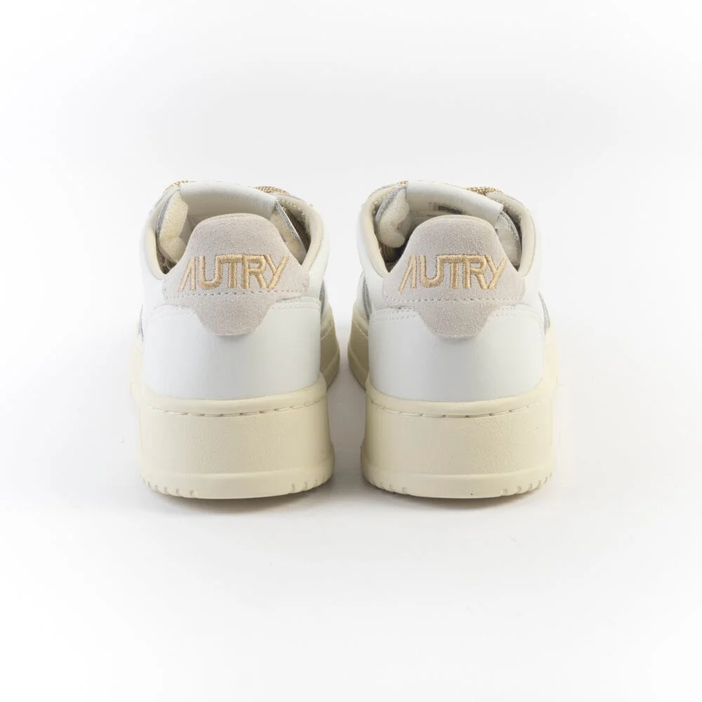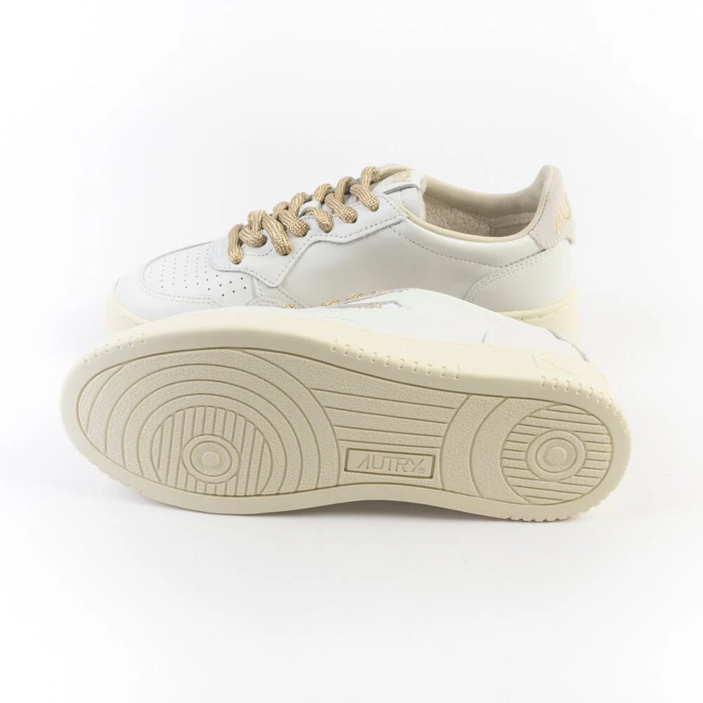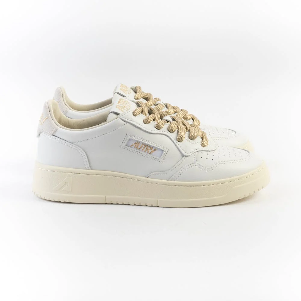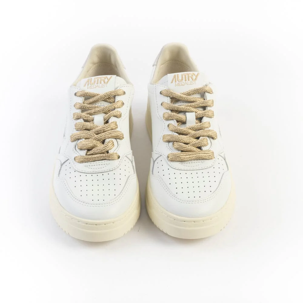 Sneakers medalist di Autry realizzate in pelle bianca, tallone in camoscio beige con ricamo del logo di colore oro e anche sui lati esterni. Lacci laminati, di colore oro e lacci di scorta di colore avorio. Plantare interno estraibile.