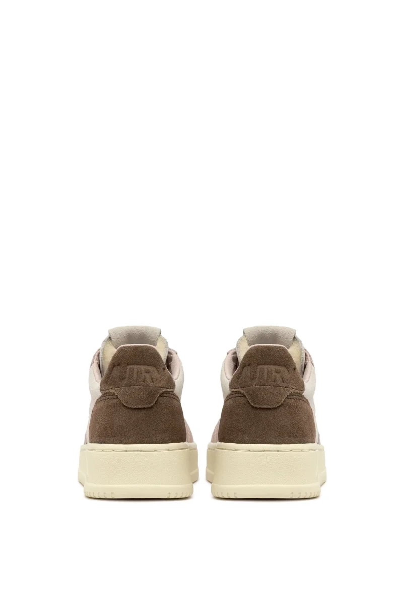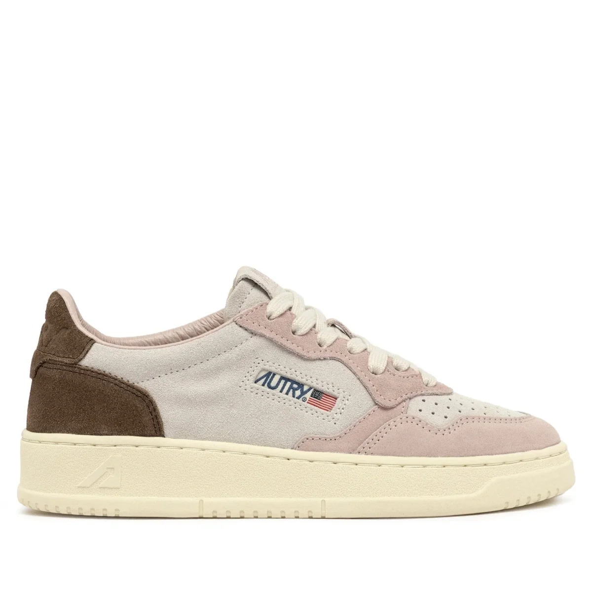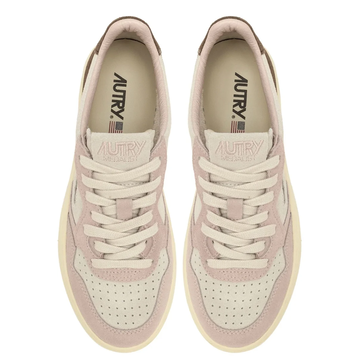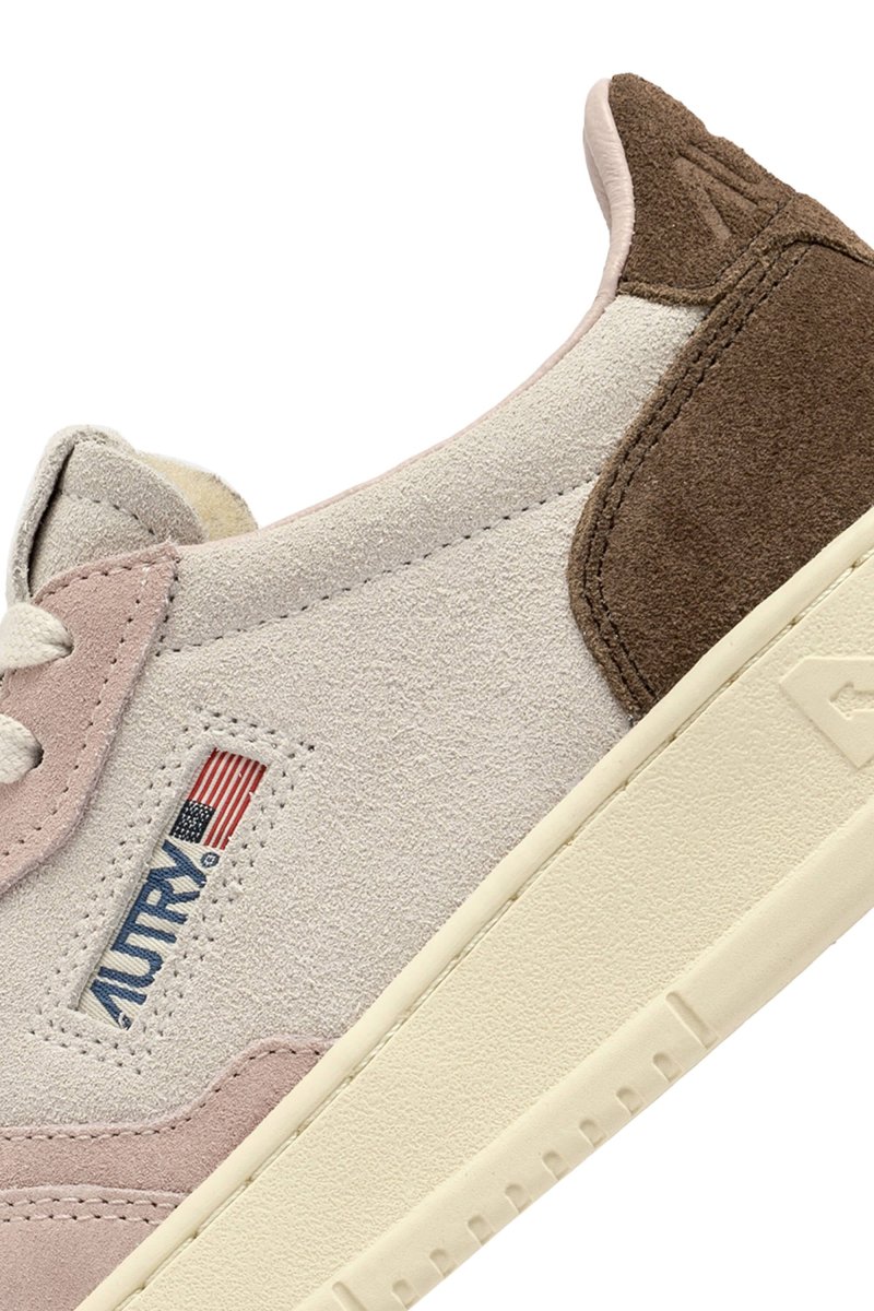 Riedizione delle originali sneakers Medalist di Autry realizzate in camoscio beige, rosa e marrone scuro, con applicazione di logo del marchio con bandiera americana sui lati esterni. Lacci in cotone di colore avorio. Plantare interno estraibile.