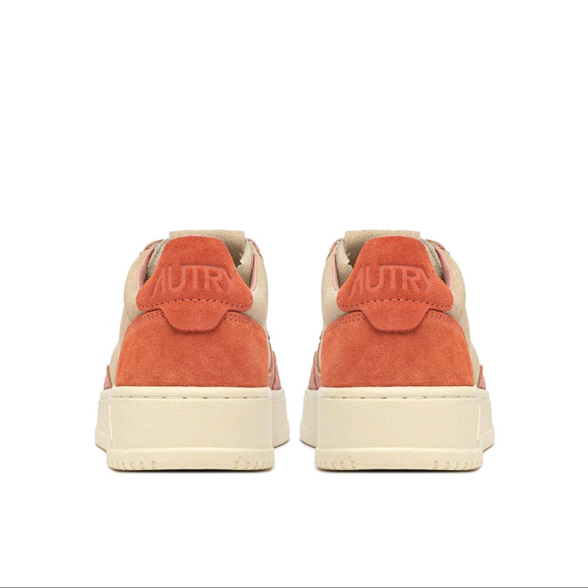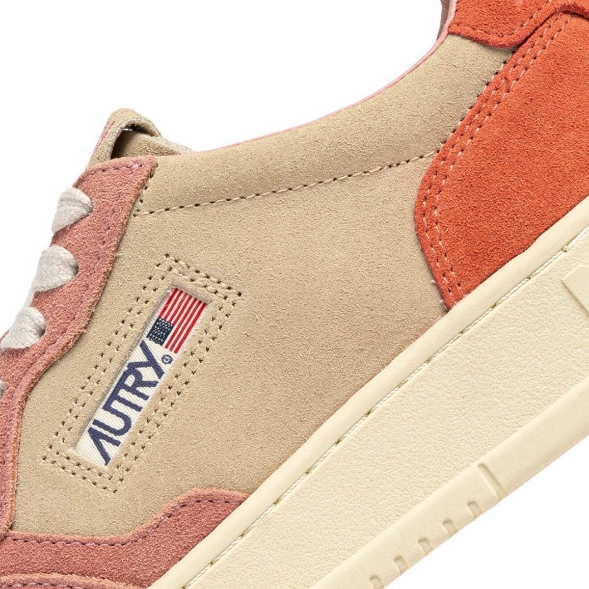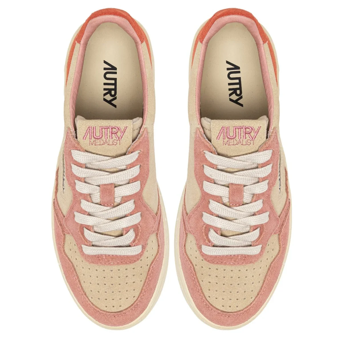 Iconica Medalist di Autry realizzata in pelle scamosciata di colore beige, con dettagli in camoscio di colore rosa antico sul davanti e corallo sul tallone, con applicazione di logo del marchio con bandiera americana sui lati esterni. Suola in gomma di colore avorio. Lacci in cotone di colore avorio. Plantare in pelle estraibile.