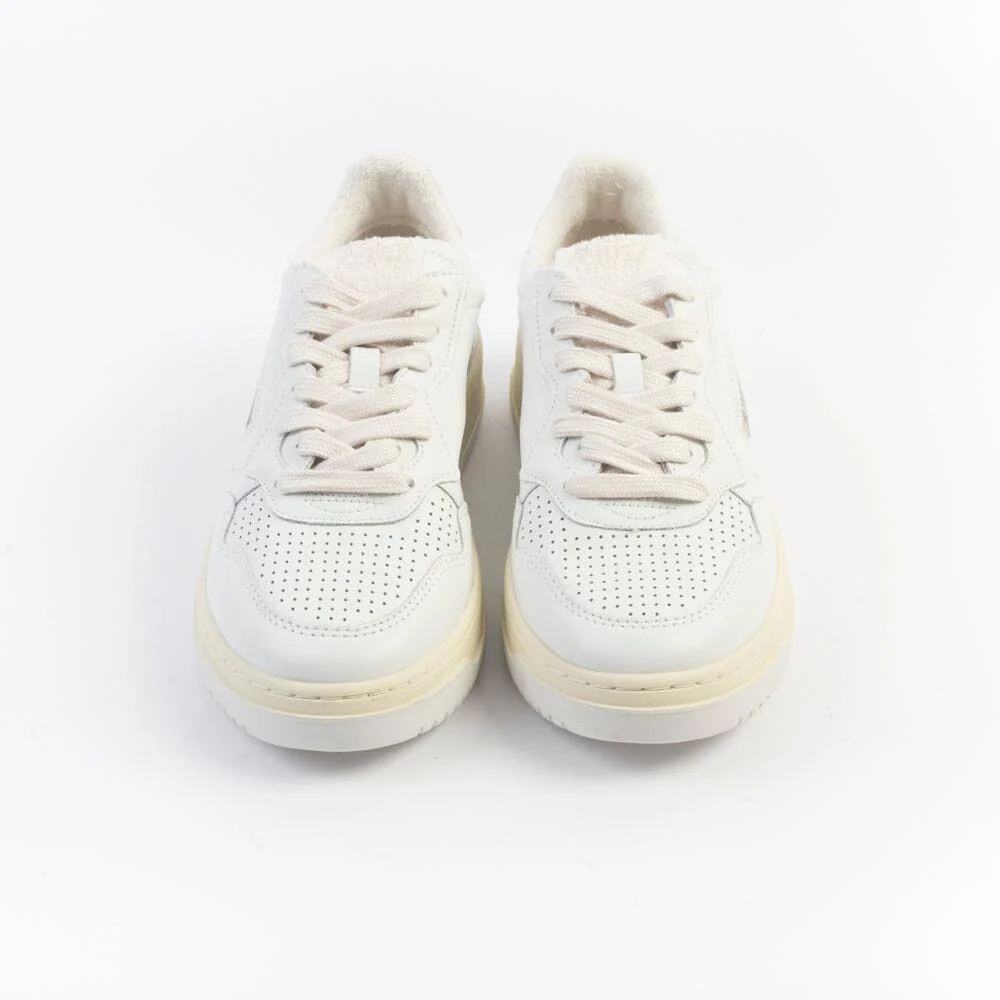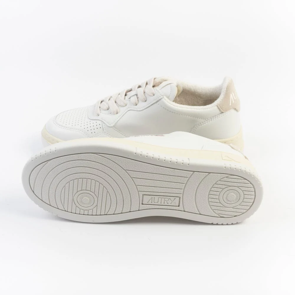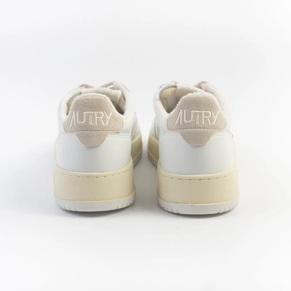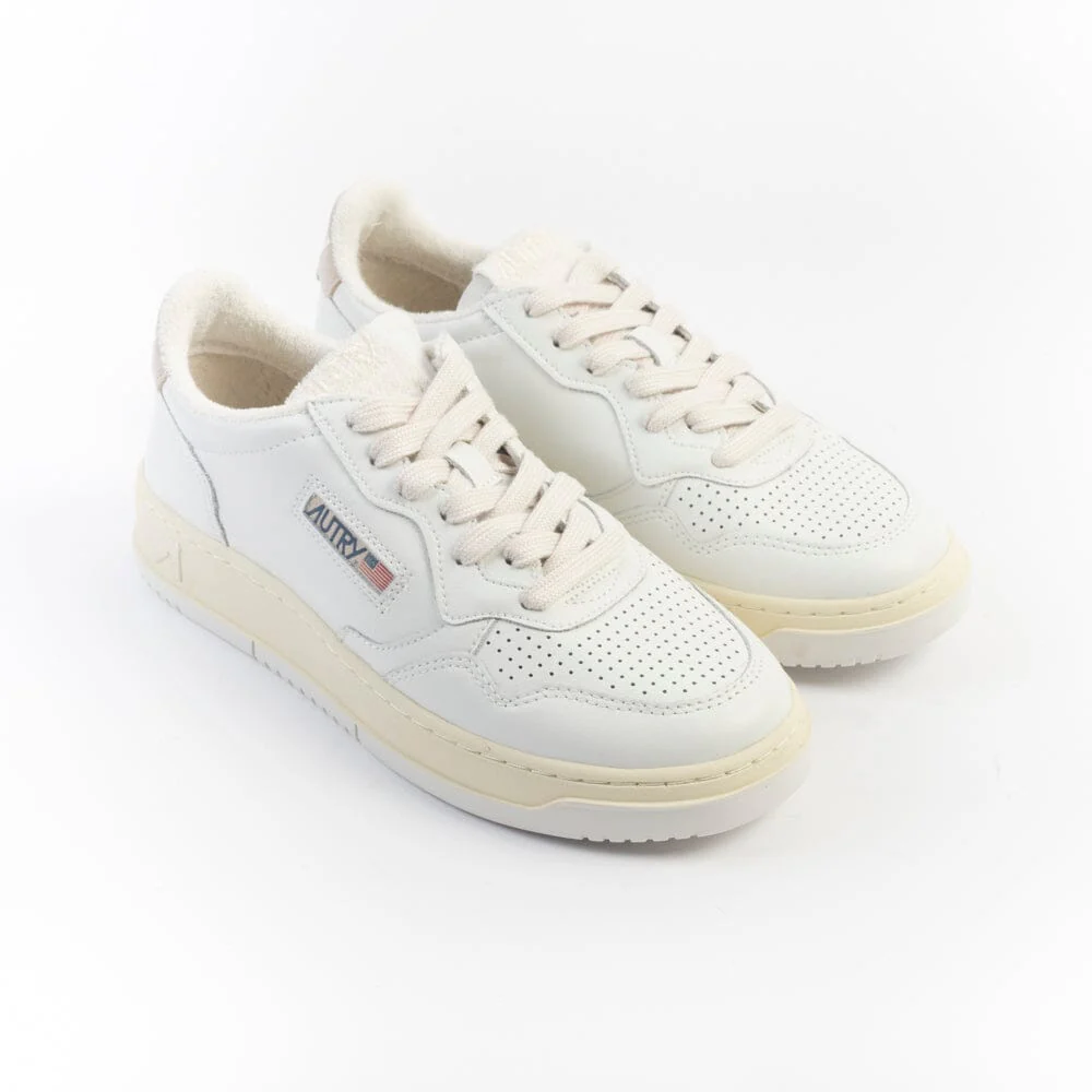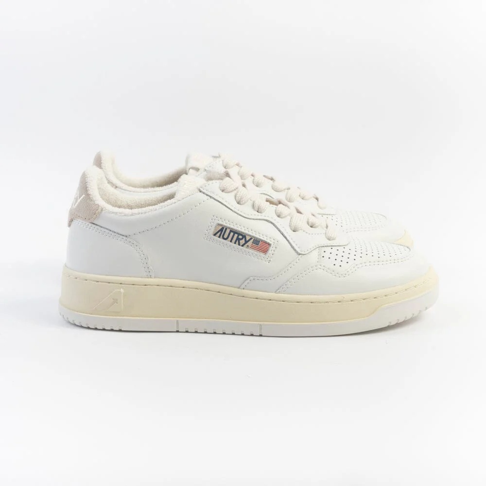Originale sneakers Autry modello Medalist in pelle bianca e tallone in camoscio di colore avorio, con applicazione logo del marchio con bandiera americana sui lati esterni. Interno della scarpa in leggera spugna in nuance. Suola in gomma di colore avorio. Plantare interno estraibile.