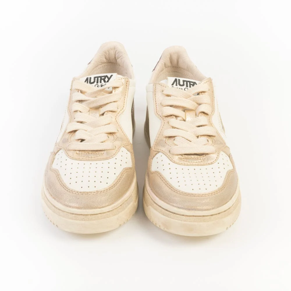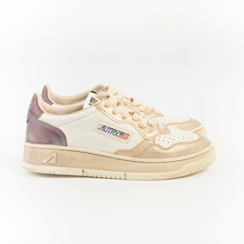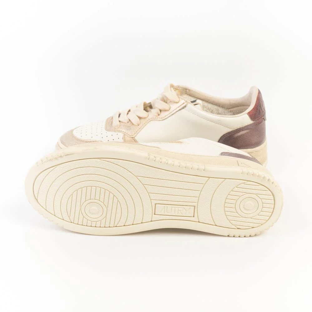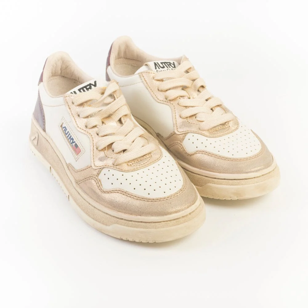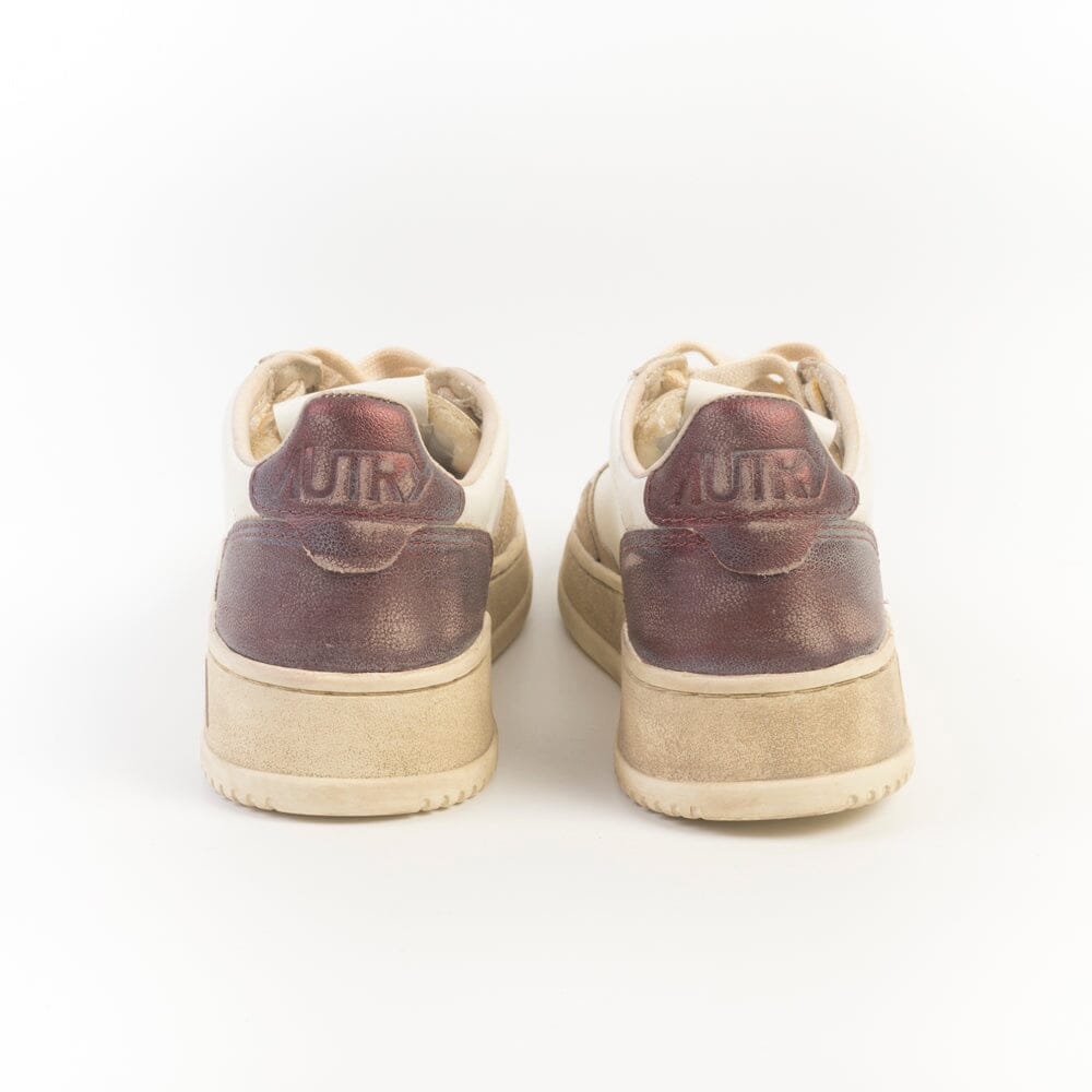 Edizione vintage della classica Medalist di Autry, realizzata in pelle di colore avorio, con inserti in pelle vintage di colore bordeaux e oro laminato. Applicazione di logo del marchio con bandiera americana sui lati esterni. Suola in gomma con effetti anticati di colore avorio. Lacci in cotone di colore beige vintage. Plantare in pelle estraibile. Plantare interno estraibile.