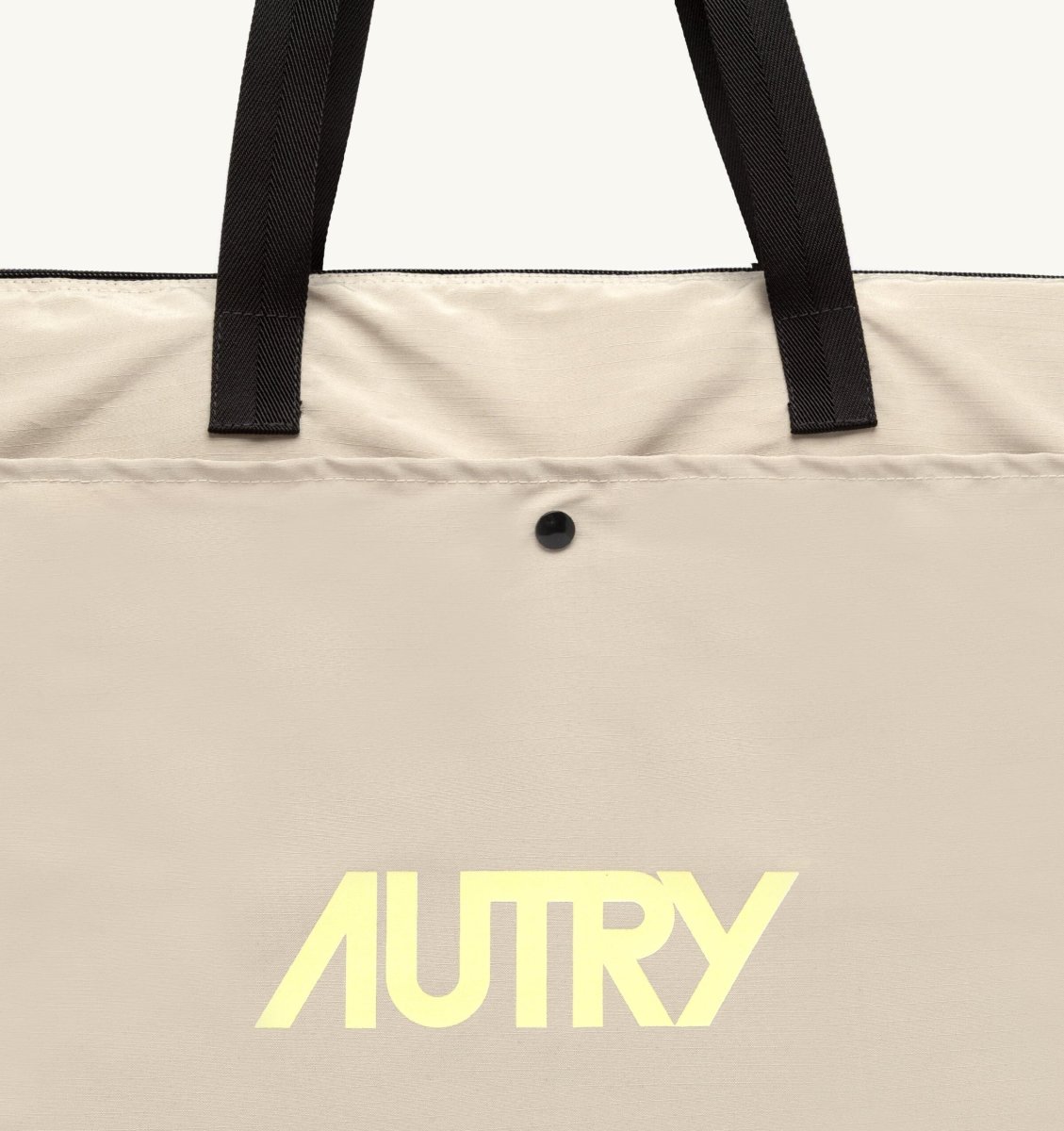 Borsa di Autry modello shopping a spalla, realizzata in nylon di colore corda beige. Pratica grande tasca sul davanti con chiusura con bottone automatico e logo Autry stampato di colore giallo. Chiusura con zip, manici in contrasto di colore nero. Pratica pochette coordinata interna staccabile.