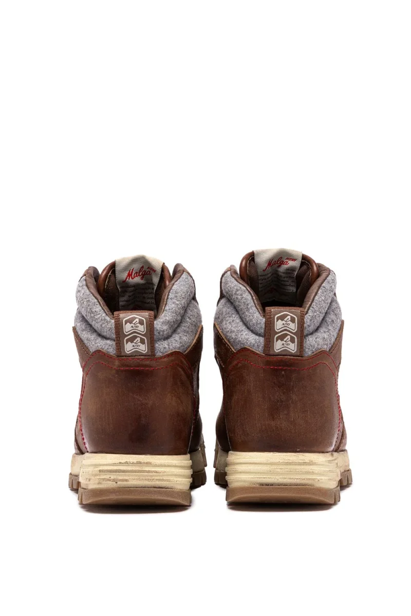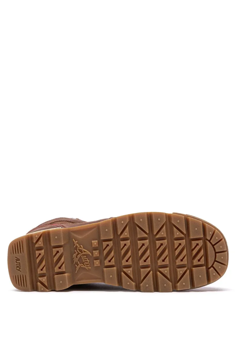 Nuovo stivaletto modello Malga di Autry, ideale per vivere l’inverno tra sport, neve e apres sky. Interamente in pelle con effetto vintage di colore cuoio con dettagli in lana di colore grigio nel tallone. Applicazione di logo del marchio con bandiera americana sui lati esterni. Lacci di cotone di colore rosso e bianco più lacci di ricambio, in cotone, piatti di colore marrone. Suola in gomma antiscivolo per camminare in montagna di colore gomma naturale.