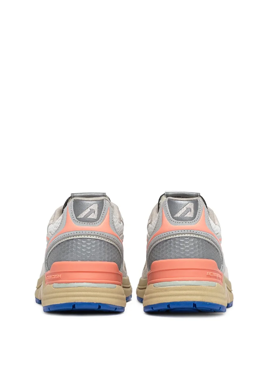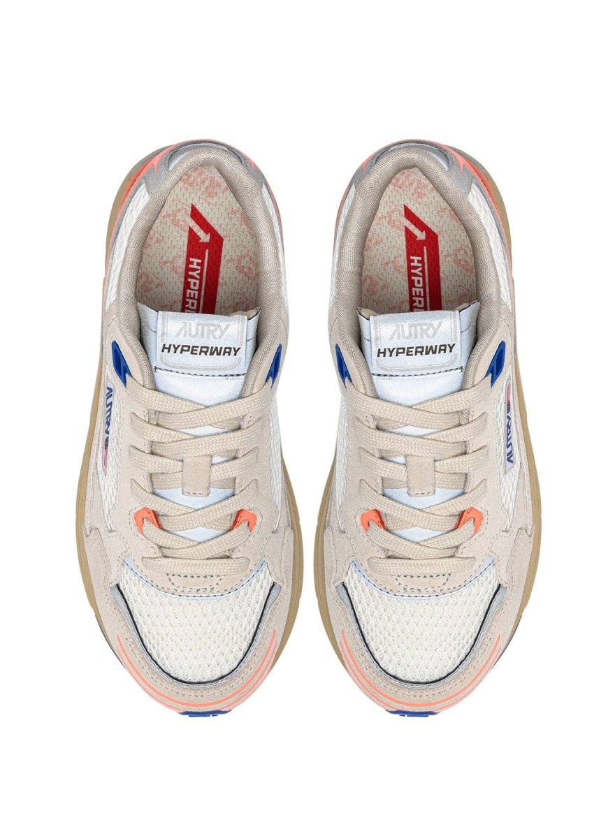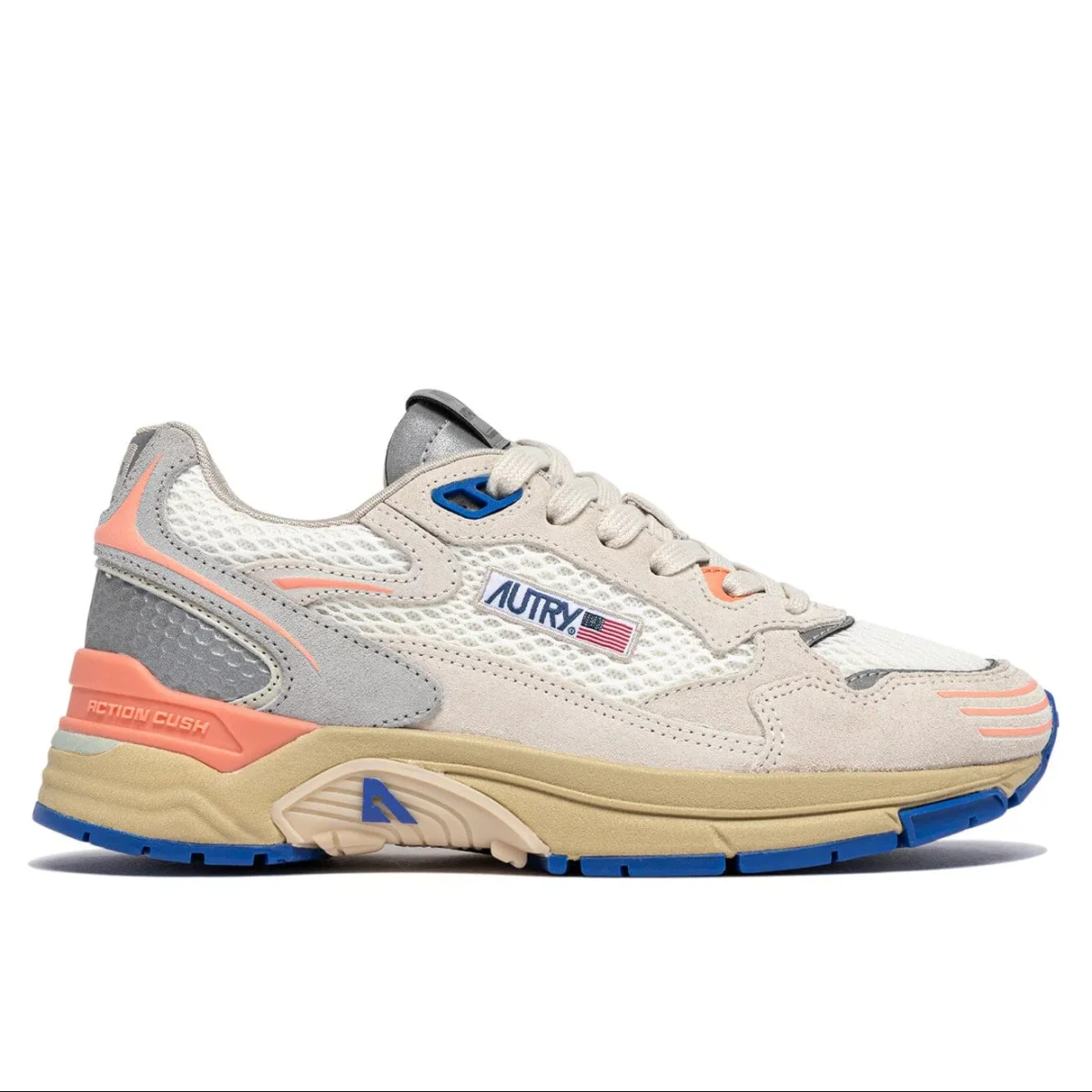 Sneakers Hyperway di Autry realizzate in camoscio di colore grigio e mesh di colore bianco con inserti gommati di colore corallo. Lacci piatti in cotone, di colore avorio. Dettagli di colore grigio e corallo sul tallone con profili rifrangenti. Linguetta centrale in materiale catarifrangente. Altezza suola 3,5 cm dotata di tecnologia Action Cush che garantisce una maggiore ammortizzazione e un comfort ottimale.