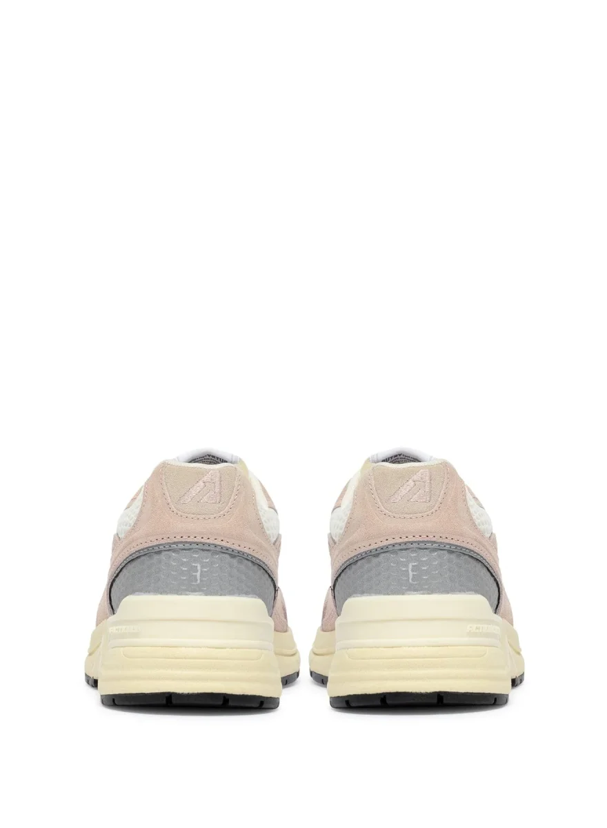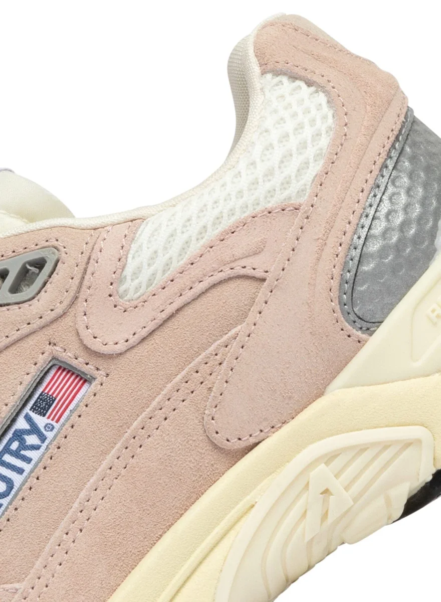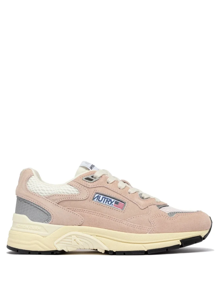 Sneakers Hyperway di Autry realizzate in camoscio di colore rosa e mesh di colore rosa e avorio. Lacci piatti in cotone, di colore avorio. Dettagli di colore grigio sul tallone e profili rifrangenti di colore grigio. Altezza suola 3,5 cm dotata di tecnologia Action Cush che garantisce una maggiore ammortizzazione e un comfort ottimale.