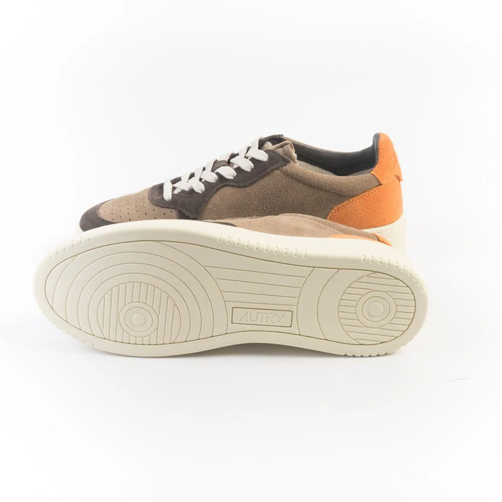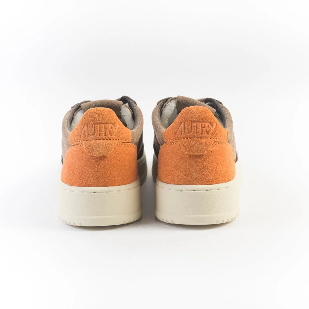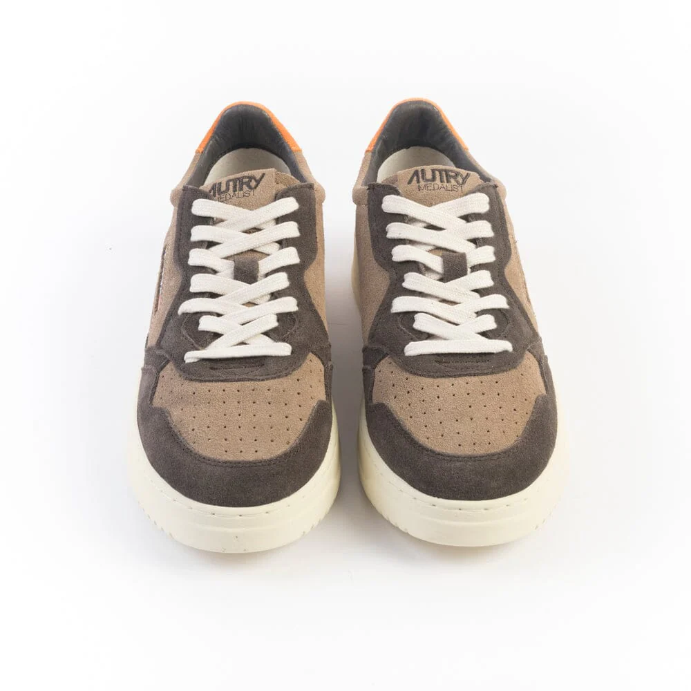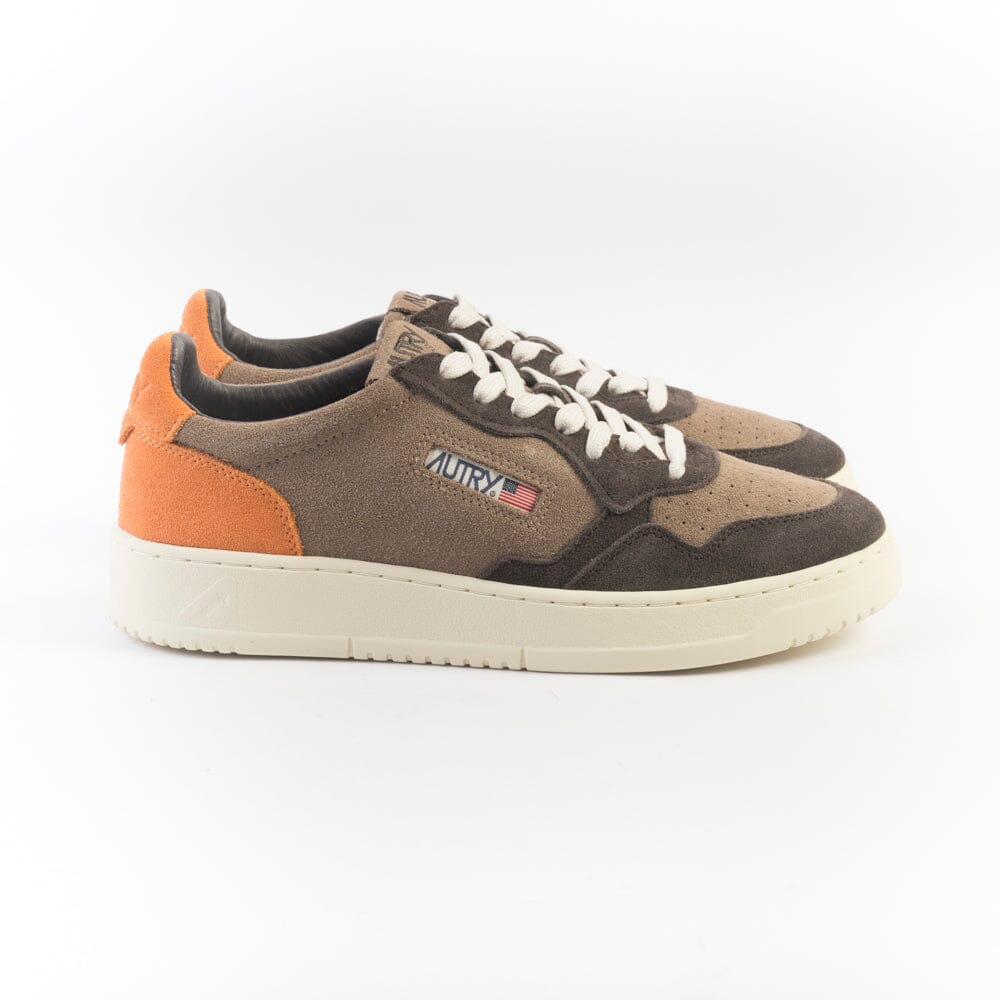 Iconica Medalist di Autry realizzata in camoscio nelle sfumature dei colori marrone, caffè e arancione, con applicazione di logo del marchio con bandiera americana sui lati esterni. Tallone in camoscio di colore arancione. Suola in gomma. Lacci in cotone di colore avorio.