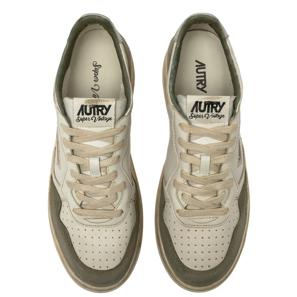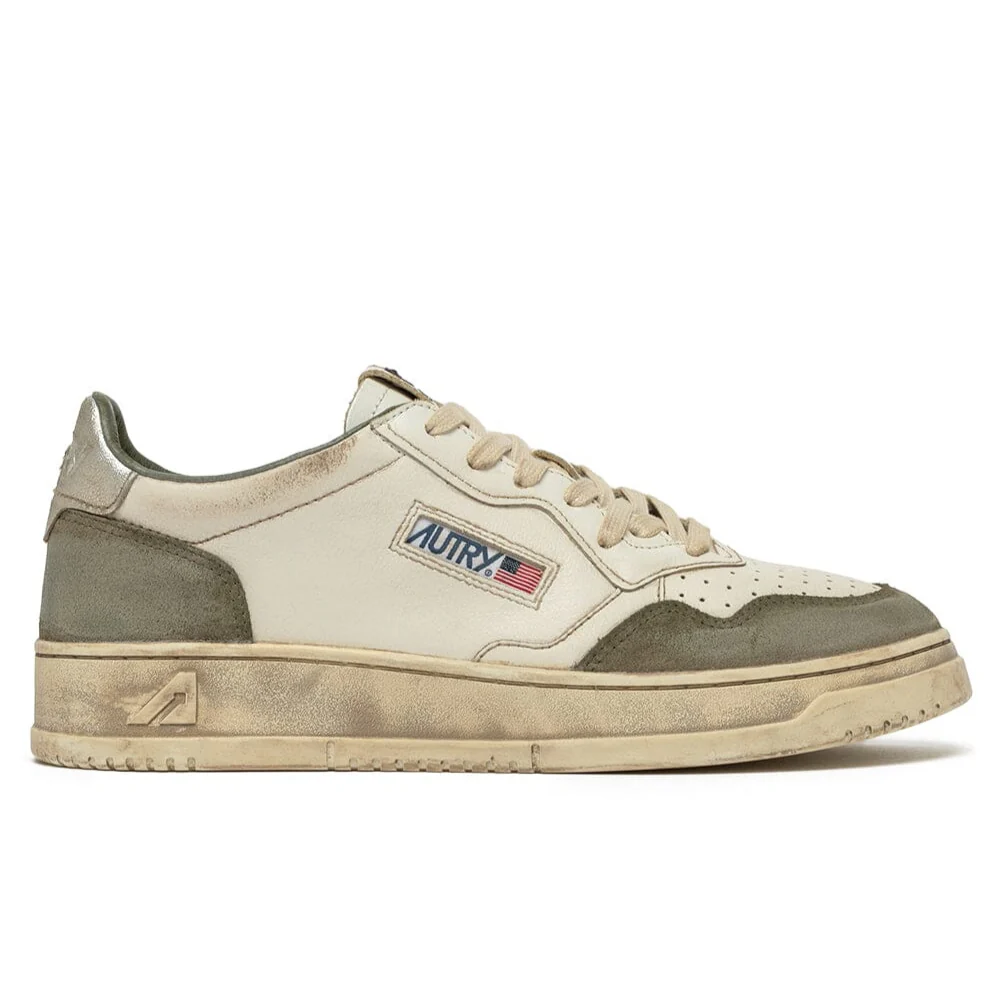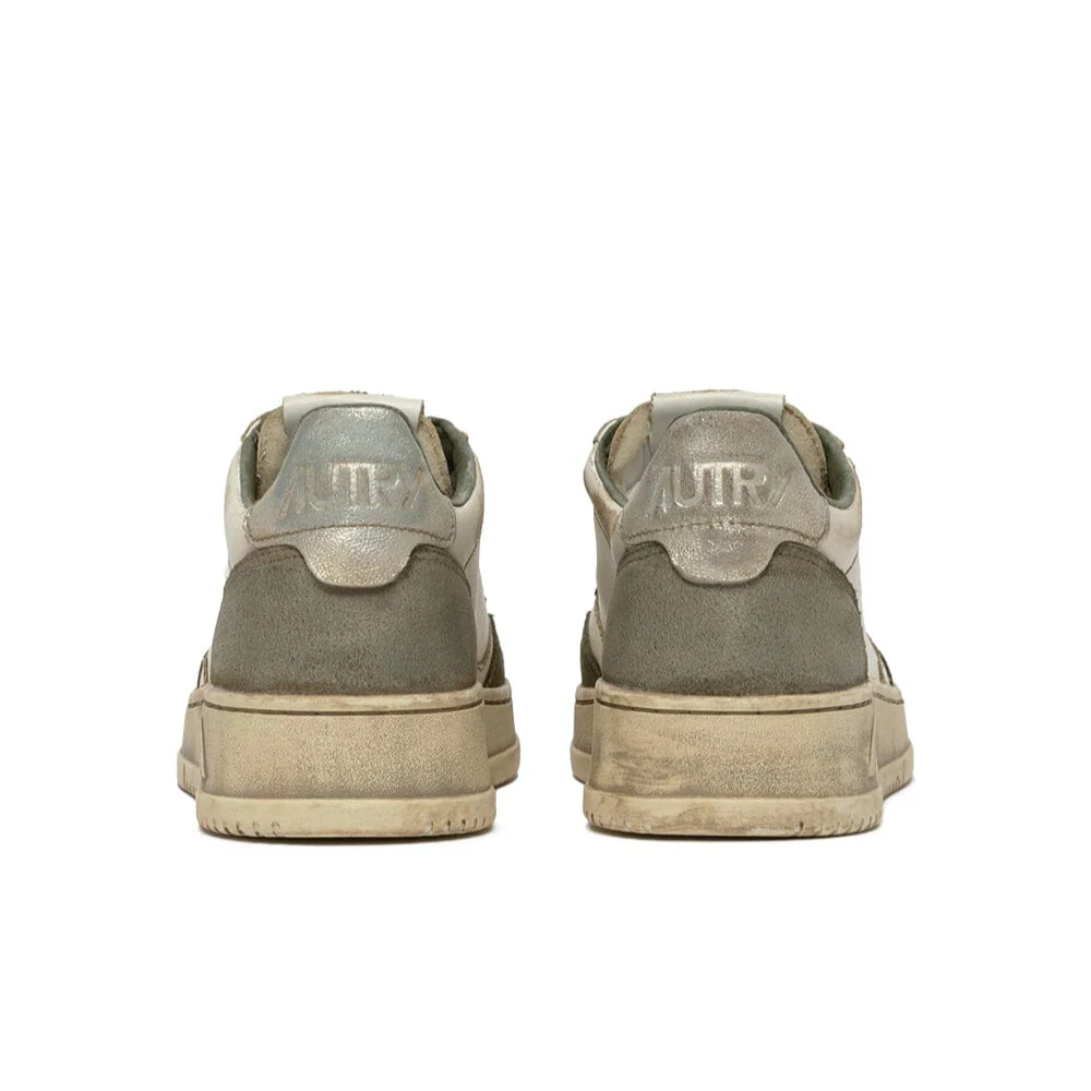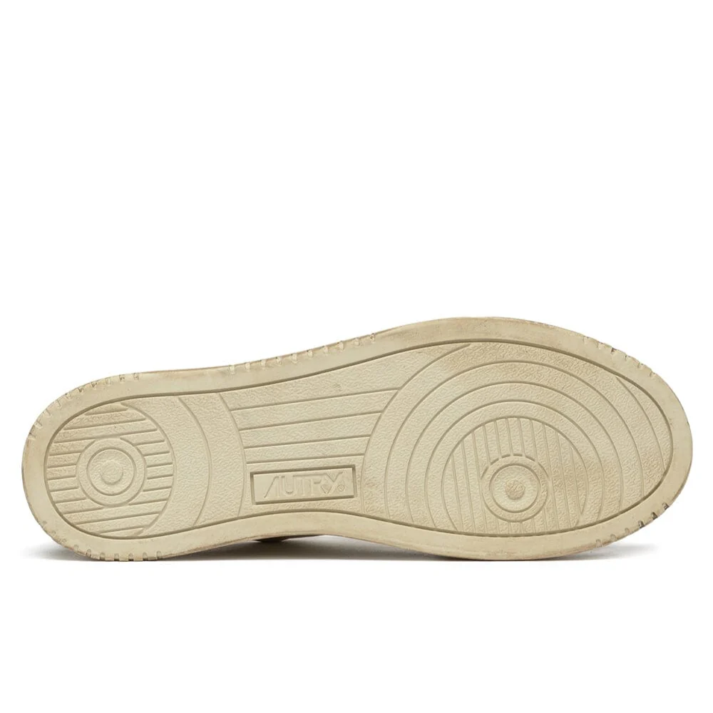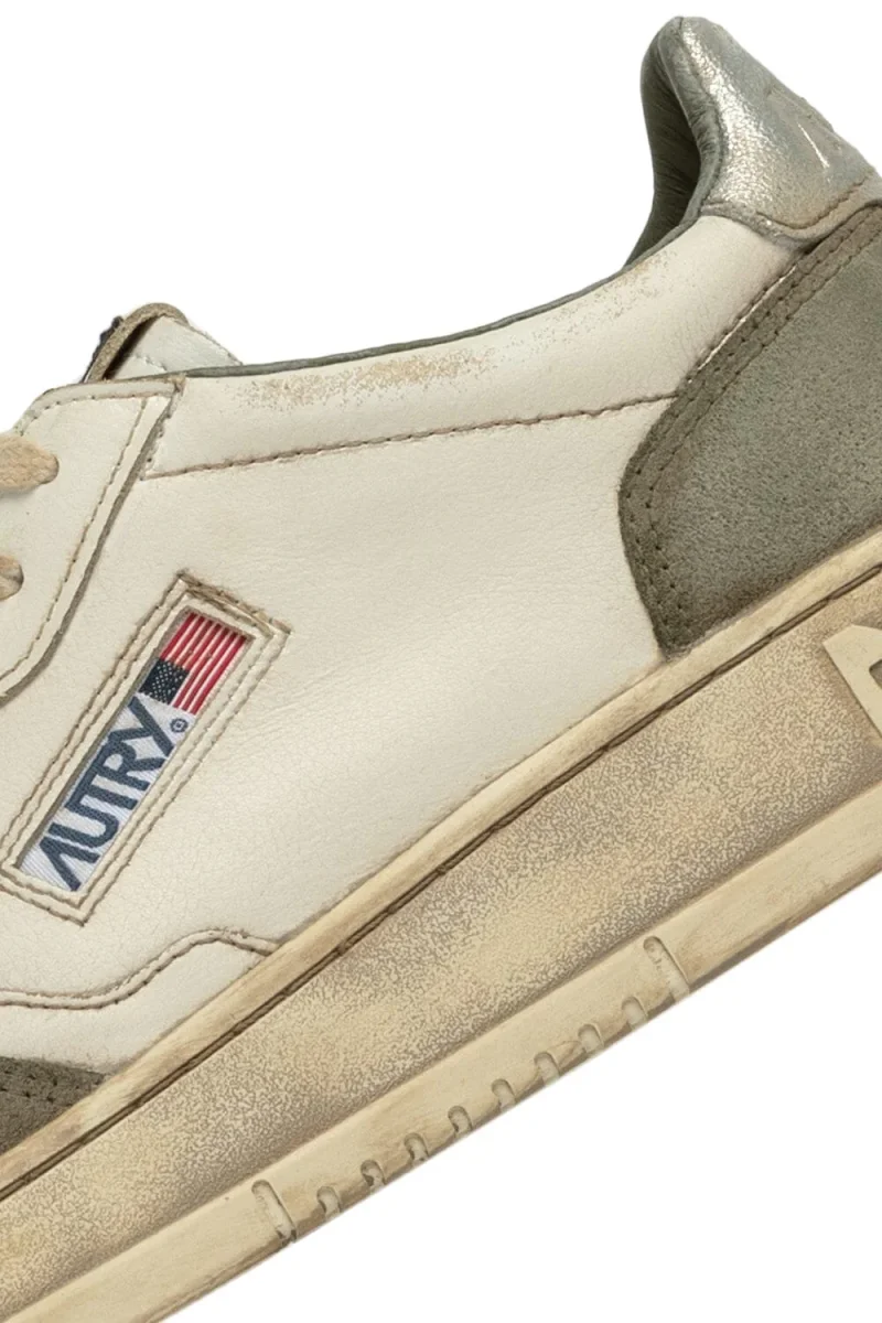 Edizione vintage della classica Medalist di Autry, realizzata in pelle di colore avorio con effetti anticati e pelle abrasivata di colore verde salvia effetto invecchiato. Applicazione di logo del marchio con bandiera americana sui lati esterni. Tallone in pelle di colore argento. Lacci in morbido cotone di colore avorio con effetto anticato. Suola in gomma con effetti anticati.