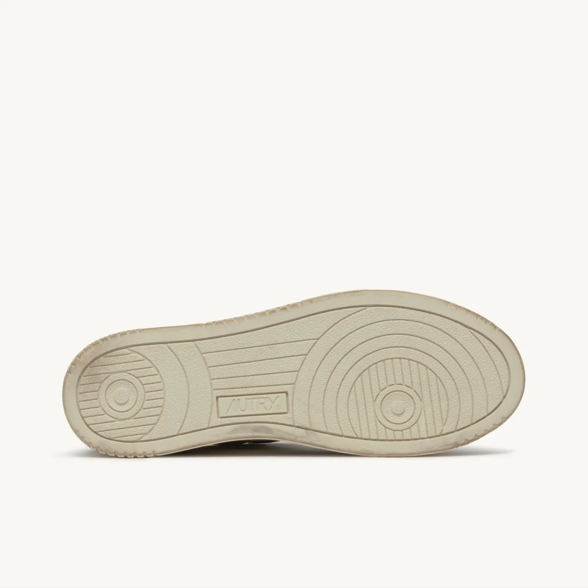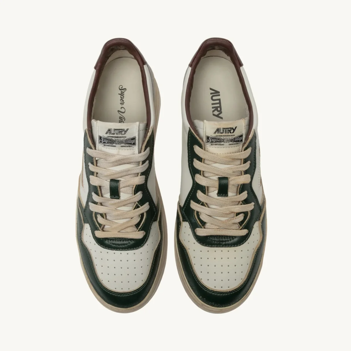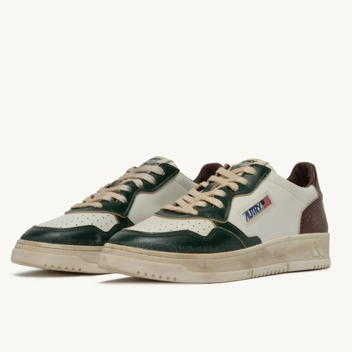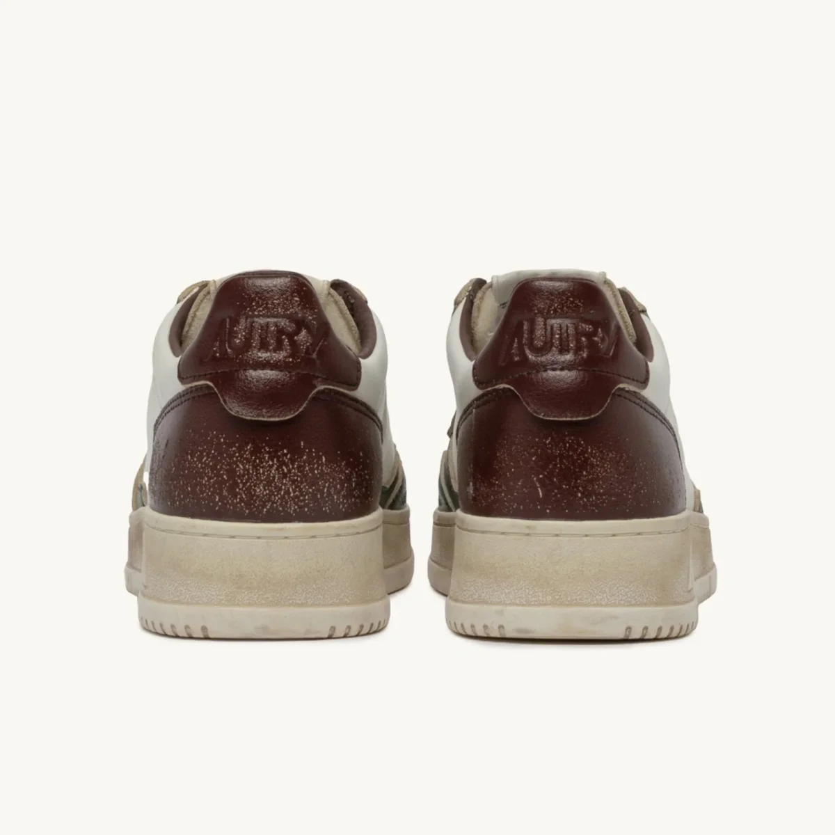Edizione vintage della classica Medalist di Autry, realizzata in pelle di colore avorio, marrone nella parte posteriore e verde nella parte anteriore ad effetto invecchiato. Applicazione di logo del marchio con bandiera americana sui lati esterni. Lacci in morbido cotone di colore avorio. Suola in gomma con effetti anticati.