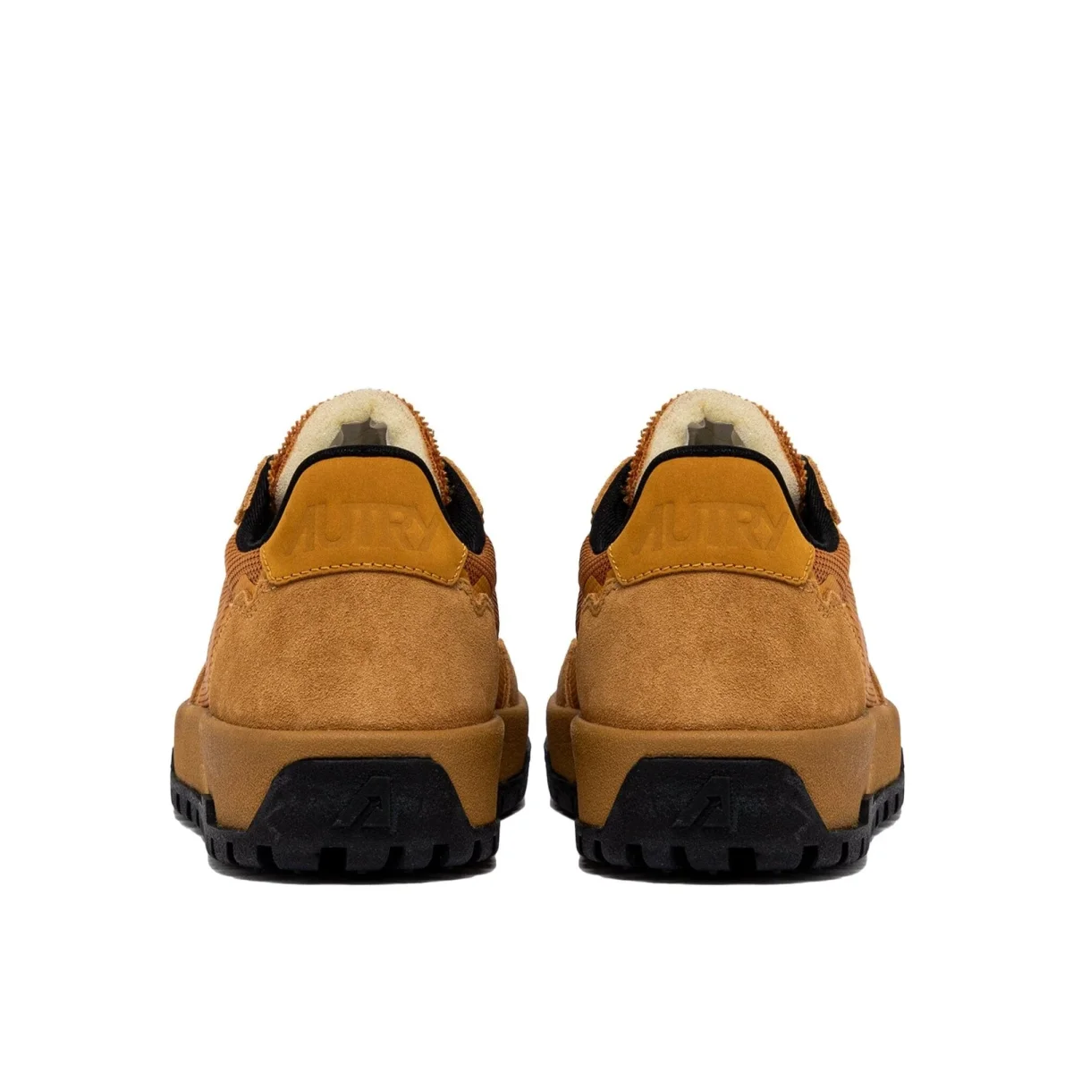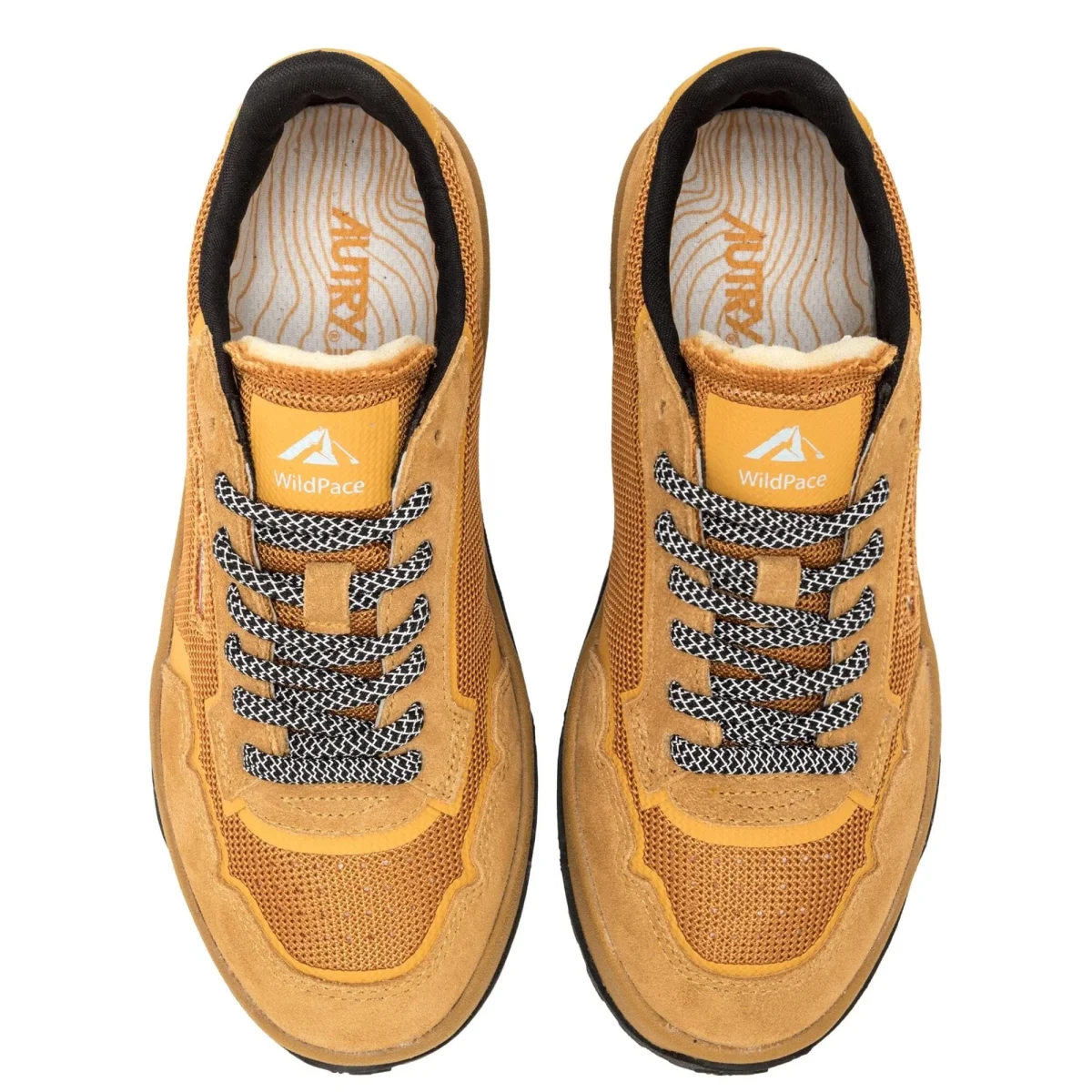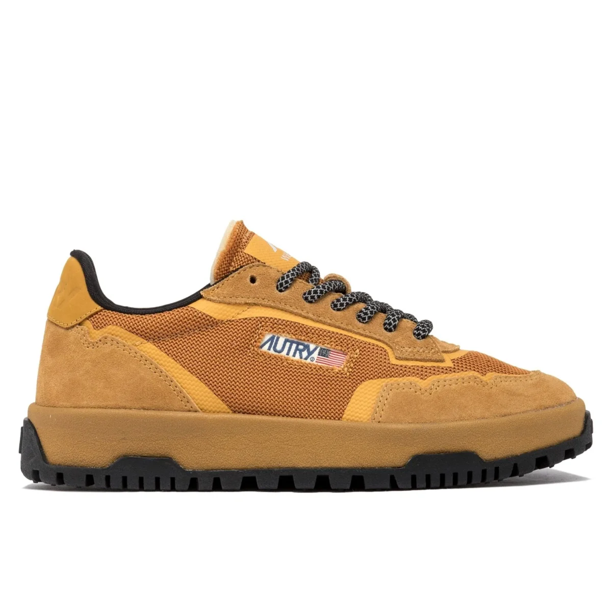 Nuova Autry modello Wildpace di ispirazione outdoor, realizzata in mesh e suede di colore giallo ocra con inserti in camoscio cuoio sul tallone. Logo del marchio con bandiera americana sui lati esterni. Suola in gomma con battistrada di colore nero. Lacci in cotone in nuance e lacci di ricambio in stile trekking di colore nero. Soletto interno in Ortholite.
