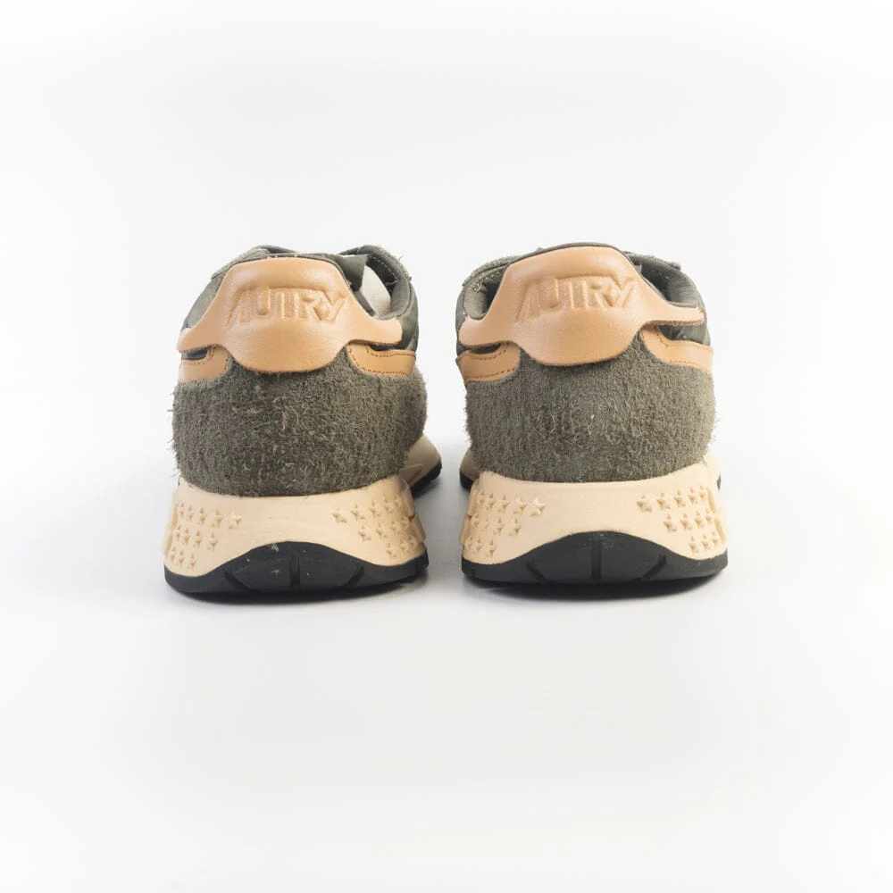 Nuova sneaker ReelWind di Autry, realizzata in camoscio, tessuto tecnico e mesh di colore khaki con dettagli in pelle di colore cuoio. Applicazione di logo del marchio con bandiera americana sui lati esterni. Lacci in cotone in nuance. Suola ultraleggera in gomma Phylon, la quale offre comfort e versatilità al tempo stesso.