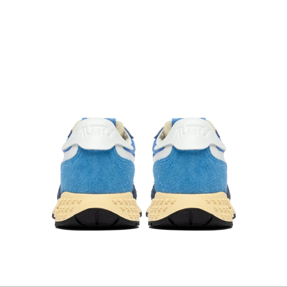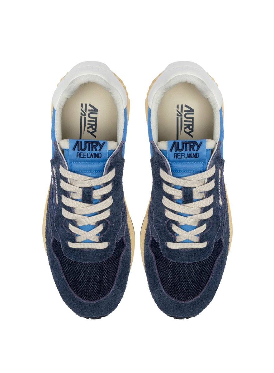 Nuove sneakers ReelWind di Autry, realizzate in camoscio di colore blu e azzurro con tessuto tecnico di colore azzurro e dettagli in mesch in blu. Applicazione di logo del marchio sui lati esterni. Lacci in cotone piatti di colore avorio. Suola ultraleggera in gomma Phylon, la quale offre comfort e versatilità al tempo stesso.