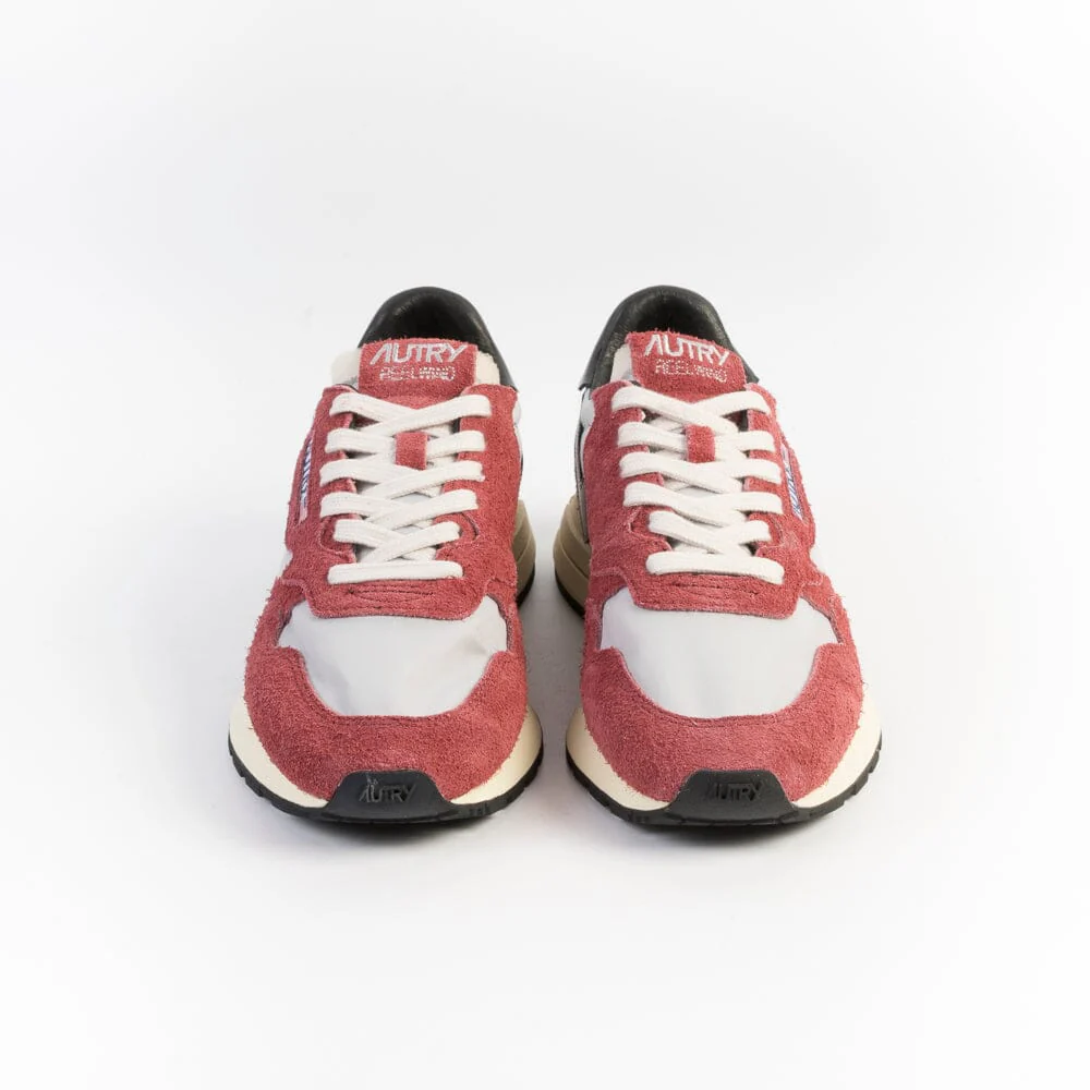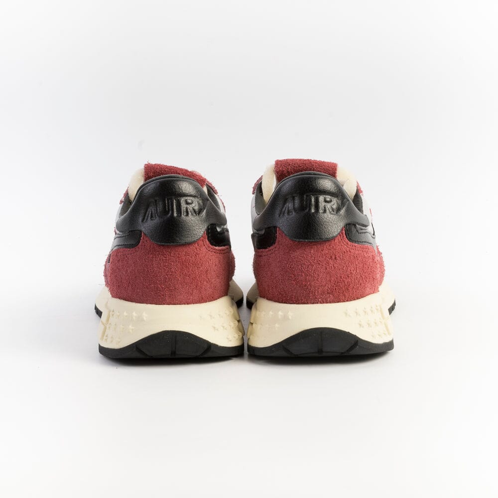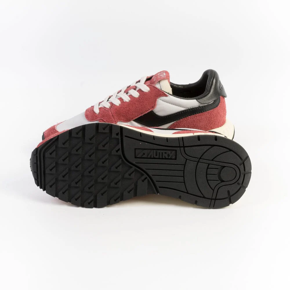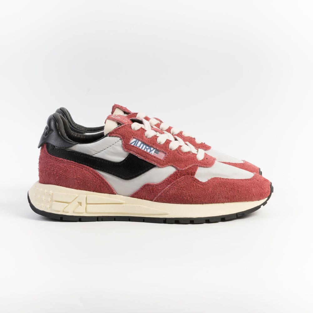 Nuova sneaker ReelWind di Autry, realizzata in camoscio di colore bordeaux e tessuto tecnico di colore grigio, con dettagli in pelle di colore nero. Applicazione di logo del marchio con bandiera americana sui lati esterni. Suola ultraleggera in gomma Phylon, la quale offre comfort e versatilità al tempo stesso. Lacci in cotone di colore bianco.