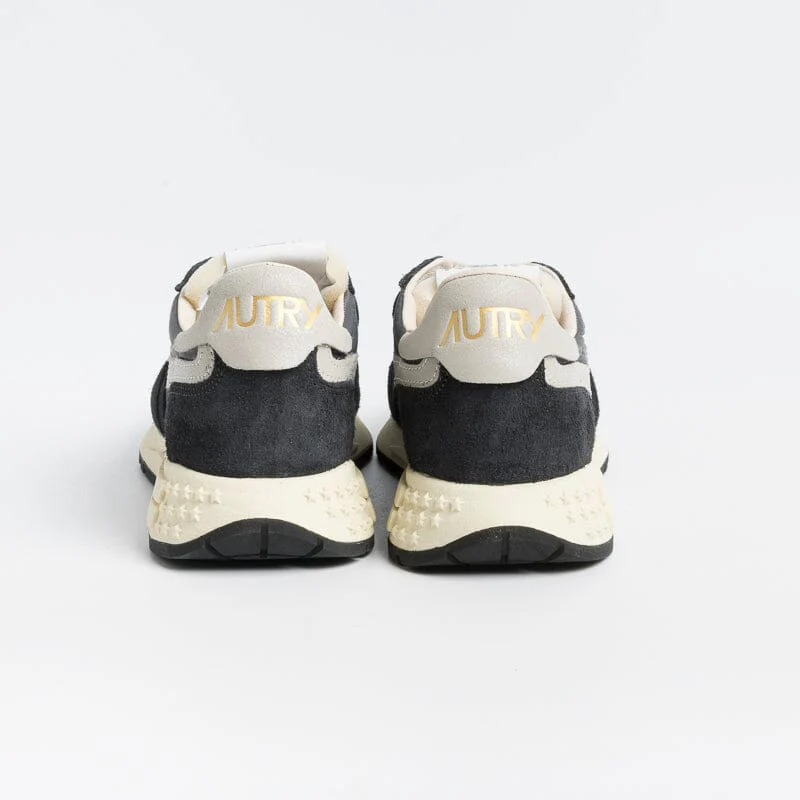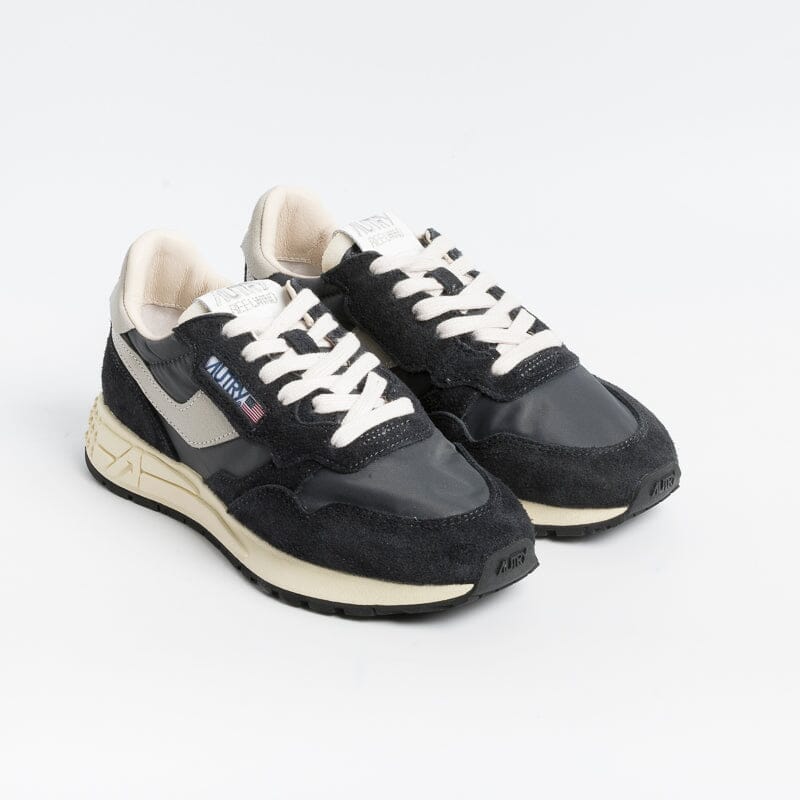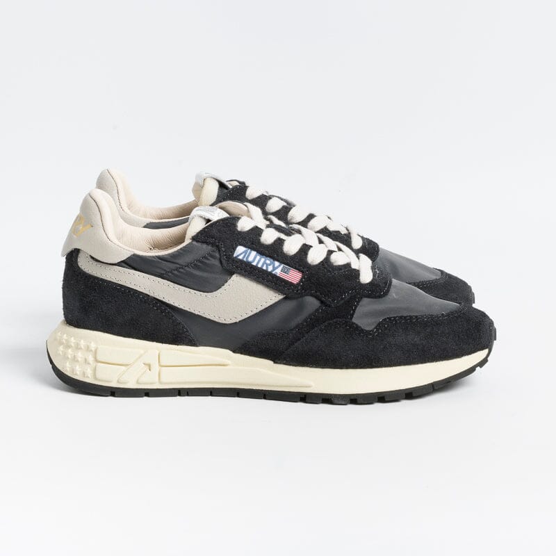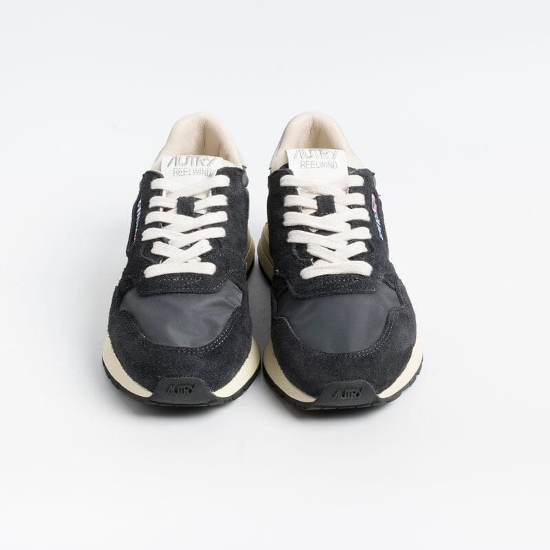 Nuova sneaker ReelWind di Autry, realizzata in camoscio e tessuto tecnico di colore nero, con dettagli in pelle craclè di colore grigio. Applicazione di logo del marchio con bandiera americana sui lati esterni. Suola ultraleggera in gomma Phylon, la quale offre comfort e versatilità al tempo stesso. Lacci in cotone di colore bianco.